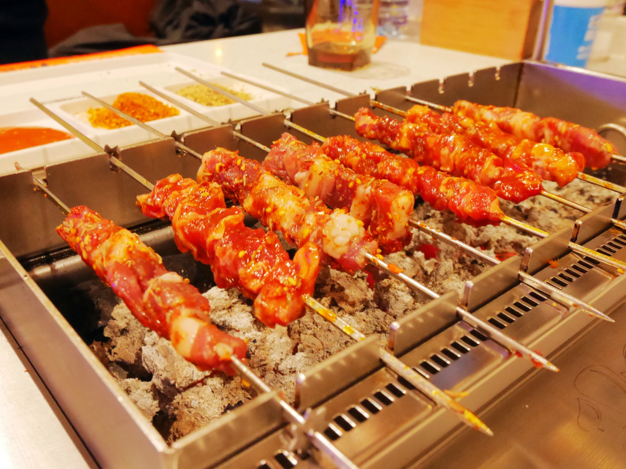 店里提供生串,味制好的,需要自己烤,不过烤盘比较特别,是电动的,有一个特制的滑道来回滚动,烤串会自动翻面,火候控制会比较均匀,不容易糊。