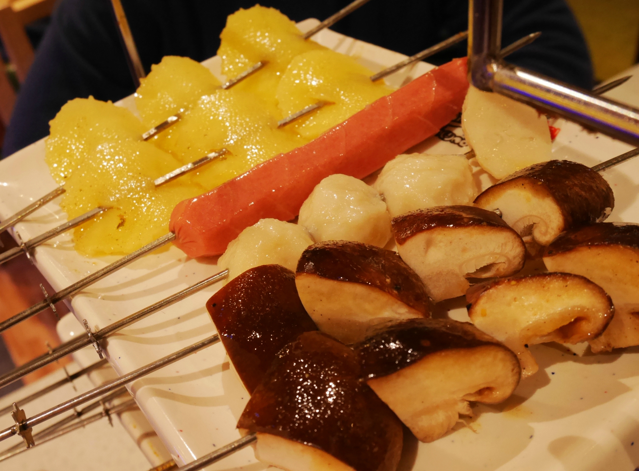 各种串品放到一个架子上,种类很多,鱼丸的话味道不好,香菇也有点一般。