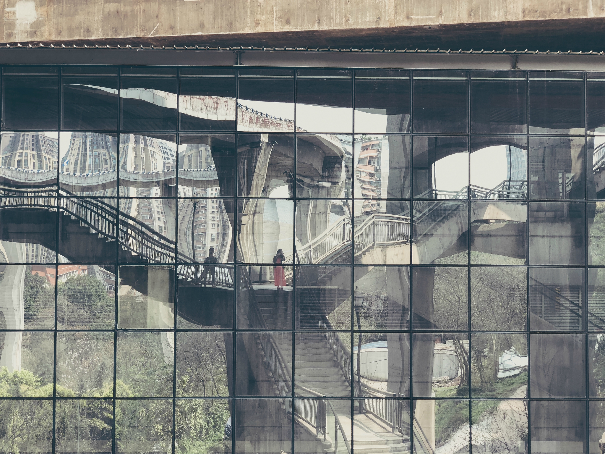 一侧是巨大的幕墙,另一侧是360°的环形公路。