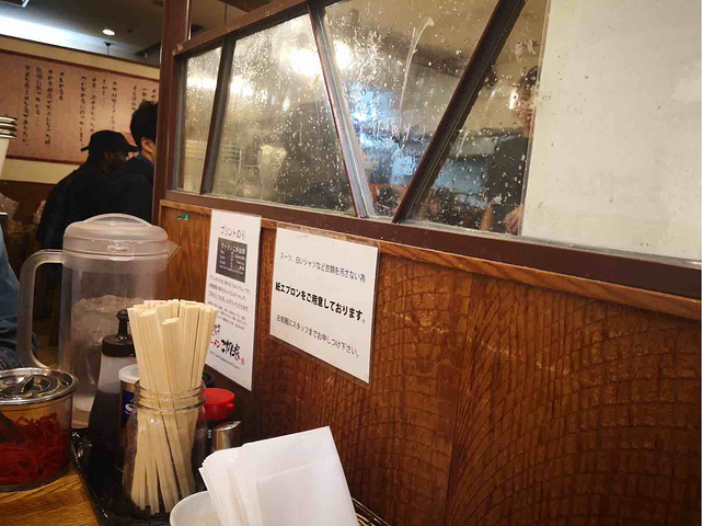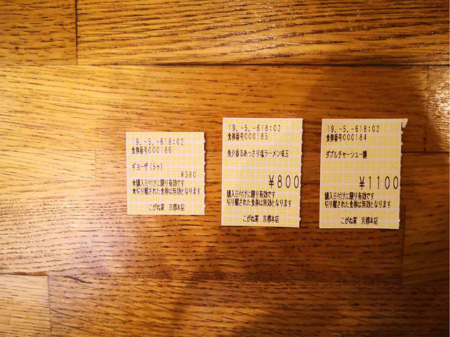 这家店在京都站南侧的唐吉柯德地下一层,位置挺好。 用餐环境比较局促,桌子比较小,店内空间不大,但用餐的人很多。 进门后有一台自助点餐机,左边用中文写着使用方法,先投钱再点餐,落座后服务员会很快上一杯冰水。 双份叉烧黑拉面是店内招牌,除了普通拉面的叉烧外,另外增加了一整块叉烧,分量挺多的,黑色的汤可能加了墨鱼汁吧,没有任何怪味。面条软硬适度,汤很咸。 豚肉拉面比较清淡,去拉面店点一碗一定不会出错,汤还是偏咸。 饺子还不错,馅的味道比较合适,蘸醋和辣油,顺便提一句辣油不如七味粉辣。