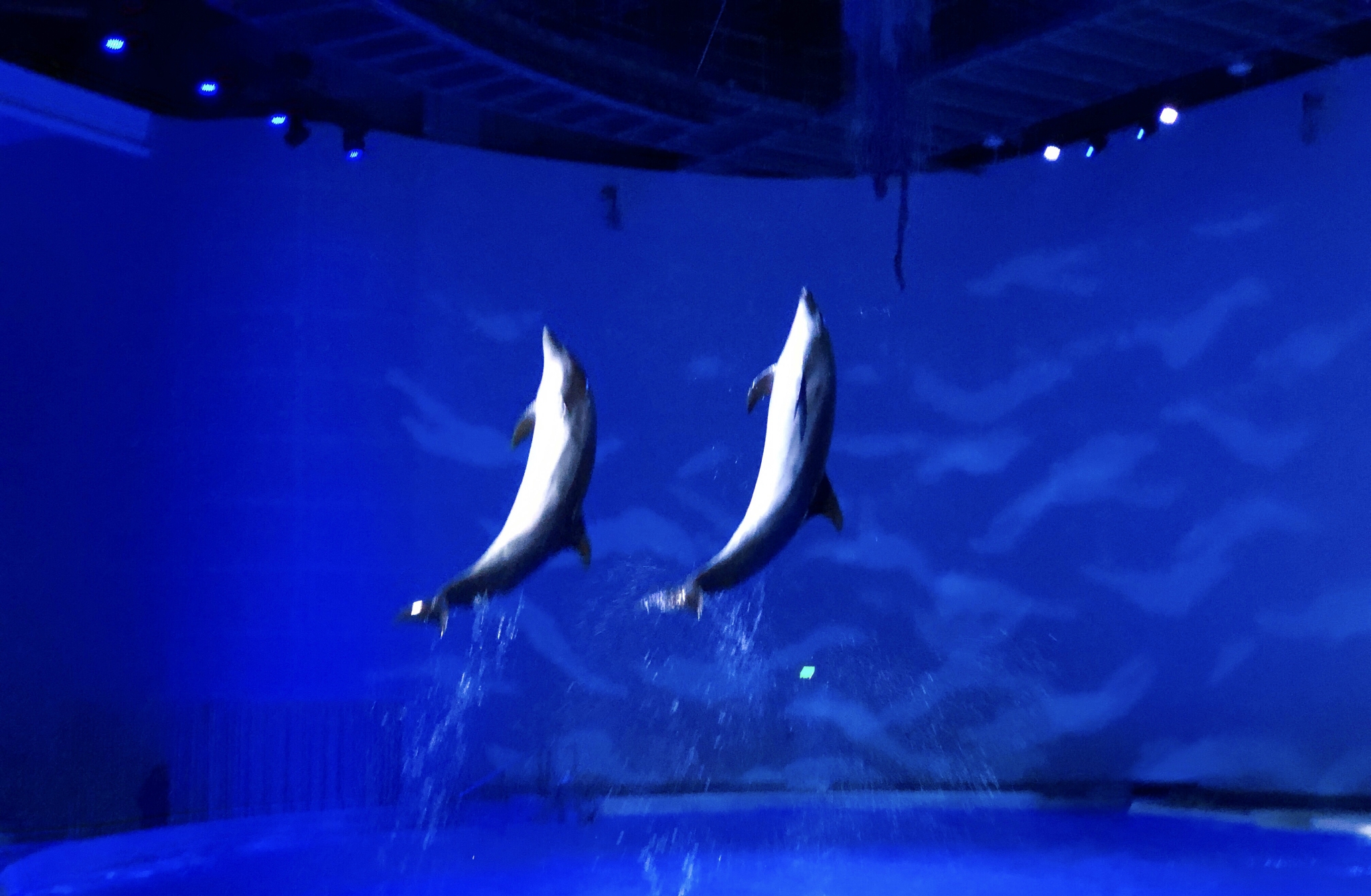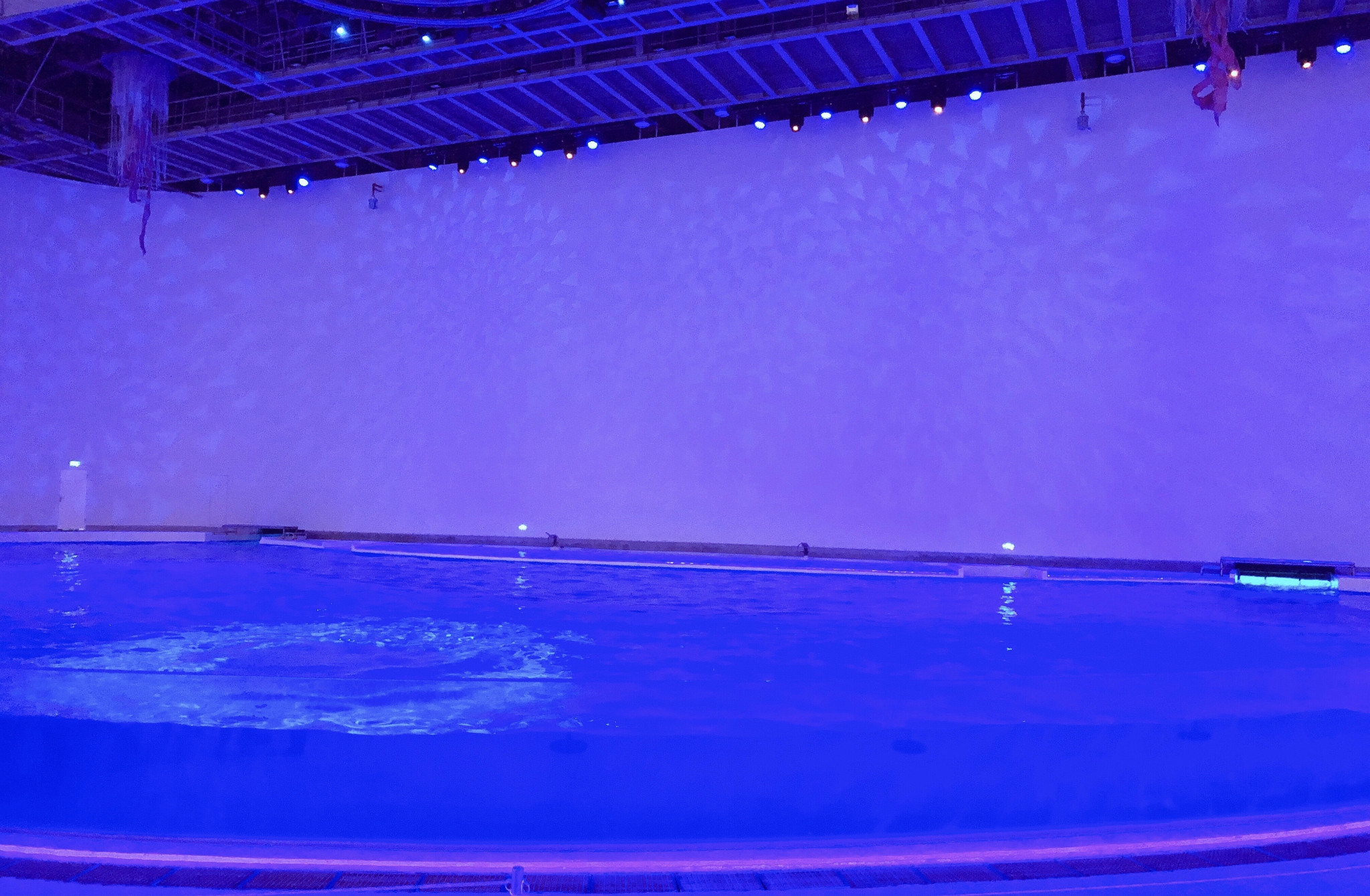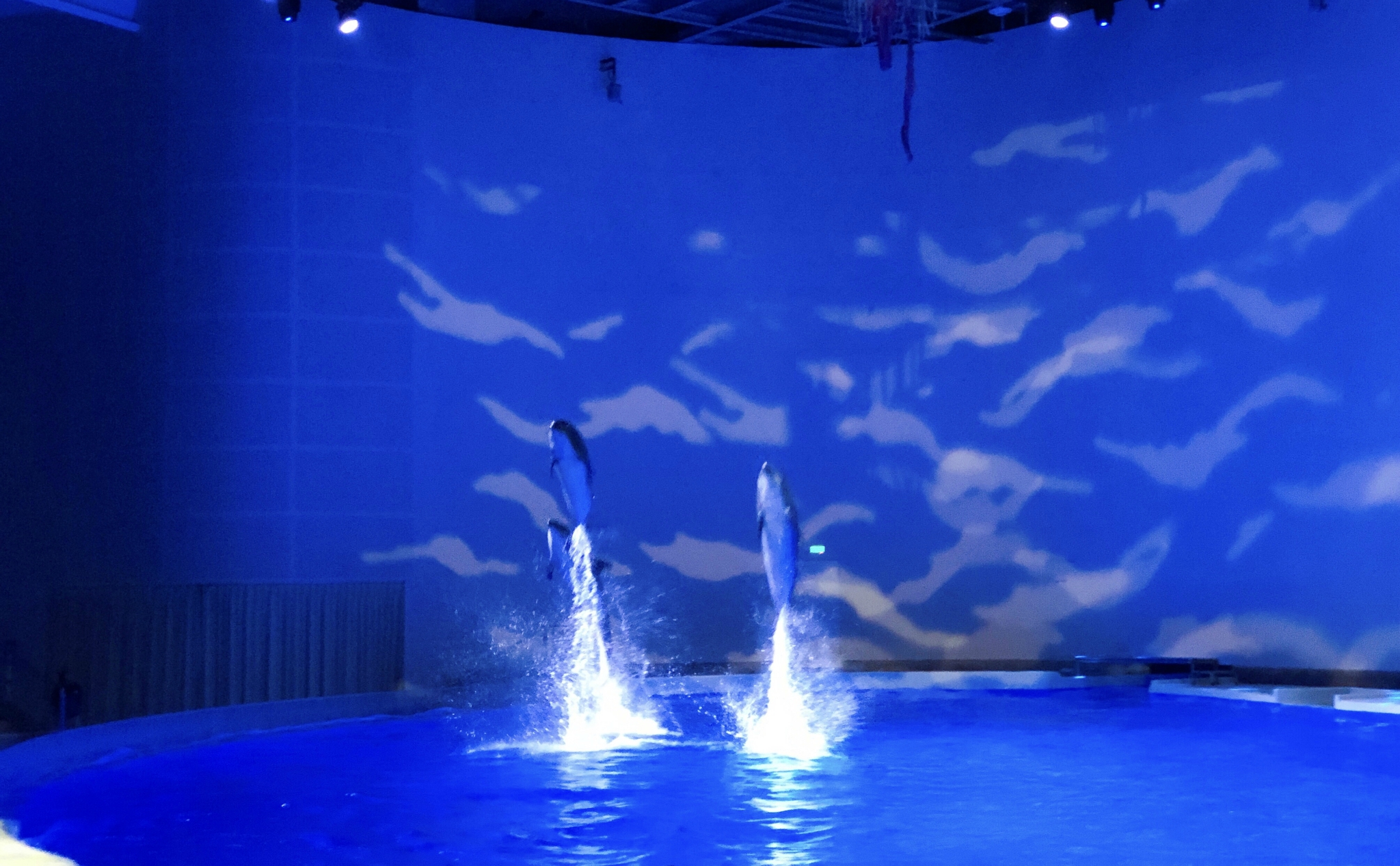 上海海昌动物园的海豚剧场位于景区的背面,紧邻火山鲸鲨馆,每天有3场海豚的表演,入园的时候需要关注海豚剧场的表演时间,建议在表演前20分钟左右进入场馆,这样才能找到一个比较好的位置。观众席分普通观众和VIP观众,VIP是需要额外付费的,观赏的角度比较好,而且和海豚互动,也是会邀请VIP座位的观众。在海豚表演之前,首先会有两位小丑演员进行表演,和观众互动,活跃下气氛。表演开始后,会有4条海豚进行表演,包括跳跃、发声、旋转、顶着驯养员前行、上岸等,在表演的时候,空中的水幕也会降水,时而出现爱心的形状,时而出现海豚的形状,让观众大呼过瘾;和观众互动环节的时候,被选中的观众需要拿去身上的首饰,以免掉入水中,万一海豚吞下去,对他们会造成严重的伤害,上台前还需要穿上防滑鞋,和海豚互动,主要是和海豚牵手和海豚亲吻,海豚表演大约为20分钟,时间还是挺长的,让观众大饱眼福。