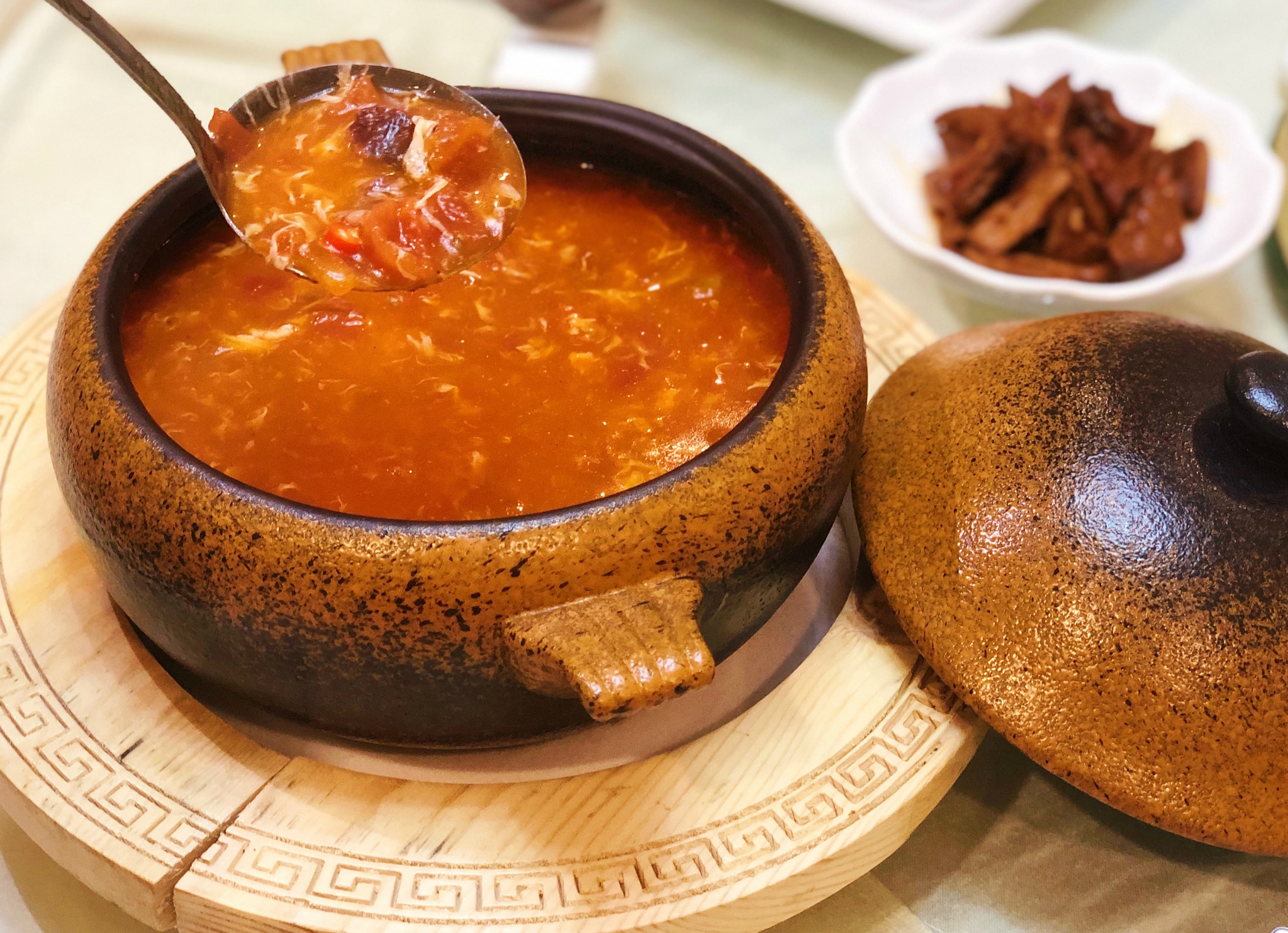 整个口感清香鲜辣,味道复合浓郁 主要由田螺酿肉,漓江虾,荷花鱼制作而成。