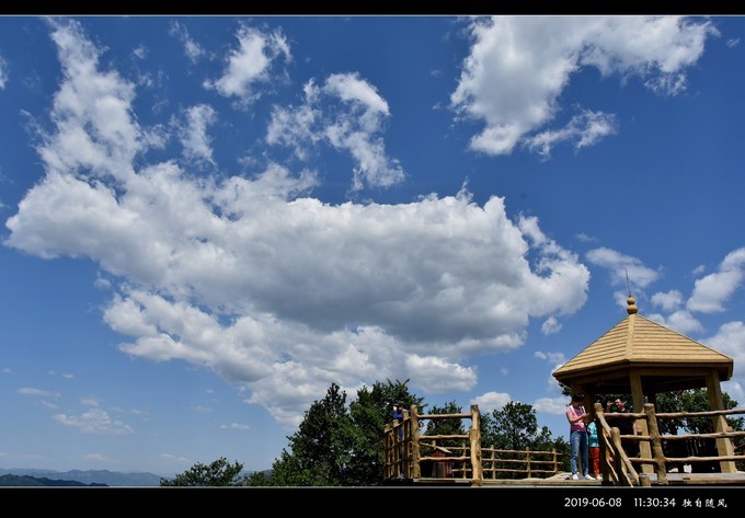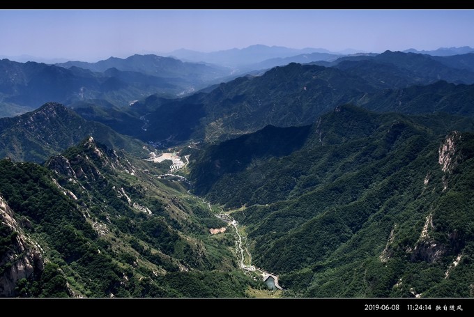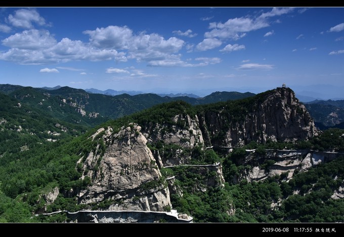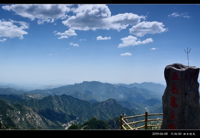 我在五岳寨主峰“小 泰山 ”顶逗留的时间很长。当天天气晴朗蓝天百云,视野开阔良好,四周山景清晰透彻一目了然。其中一侧的山顶上标志性的小亭子,一定就是我在路途中遥望的“望岳峰”,峰下悬崖栈道曲折蜿蜒,煞是惊怵。