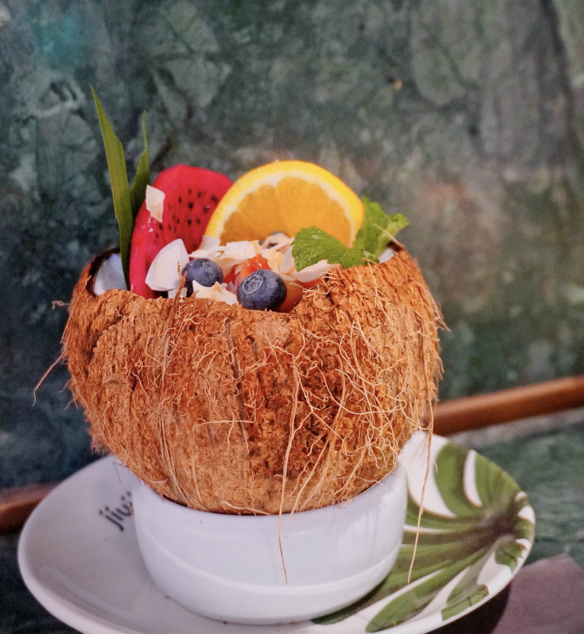 网红椰子碗必点,地下铺了一层冰沙,还有各种水果混在一起,配冬阴功火锅简直绝配。