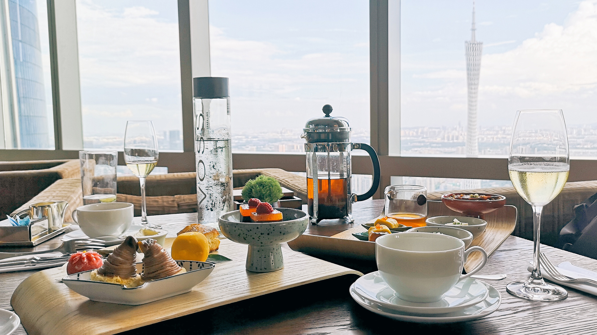 下午约了朋友在附近见面,就去了富力盈凯广场柏悦酒店65楼的悦厅Living Room喝下午茶。酒店下午茶搭配的西式甜点味道其实一般,不过胜在环境安静,景观一流,服务周到。