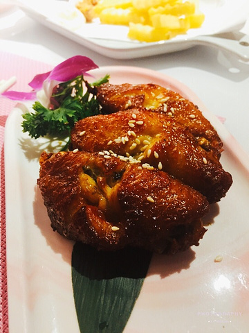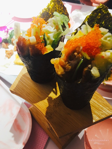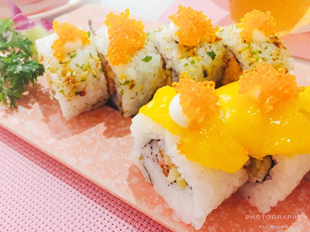一家网红餐厅,果然超粉嫩的,一进来就被粉色的花墙吸引,还有和服👘,雨伞☂️,木屐,蝴蝶结🎀等装饰物,感觉更像一个小影楼,可以随意搭配拍照,圆你的和服梦。 一家精致的日料店,位置不多,小小的挺温馨的,满满的网红元素,所以很受女生欢迎。 最爱这里的炙烧三帝盖饭 鲜虾,三文鱼🍣,蟹柳,沙拉炙烤过的刺身,吃起来鲜美可口,一份精美的主食。 清新芒果寿司卷也不错,有蟹子,沙拉,芒果结合,一口一个很满足。 大福 吃起来口感绵密,不错的甜品。 #哆啦爱美食# Tips 【餐厅名称】乐云棚网红料理 【餐厅地址】镇邦路47号 【所属菜系】日料 【人均价格】60+ 【特色美食】炙烧三帝盖饭