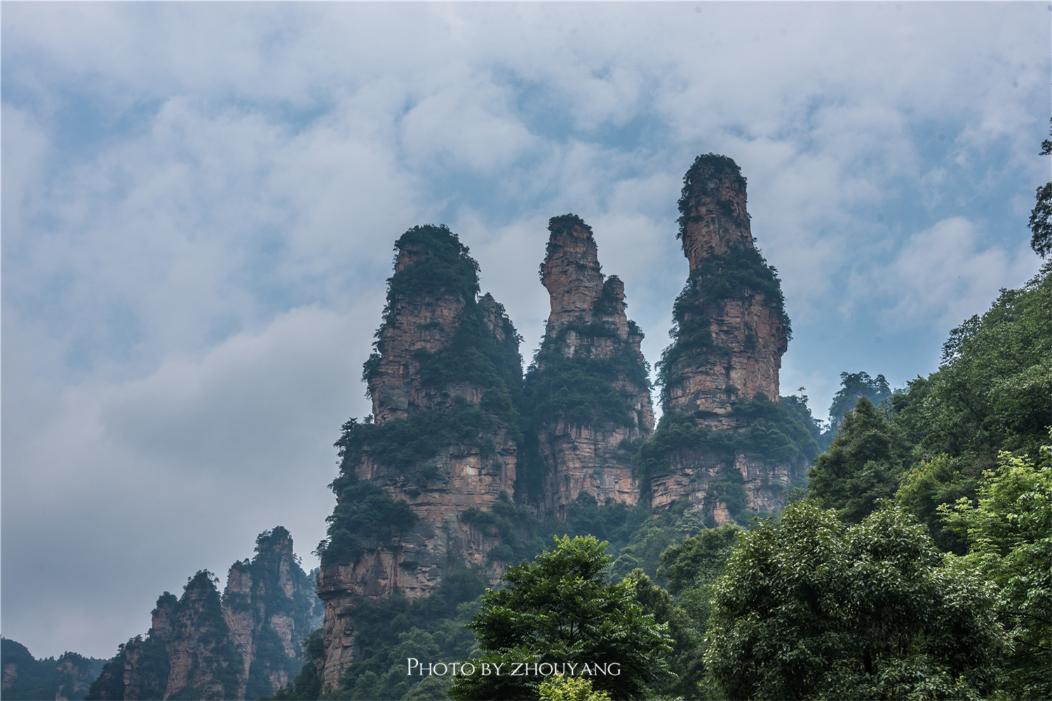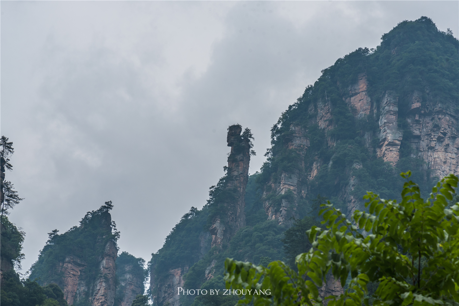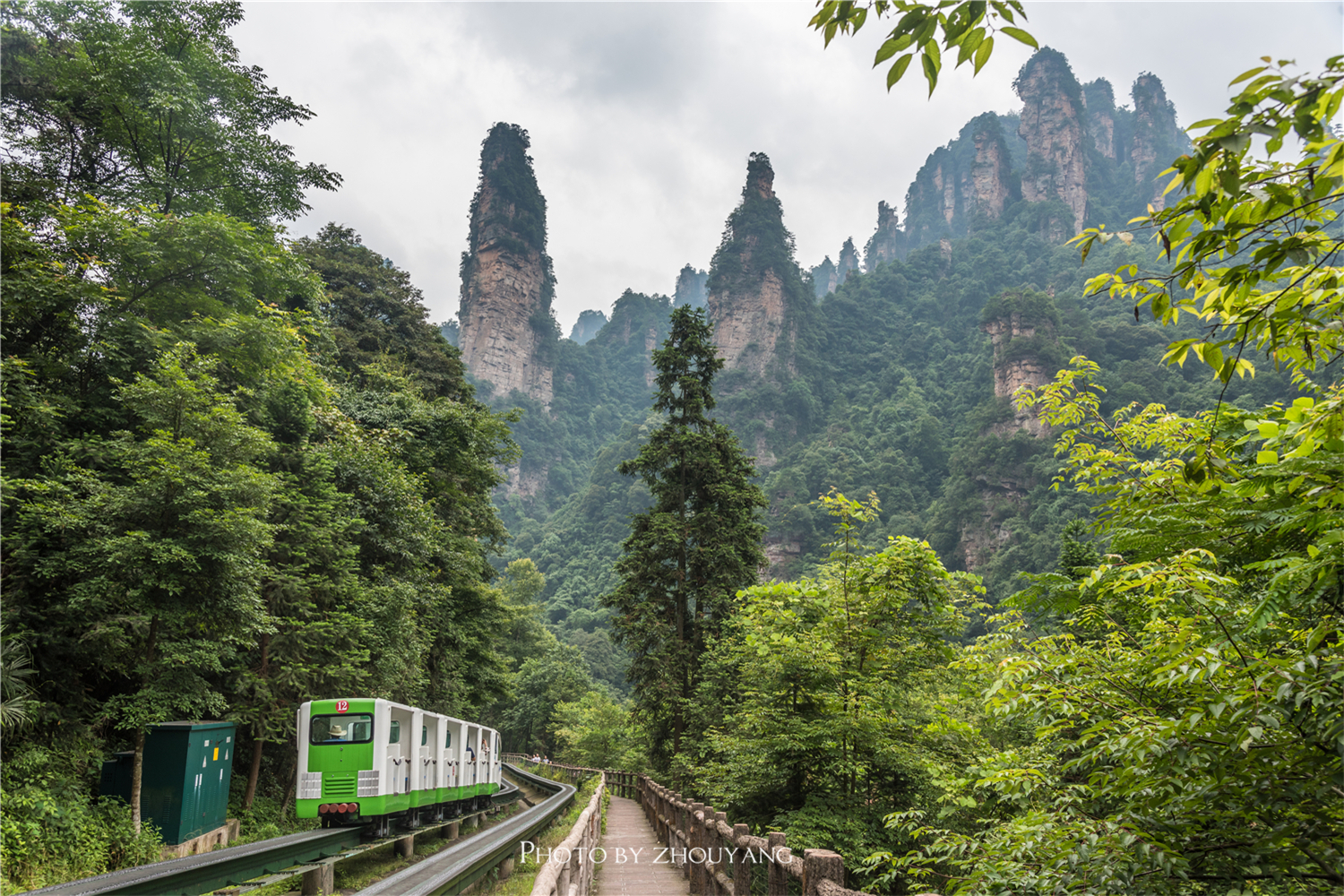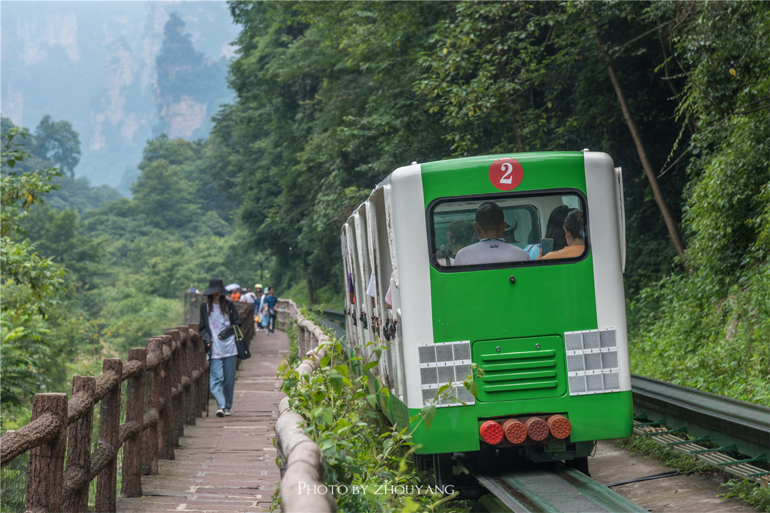 身边的小火车不时的从身边驶过,在这样的狭窄的道路两旁的确很有趣味。很快便走到了十里画廊的终点站,在终点站我们可以看到十里画廊最著名的地标三女峰,三座山峰高耸入天,形如美女,婷婷玉立。