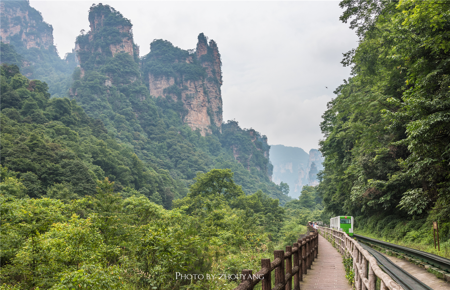 游览车停靠的第一站便是十里画廊。十里画廊位于索溪峪景区,游人可以选择乘坐山间小火车,也可以徒步游览这山谷之美。我选择徒步进,小火车出。