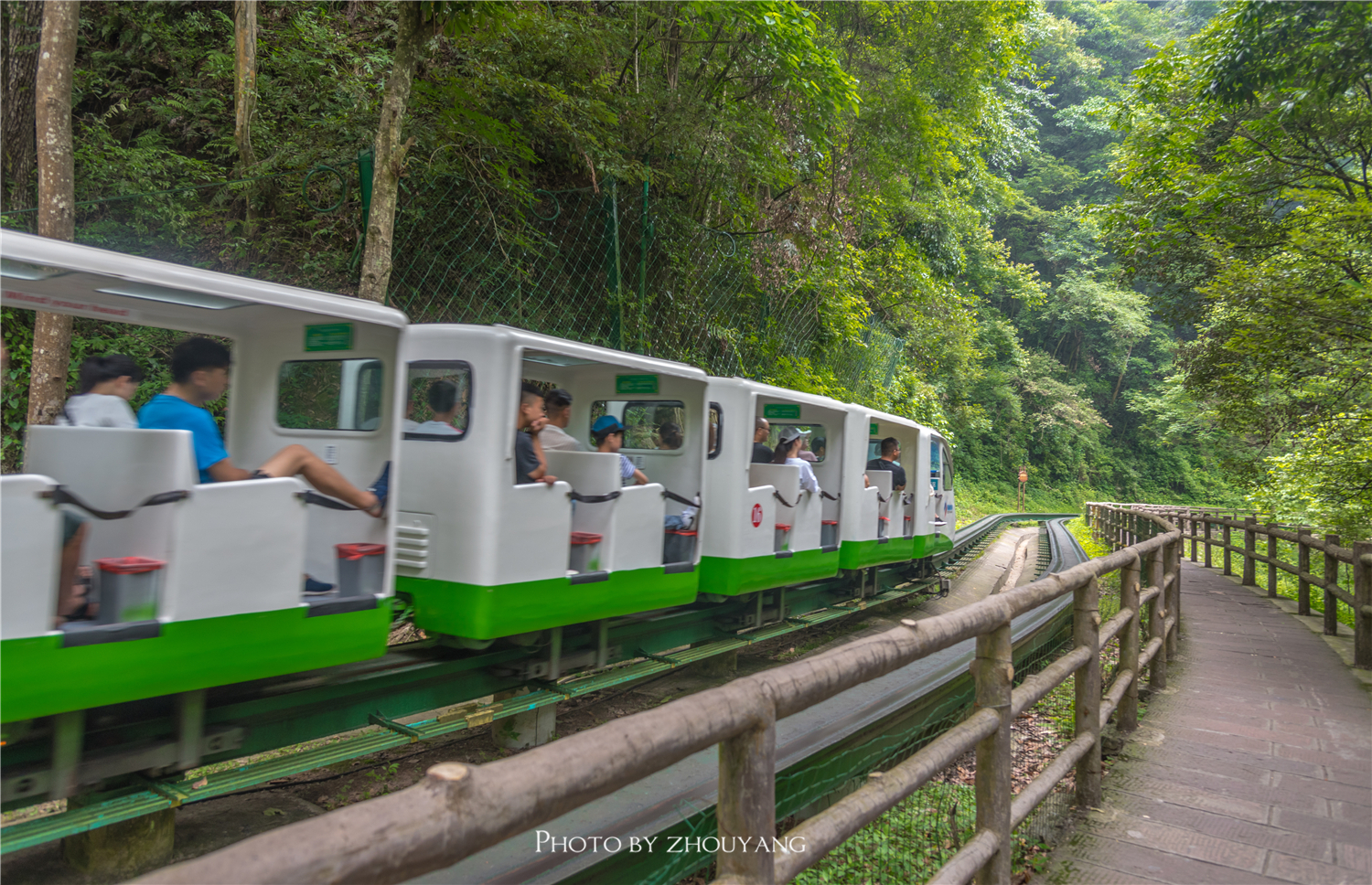 十里画廊长约五公里,步行至末端需要40-60分钟,徒步的步道狭窄,只够两个人并排而行,还好十里画廊的游人不多,绿植茂盛,基本都是在绿荫之下行走,而步道的右手边是小火车的轨道,右手边便是奇峰异石,这也给徒步带来一些乐趣。