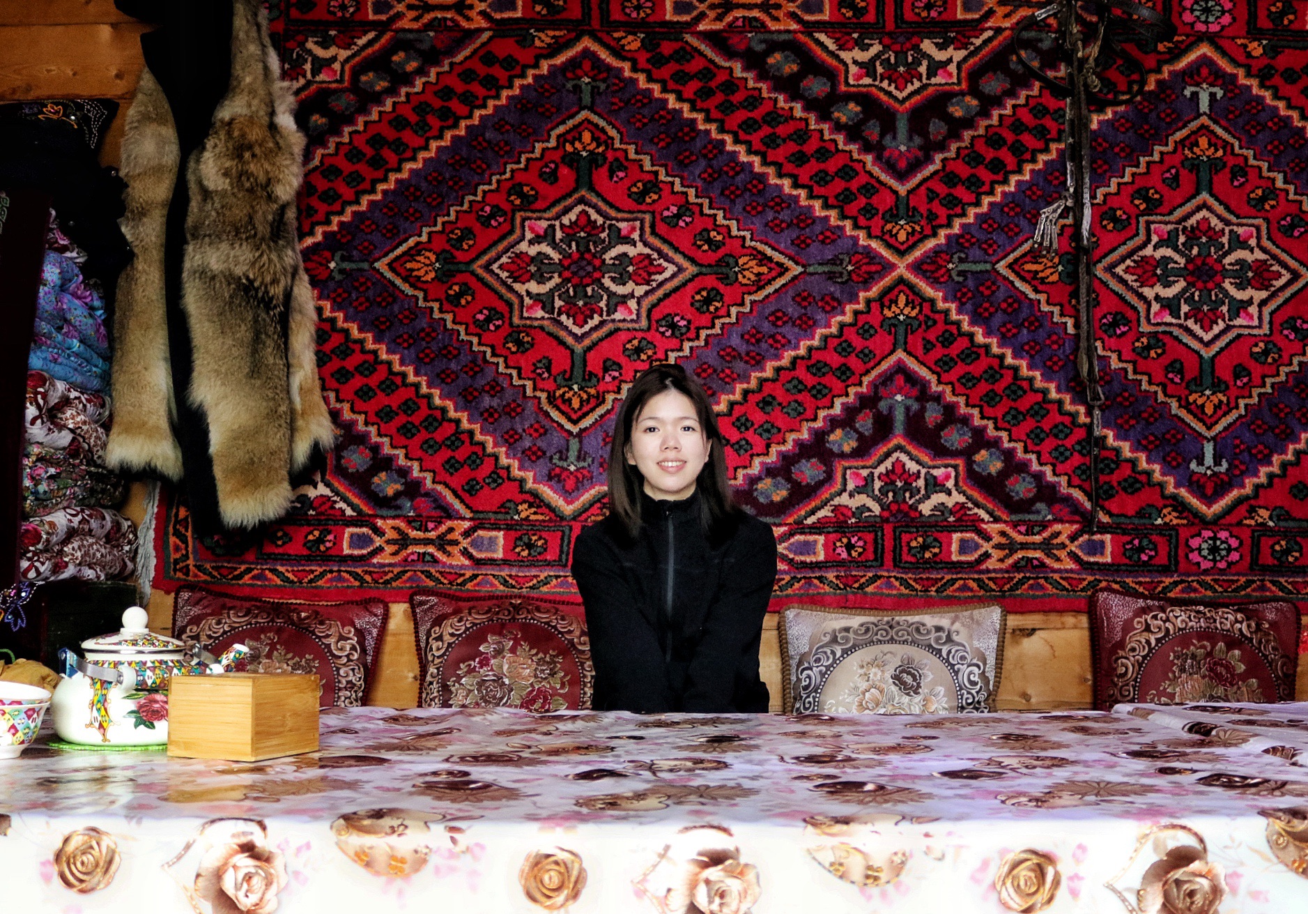 旅馆的餐厅里面,外面太冷了,里面好温暖