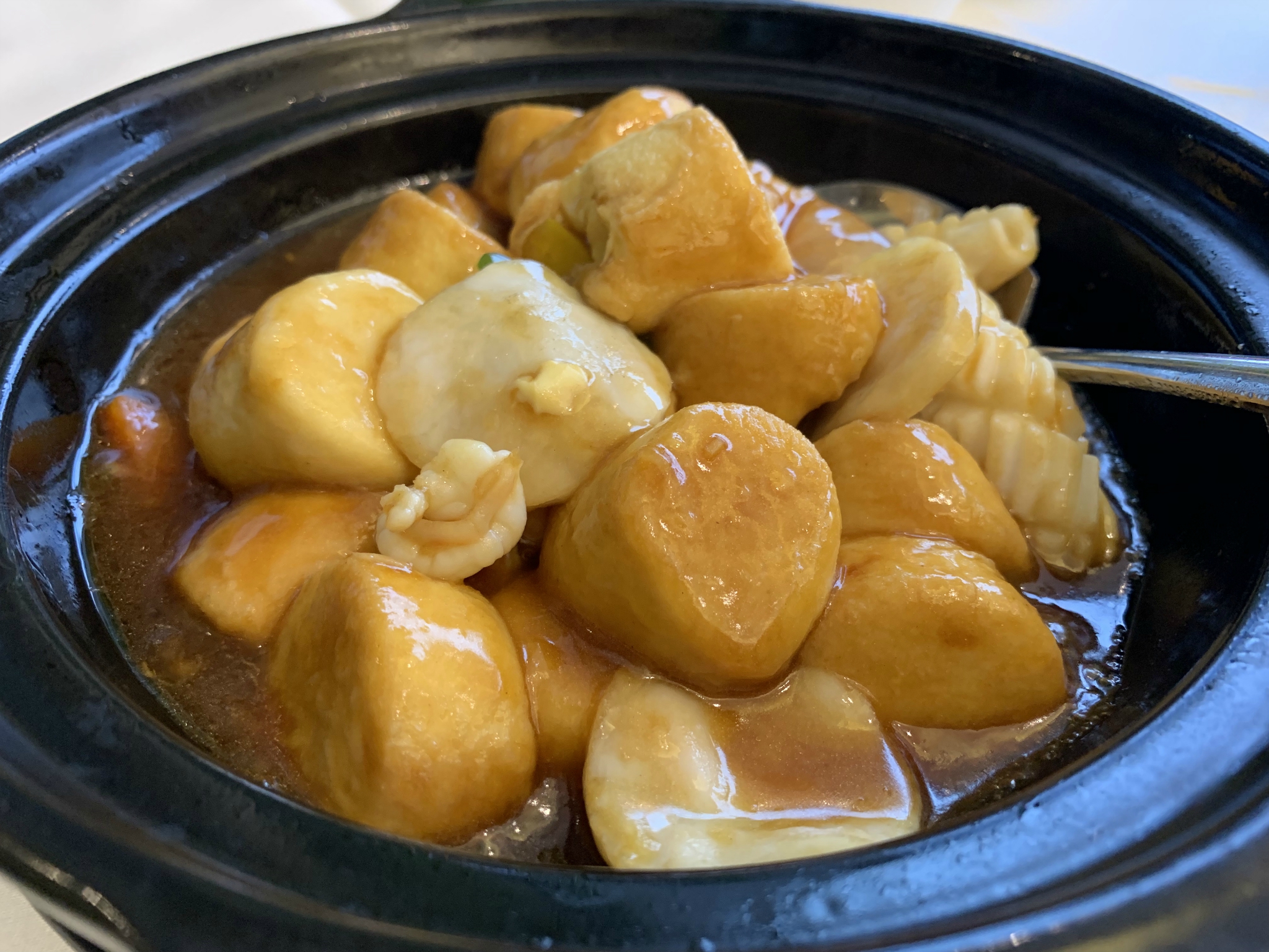 【海鲜玉子滑豆腐】难得没有碱水味的日本豆腐,但是汤底偏咸,豆腐还是挺嫩,海鲜不多,一点虾和鱿鱼,好大一煲。