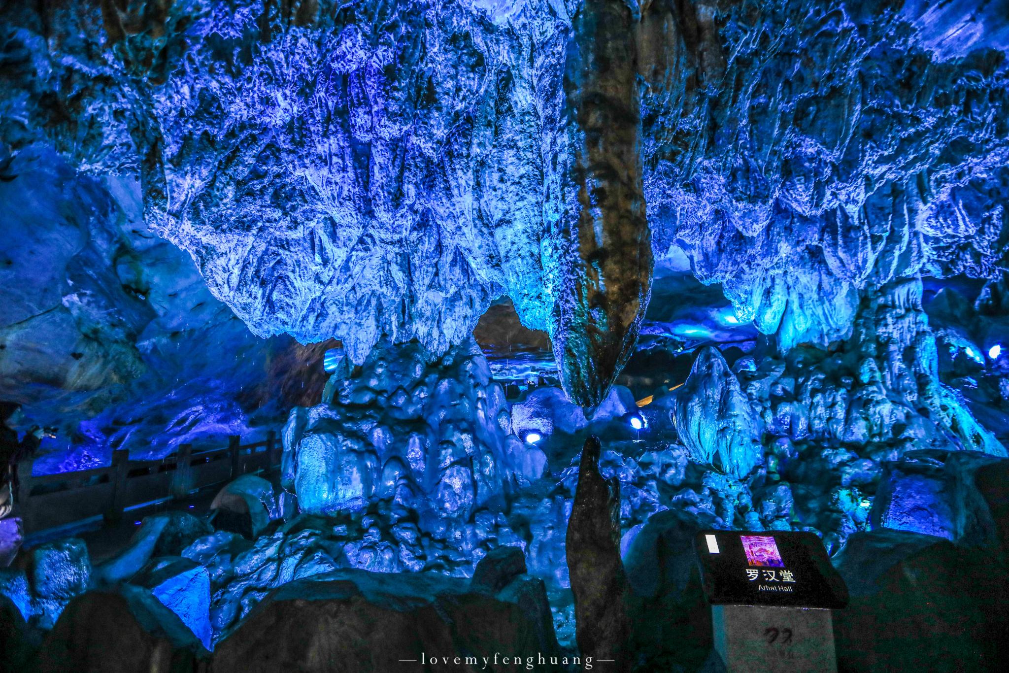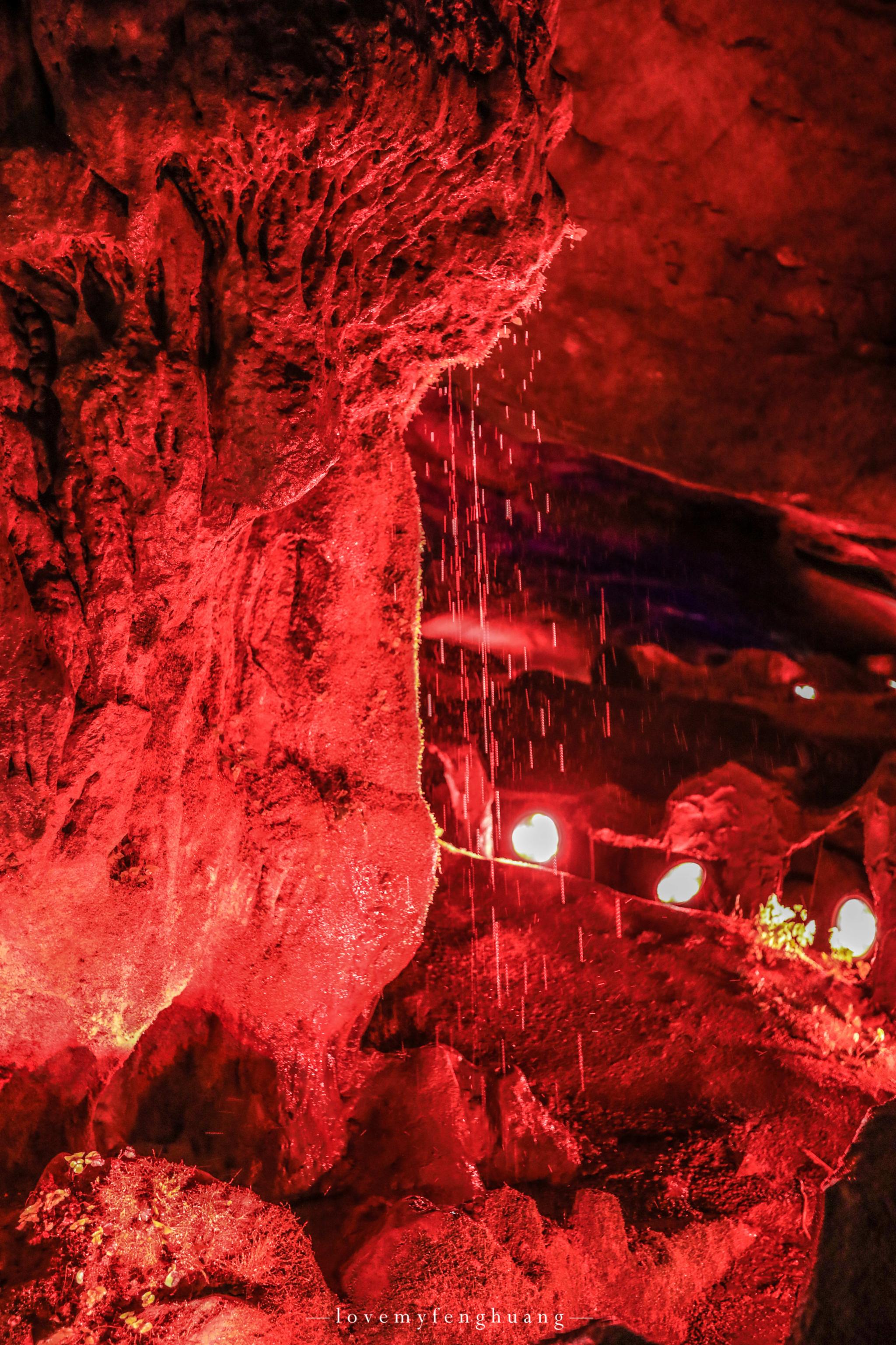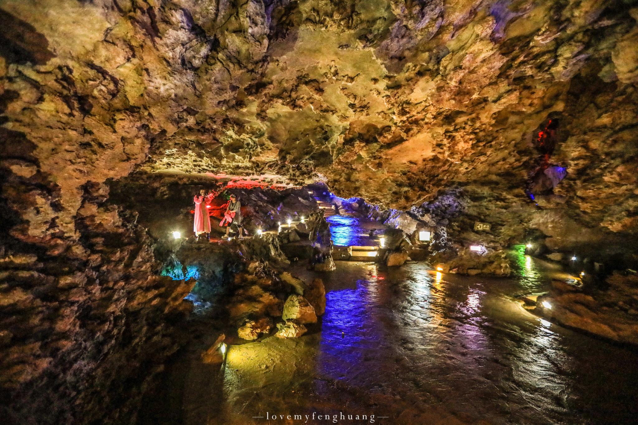 罗汉堂、仙人帐、将军腿、倒挂蝙蝠、海龟探海…….层层叠叠,五彩斑斓的色彩,一条条,一幢幢,形态或锋利、或圆滑,有的火红似火,有的翡翠如玉,倒影在清澈见底的地下河之中,这清晰可见的倒影,恍若从水中也生出了一模一样的钟乳石,如梦如幻。