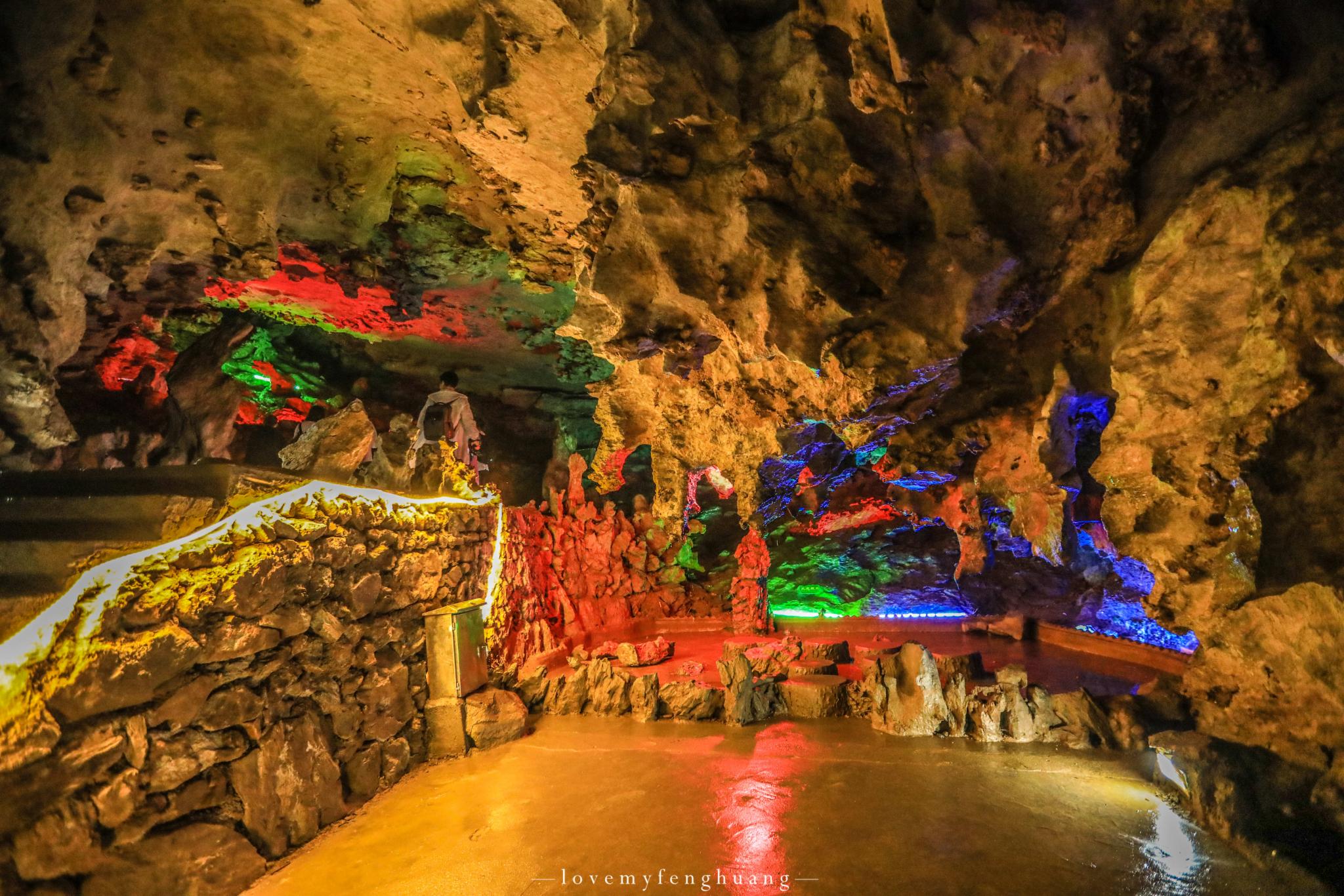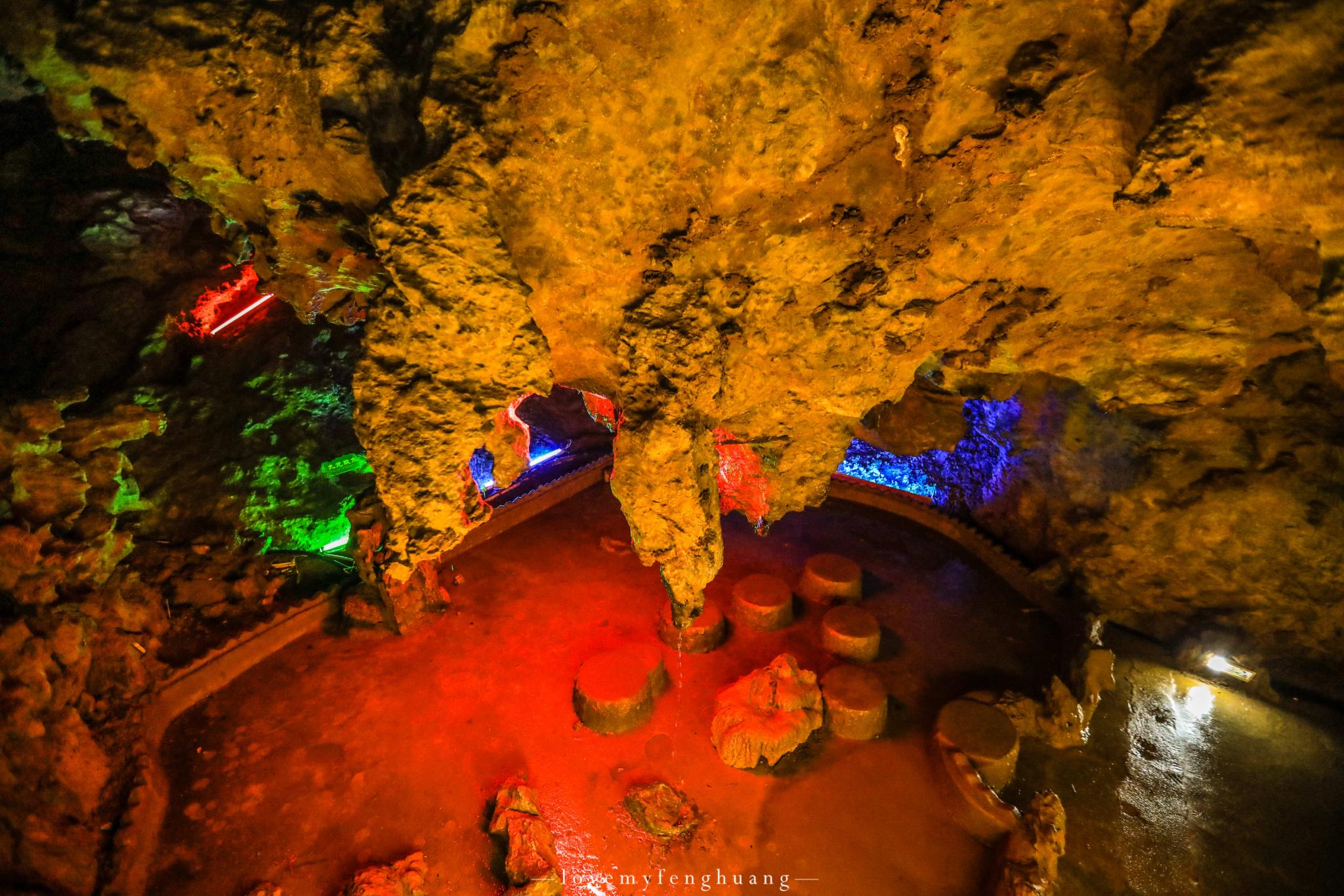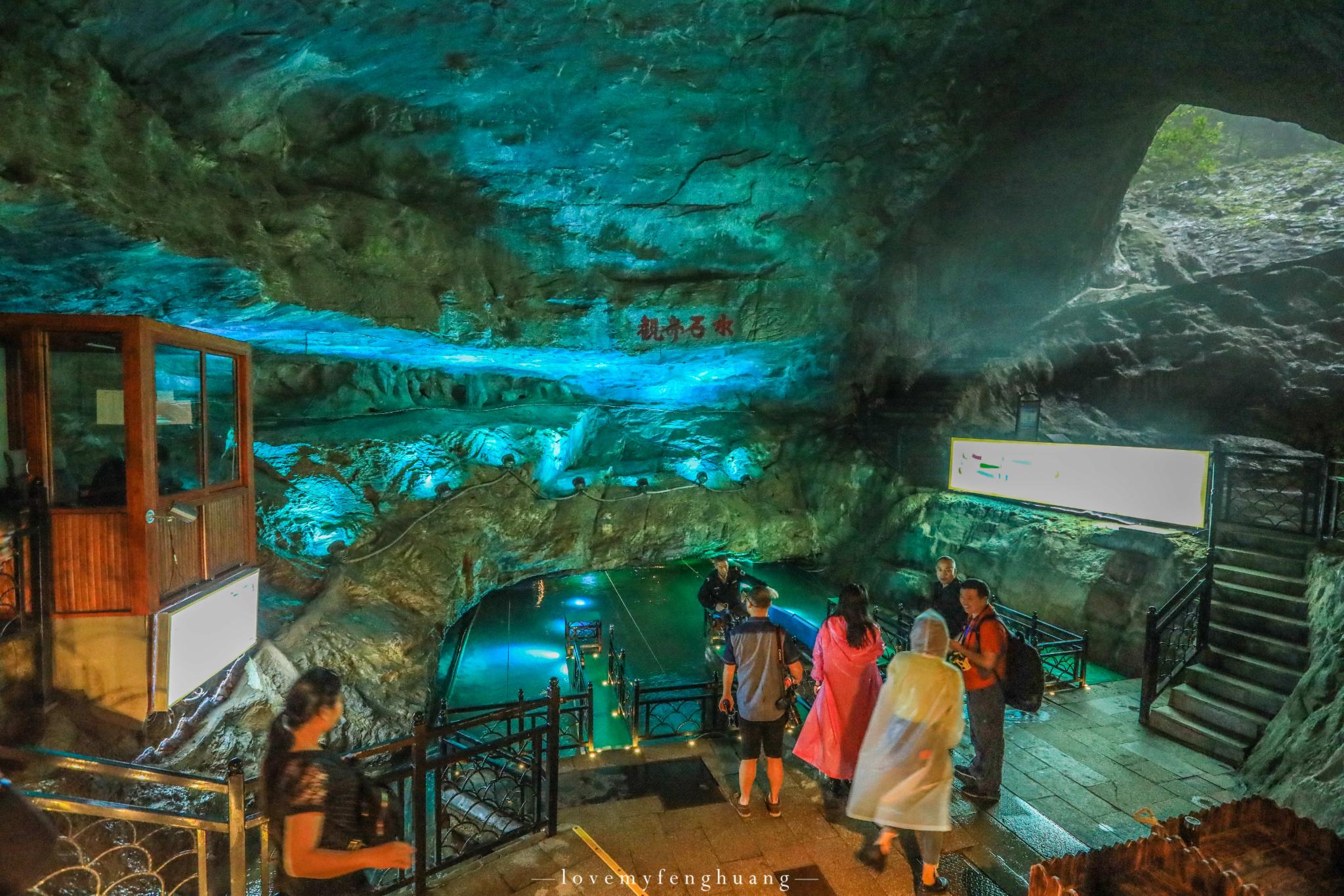 罗汉堂、仙人帐、将军腿、倒挂蝙蝠、海龟探海…….层层叠叠,五彩斑斓的色彩,一条条,一幢幢,形态或锋利、或圆滑,有的火红似火,有的翡翠如玉,倒影在清澈见底的地下河之中,这清晰可见的倒影,恍若从水中也生出了一模一样的钟乳石,如梦如幻。
