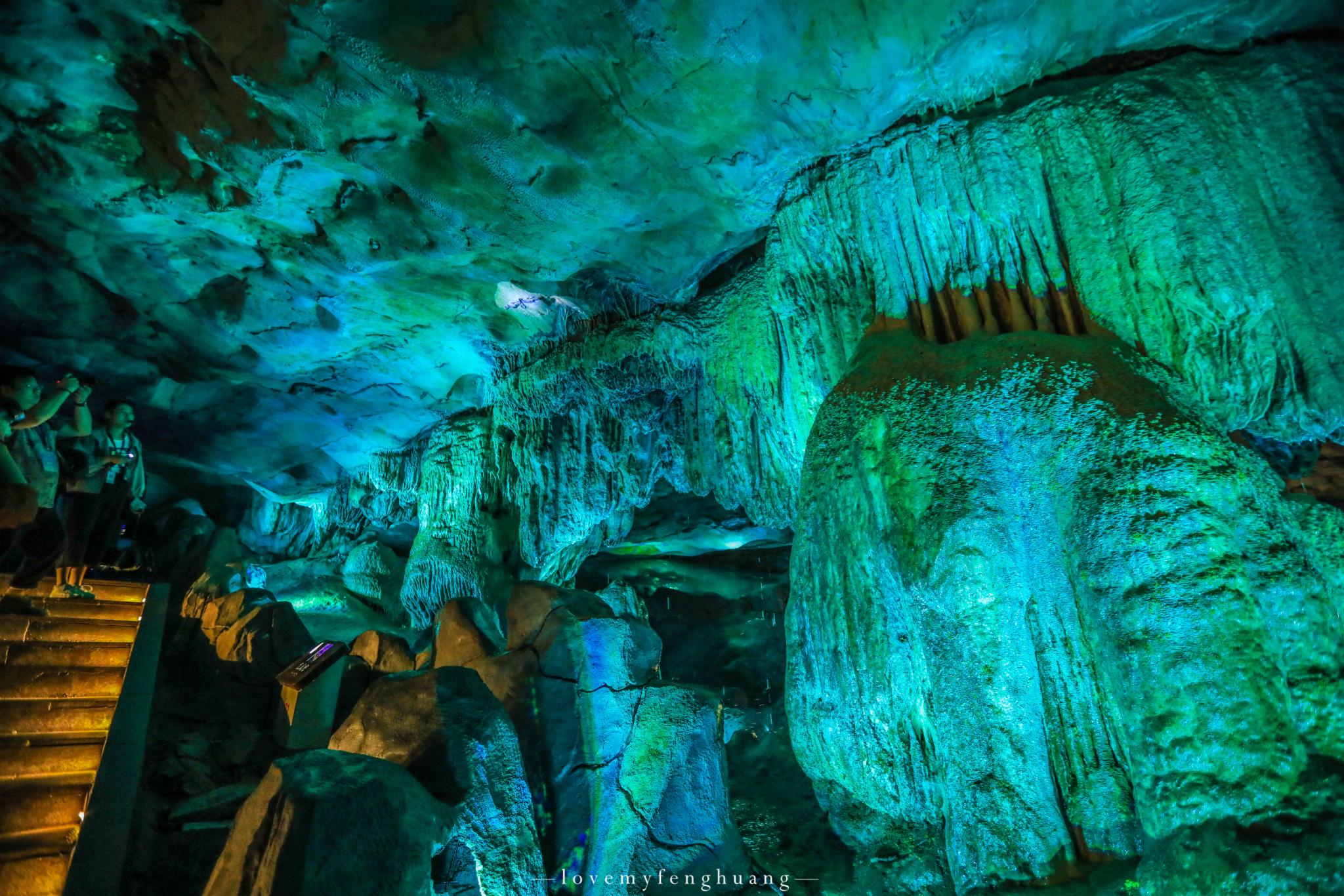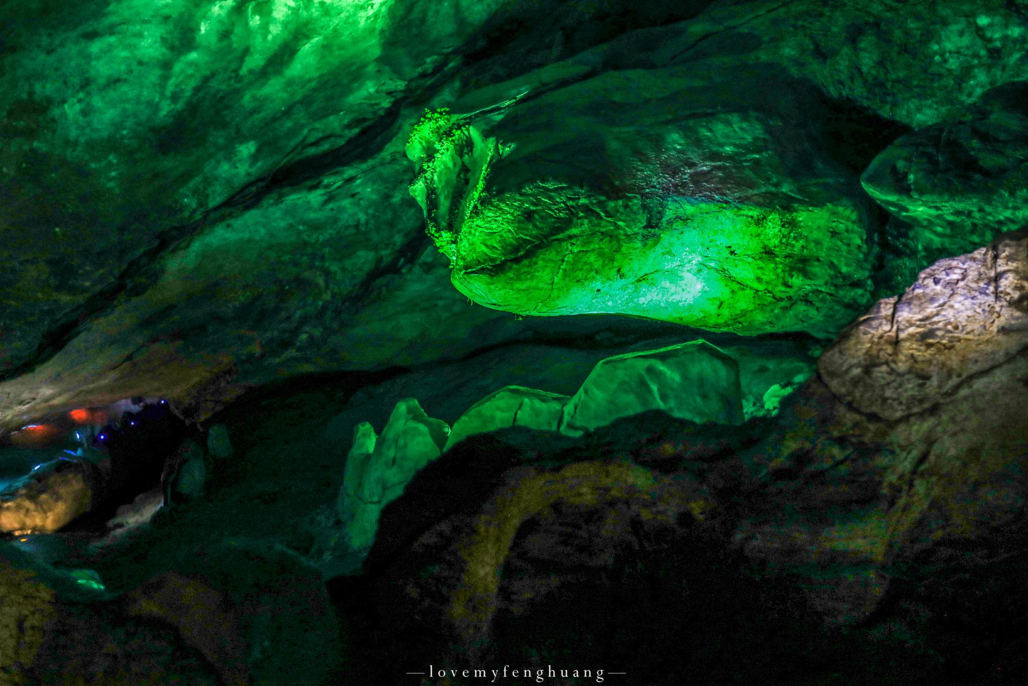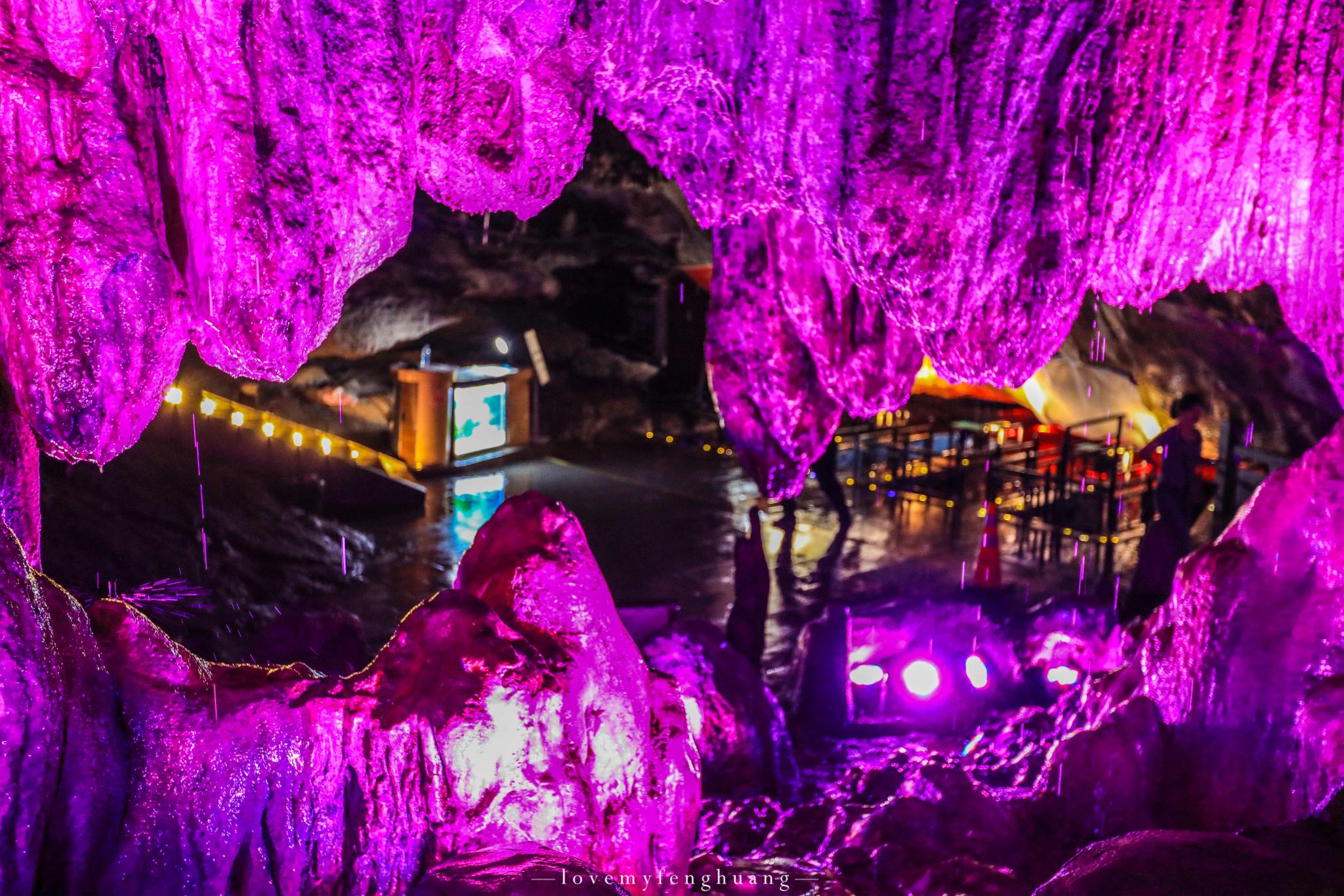 乘坐着小船进入到洞内,如果是洞外是龙厅,那么洞内就是龙宫了,上岸后回头仰望,头顶上那一幢幢垂下的石笋连起的就是龙身。金光闪闪的黄龙和苍翠欲滴的青龙盘旋交错,栩栩如生。