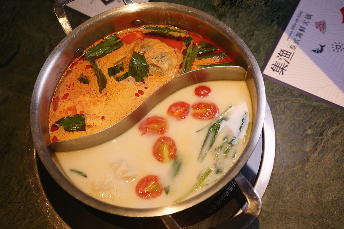 在没来成都之前就听说过集渔泰式火锅,来太古里正巧有这家店,排队的人也不少,但为了这顿网红餐厅,排队也值得啦!因为之前一直喜欢喝冬阴功汤,曾经在泰国也买过很多冬阴功汤底料,所以听说这家泰餐厅的锅底特别地道,想着一定要来试一下!店面是网红ins的风格,很好看,包括餐具也是属于拍照特别好看的那种。