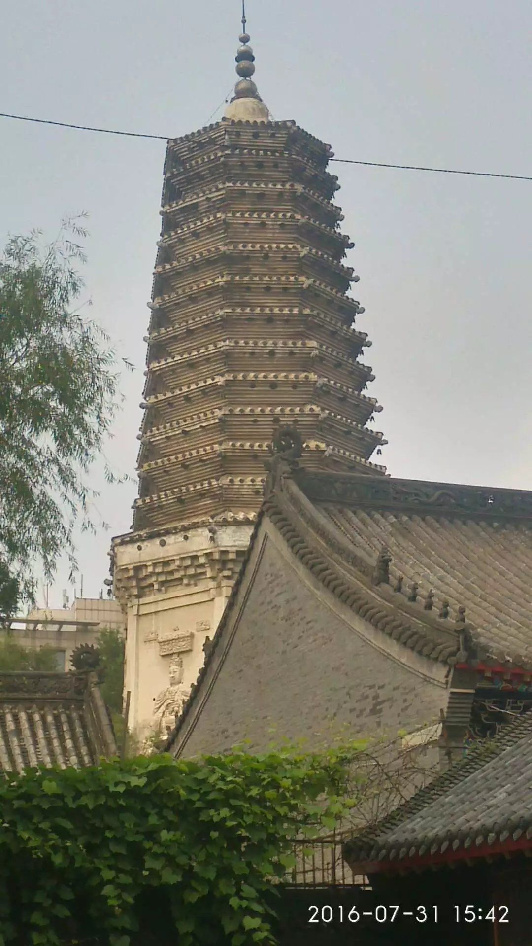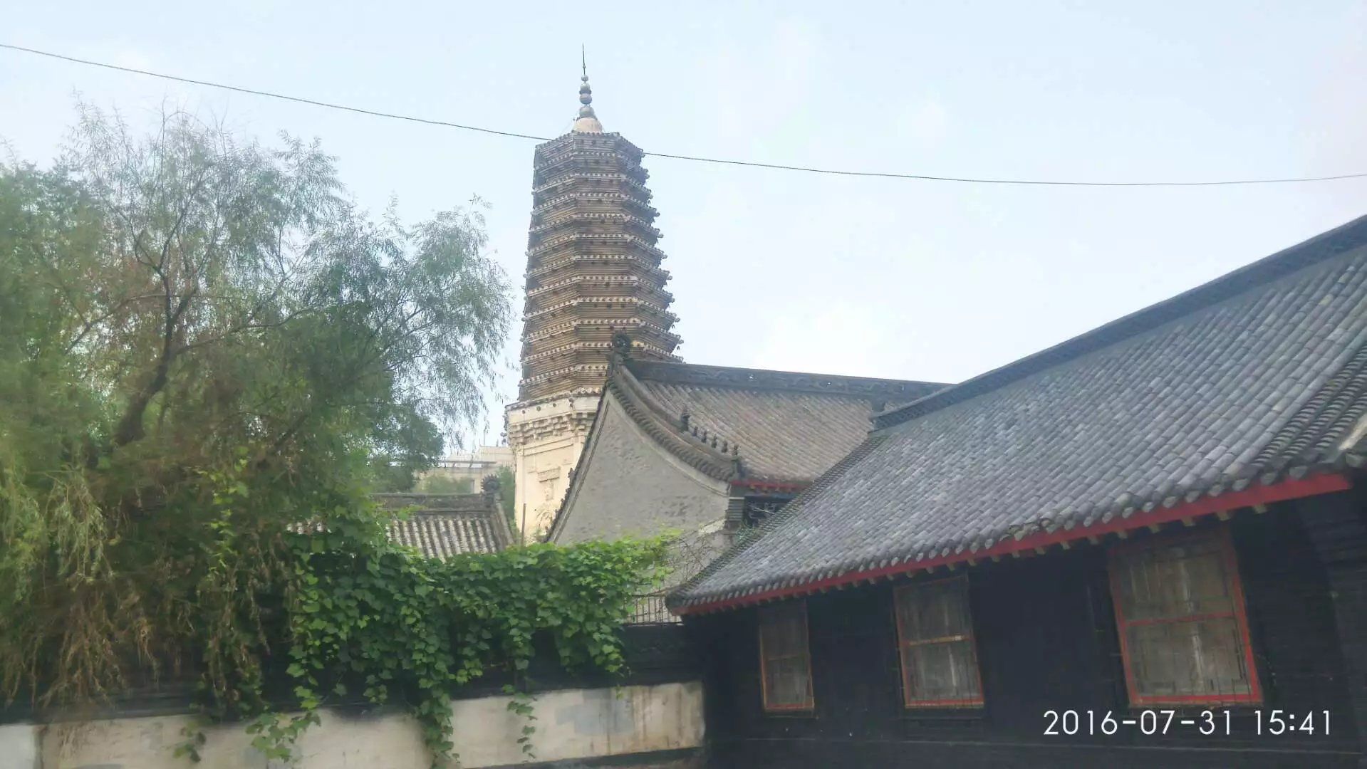 该塔在明代即已破败不堪,明万历十九年,辽东总兵李成梁夫人出资,予以修缮。此塔为八角十三级实心密檐式,塔身为青砖垒造,砖长2尺4寸,厚6寸。略成锥形。塔顶刹杆有铜盘和宝珠,塔座八面嵌有“风调雨顺,国泰民安”八8个大字,八面各有浮雕佛像一尊,并饰宝盖。第一级塔身南部是神佛像,塔檐下部有砖雕斗拱,塔基和塔身有砖雕装饰。每层塔檐都悬挂铜镜和铃锋,塔身涂白,故称白塔。古时此塔为城中最高建筑,《志书》记为“二十里外能望而见之”。每当雨后,塔高云低,云飘塔间,故有“白塔横云”之美称。古人曾用“山雨过城头,雨晴云未散;忽见白塔尖,钻入青天半”的诗句赞美白塔的秀丽景色。