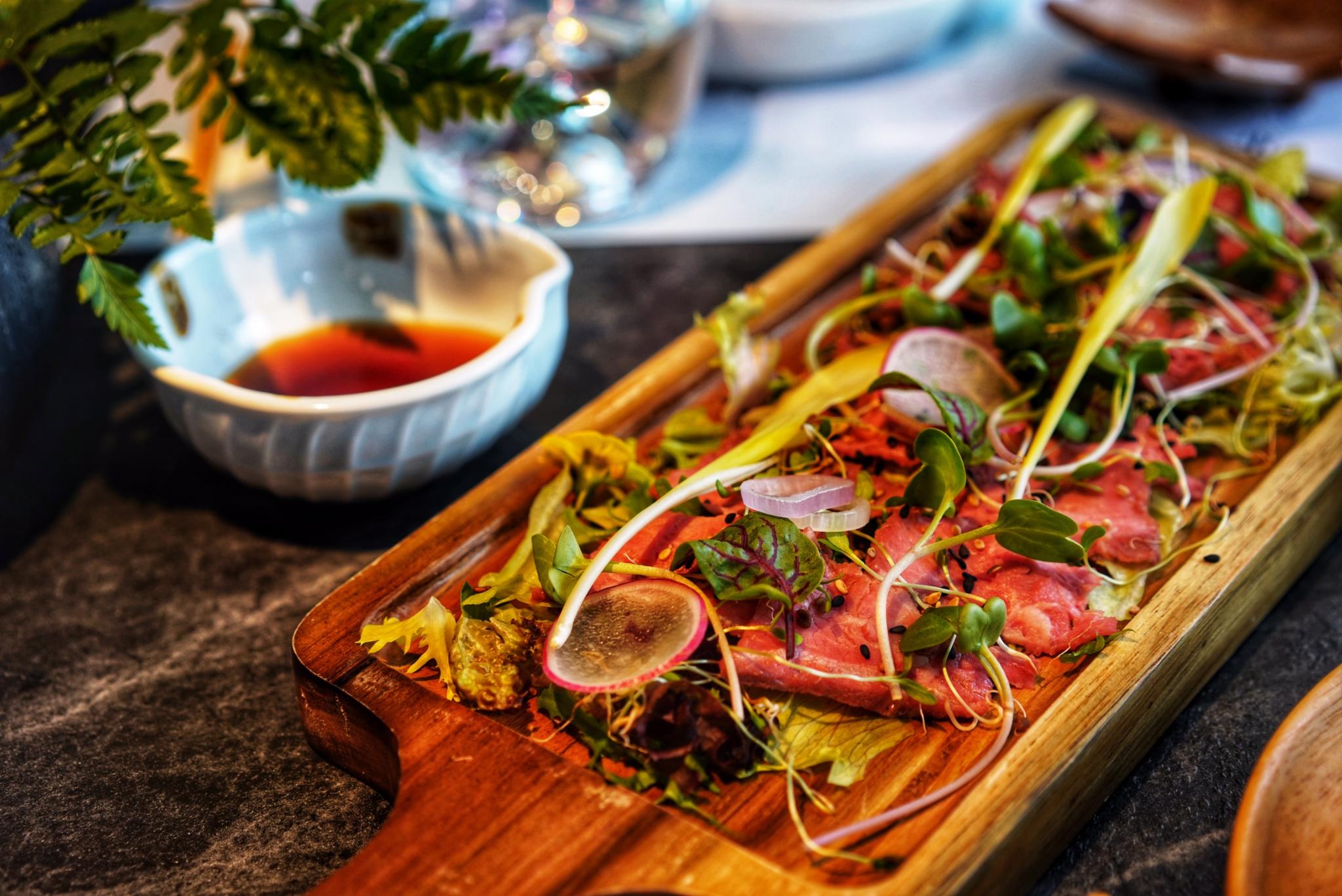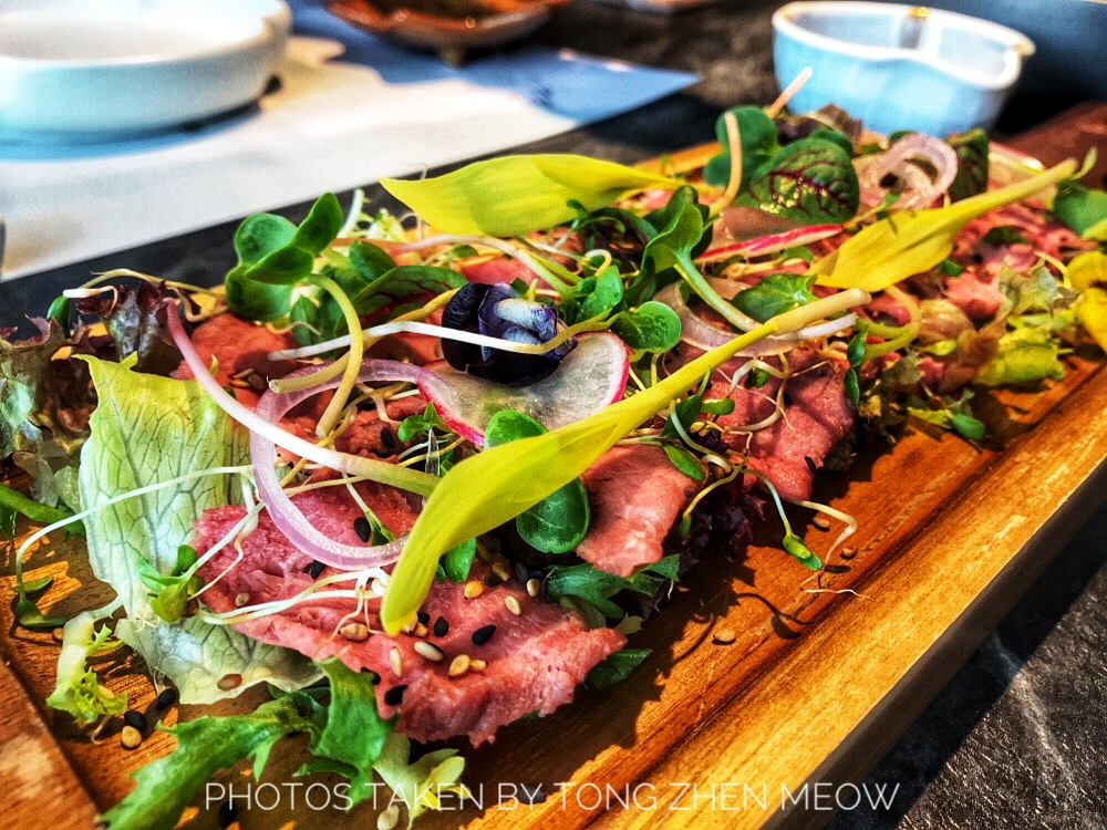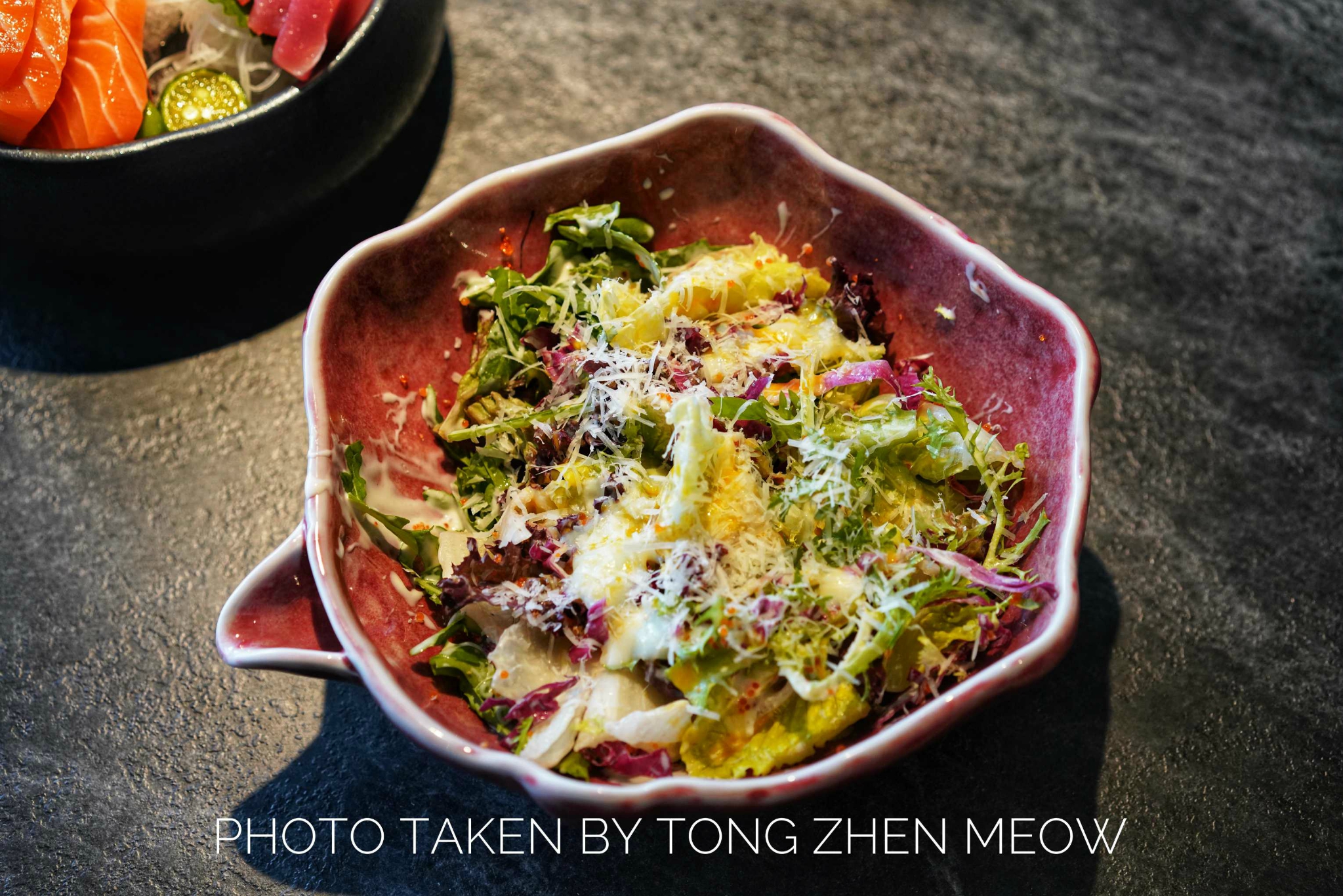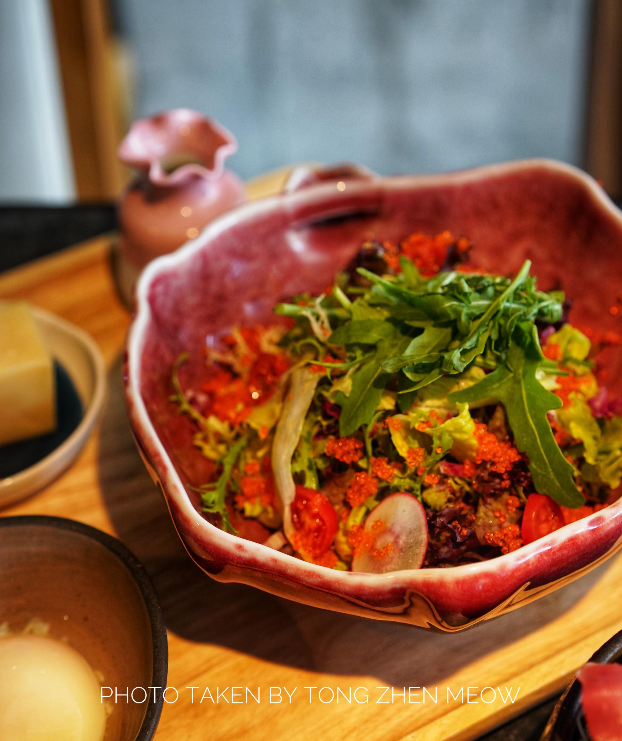 森空·和食这家店没有太多的日式气息,反而是融入现代简约泼墨风,帕尔玛凯撒沙拉,沙拉酱、温泉蛋、芝士都