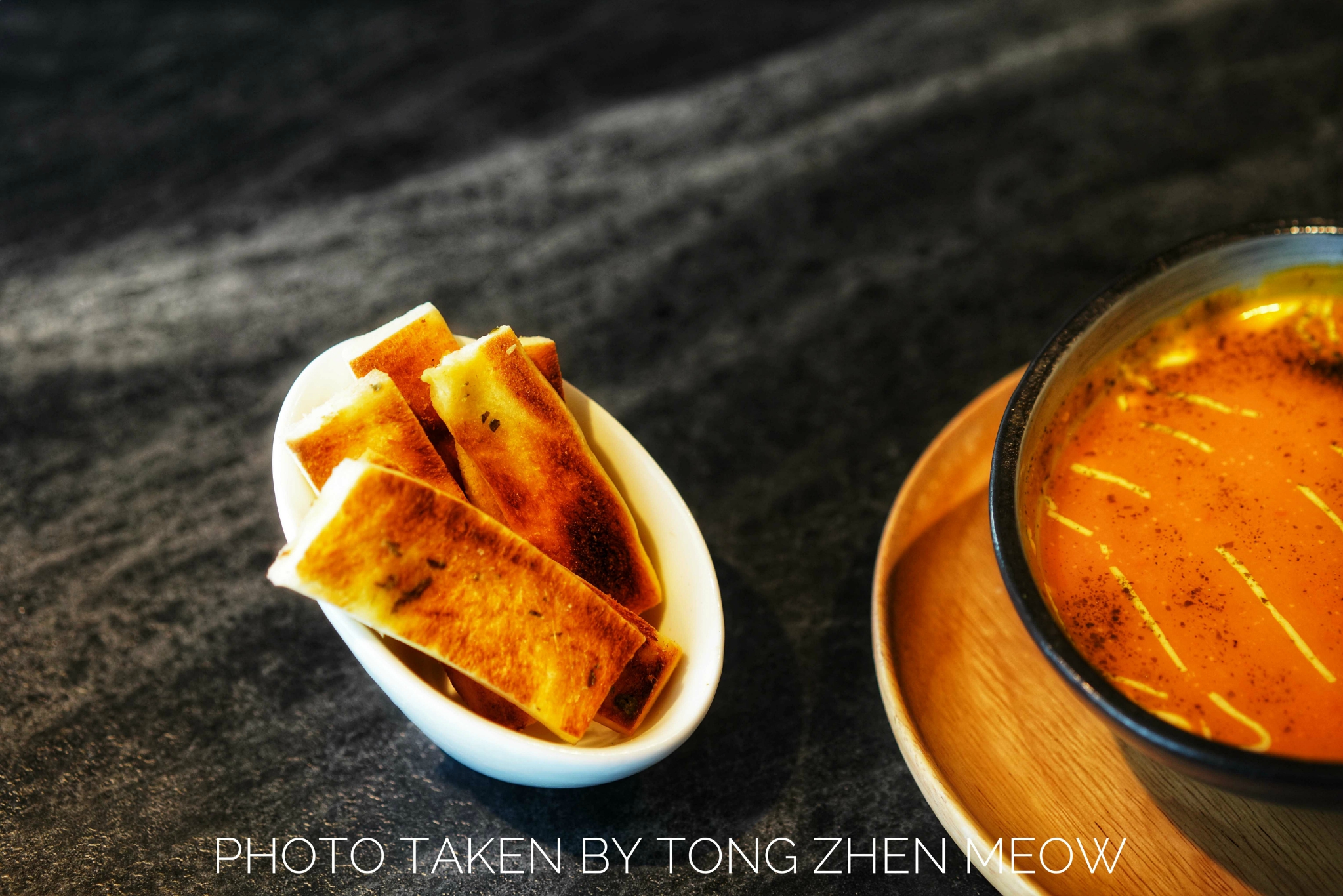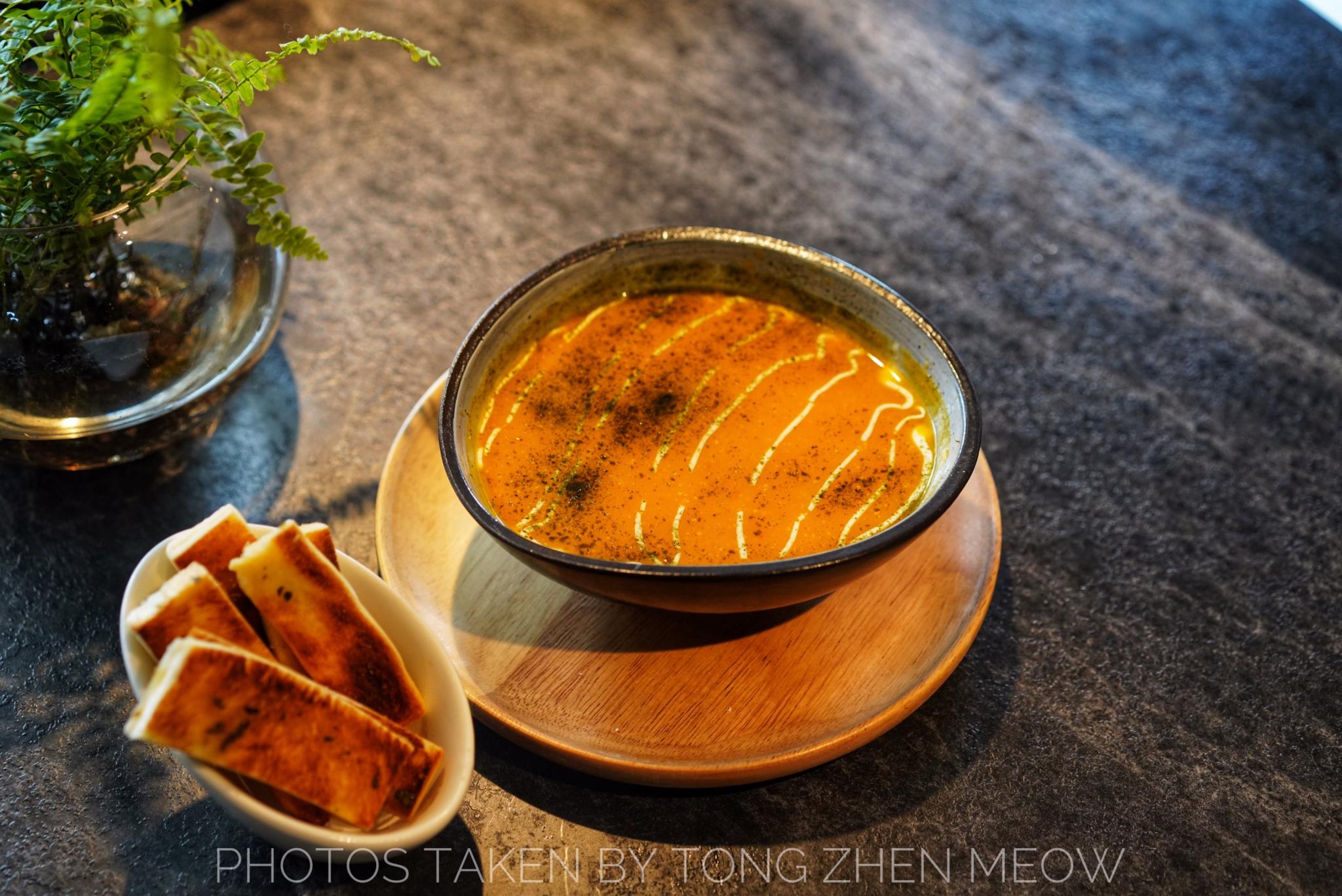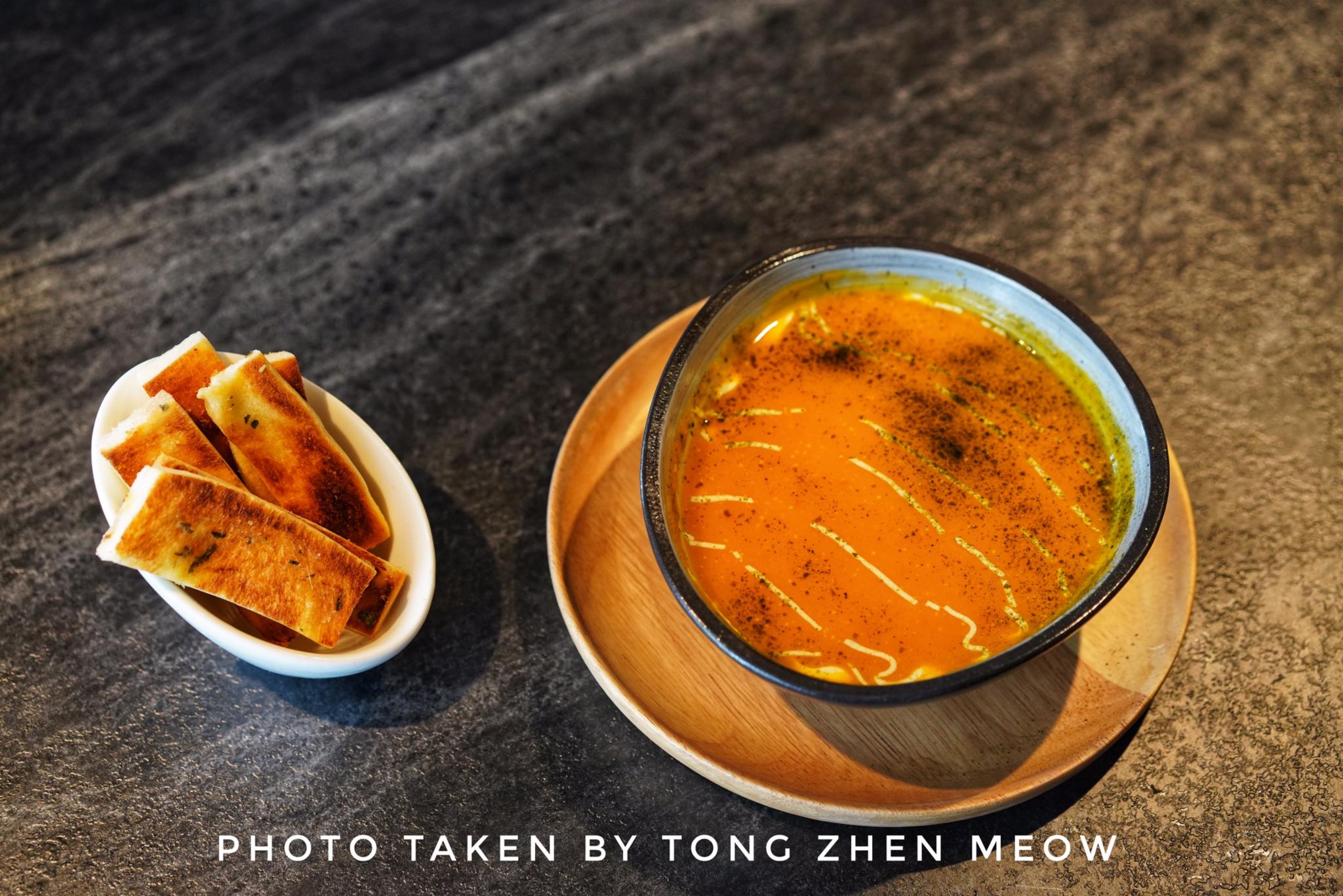 南瓜汤浓稠香甜,入口的一刹那,细腻绵密的口感充斥在口中。面包蘸着南瓜汤入口,酥脆又不失浓稠香甜,美味~
