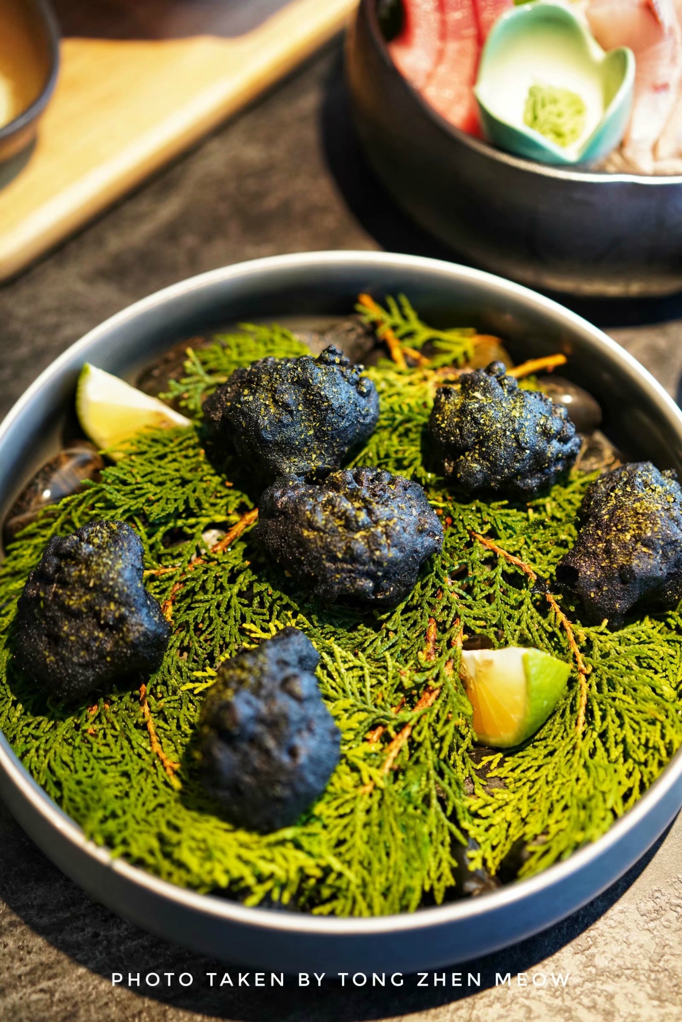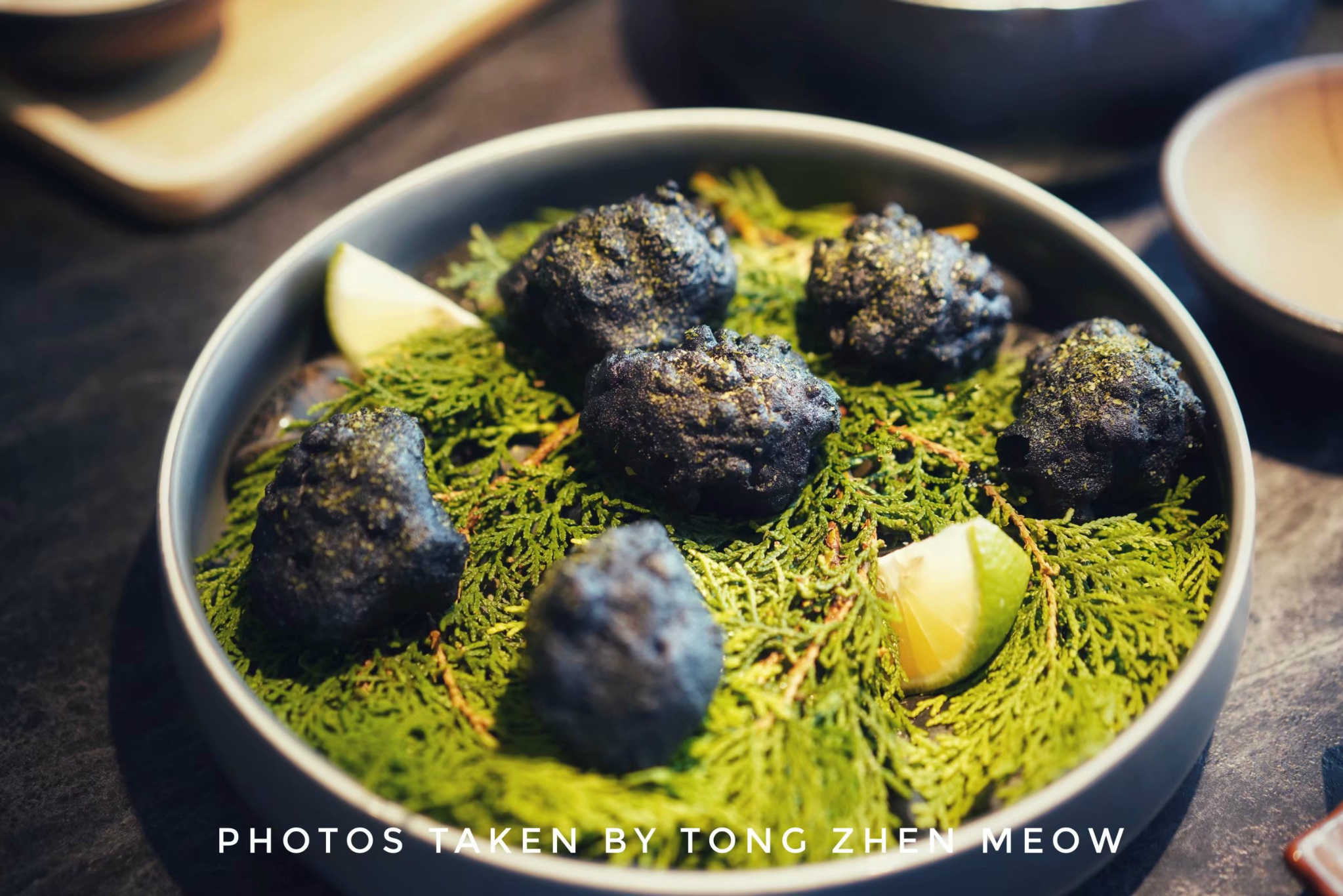 黑松露啤酒炸鸡,外形跟铺底的黑色鹅卵石一样,黑不溜秋丸子样,这其实是黑松露裹着用啤酒腌制过的鸡肉而做出来的炸鸡。酥脆的外皮,包裹着鲜嫩爆汁的鸡肉,味道却不会太过于浓郁,超适口~