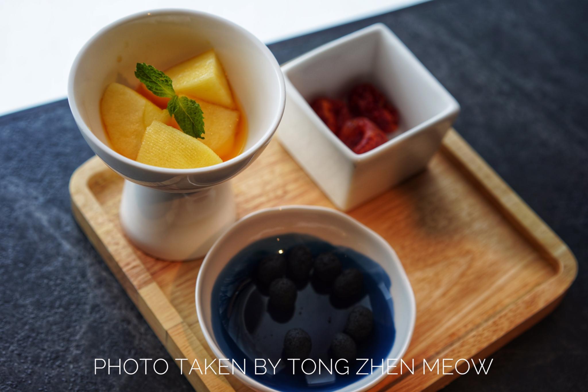 首先先上的是餐前水果,有满满百香果馨香的苹果块,甜甜的圣女果和黑色花生。