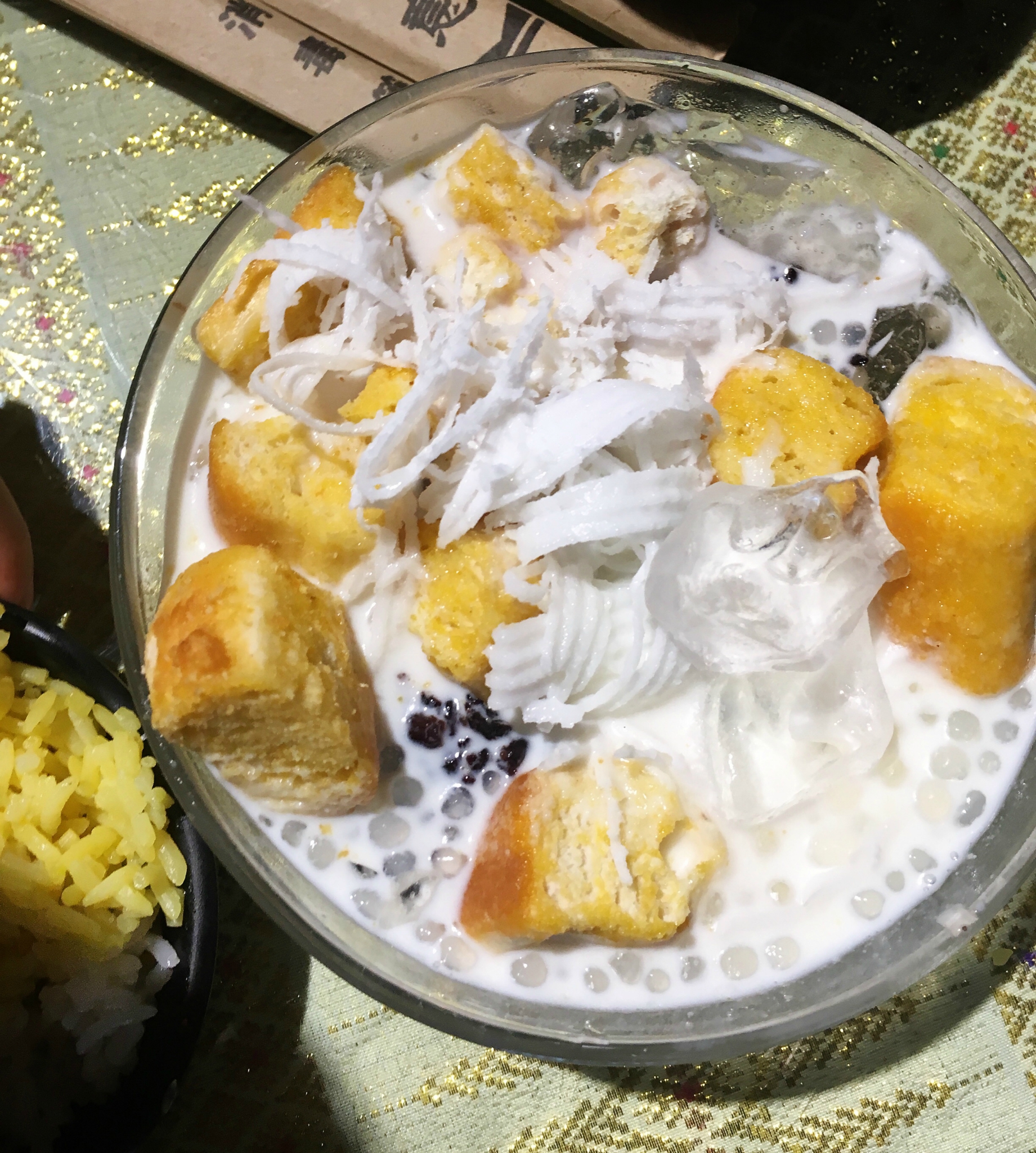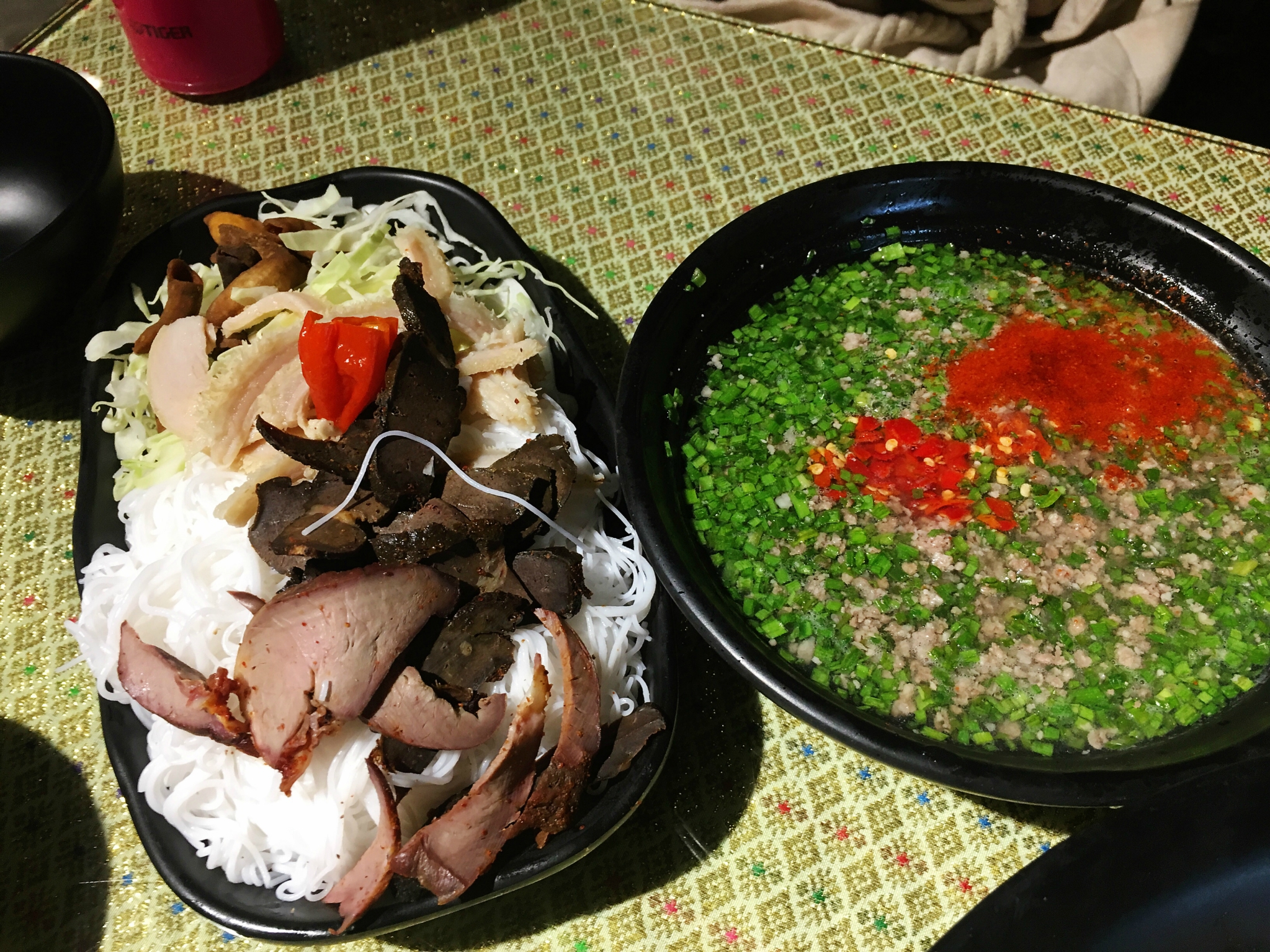 中午搜了当地排名第一的饭店,吃了手抓饭、撒苤和泡鲁达,人均不到50元,店里的特色菜就那几种,轮流点了一遍。撒苤其实也是一种米粉,过水烫熟,韭菜、香菜、小米辣切成末,加入牛肉末,有柠檬和苦味两种,我们跟着当地人选了苦味,略微有点苦。