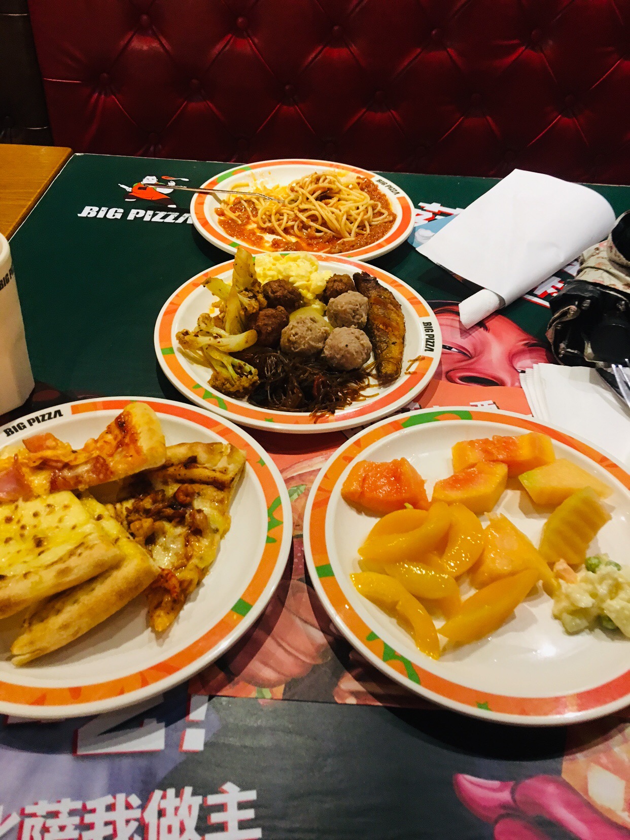 没想到比格里现在还增加了台式卤肉饭、咖喱牛肉饭和巧克力瀑布这些时髦玩意,这更吃不下去披萨了,哈哈。