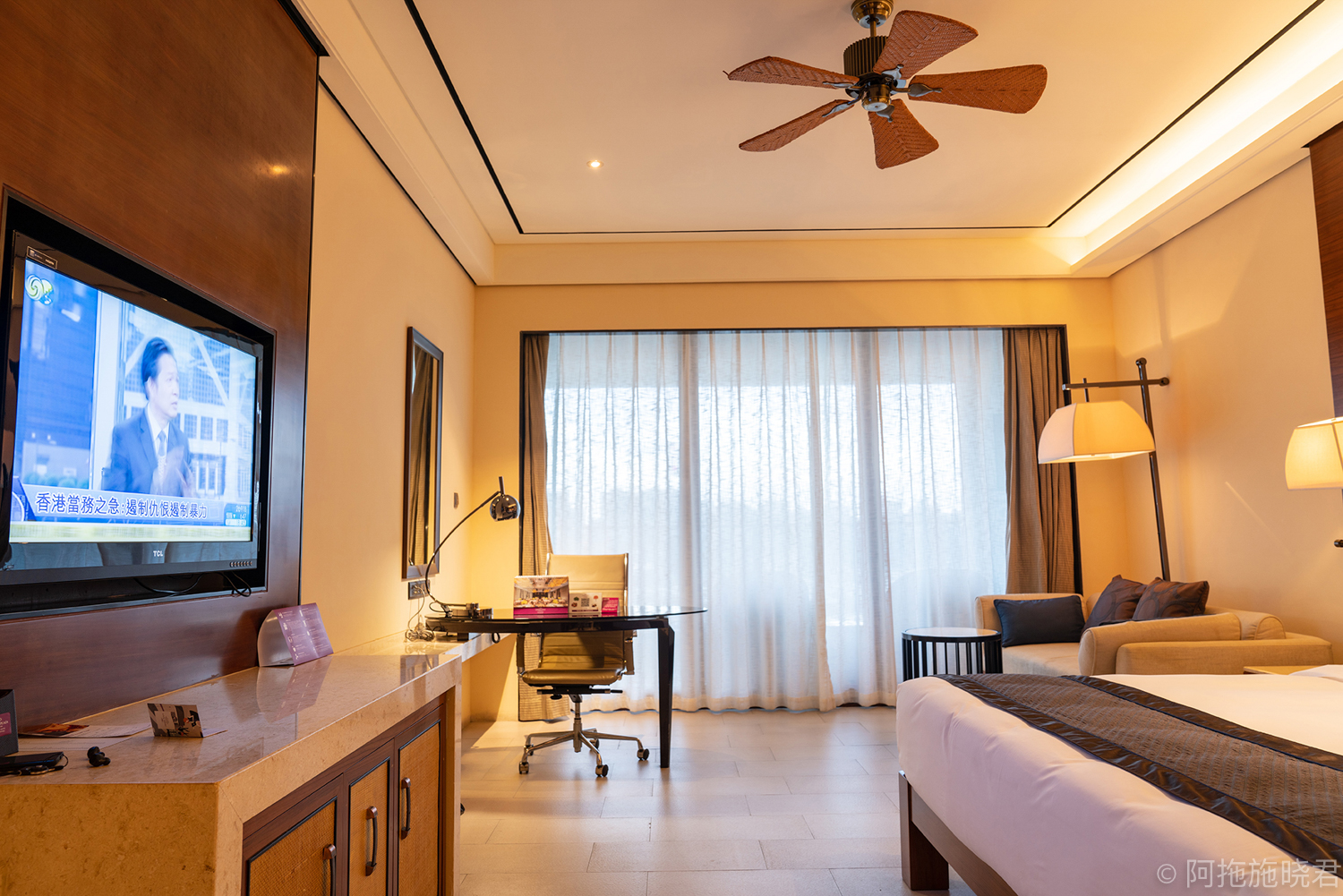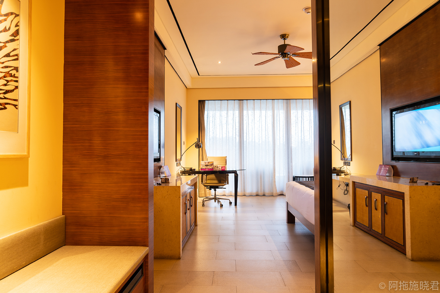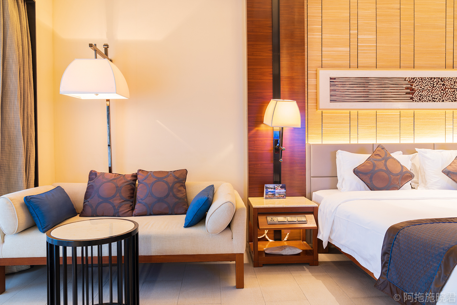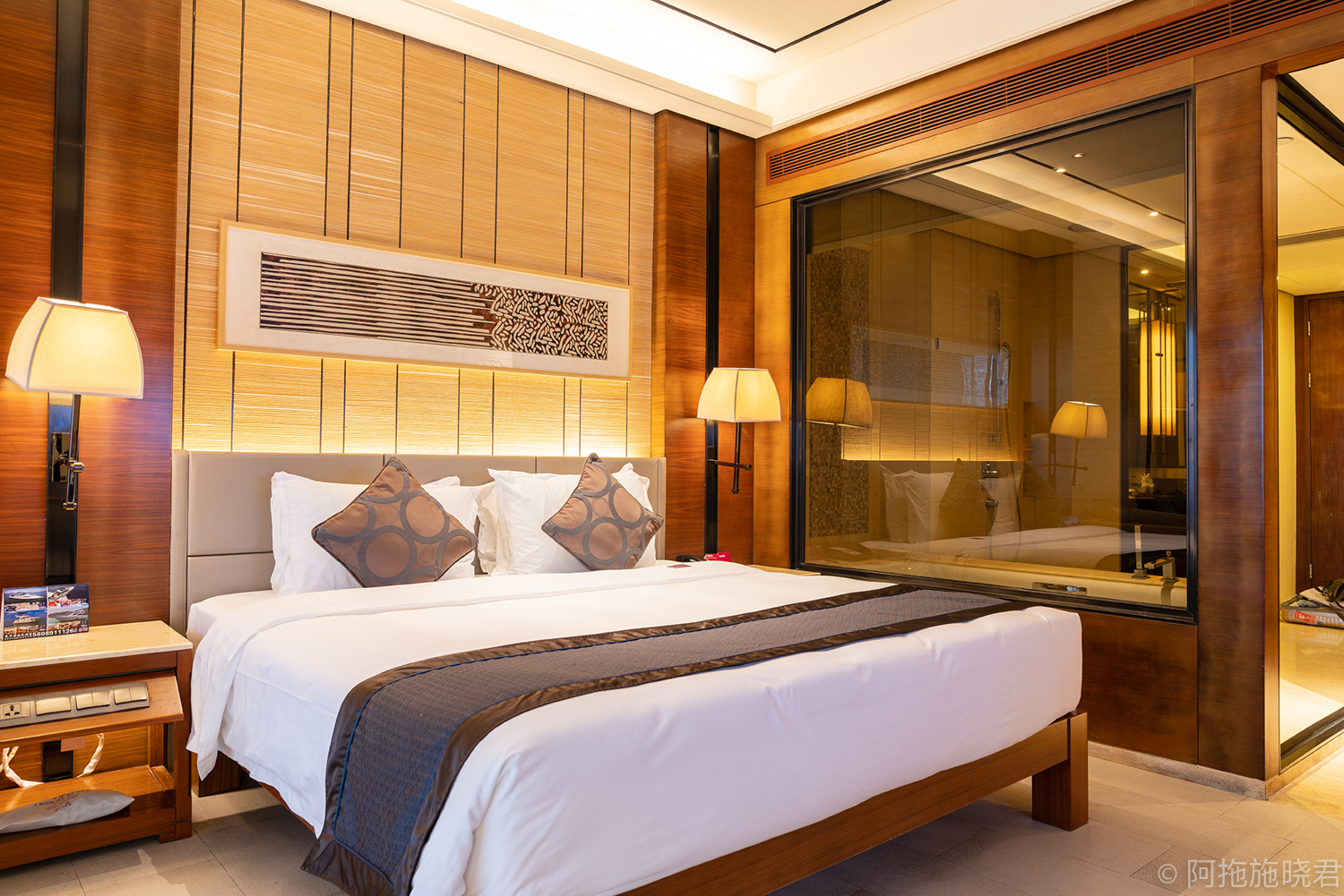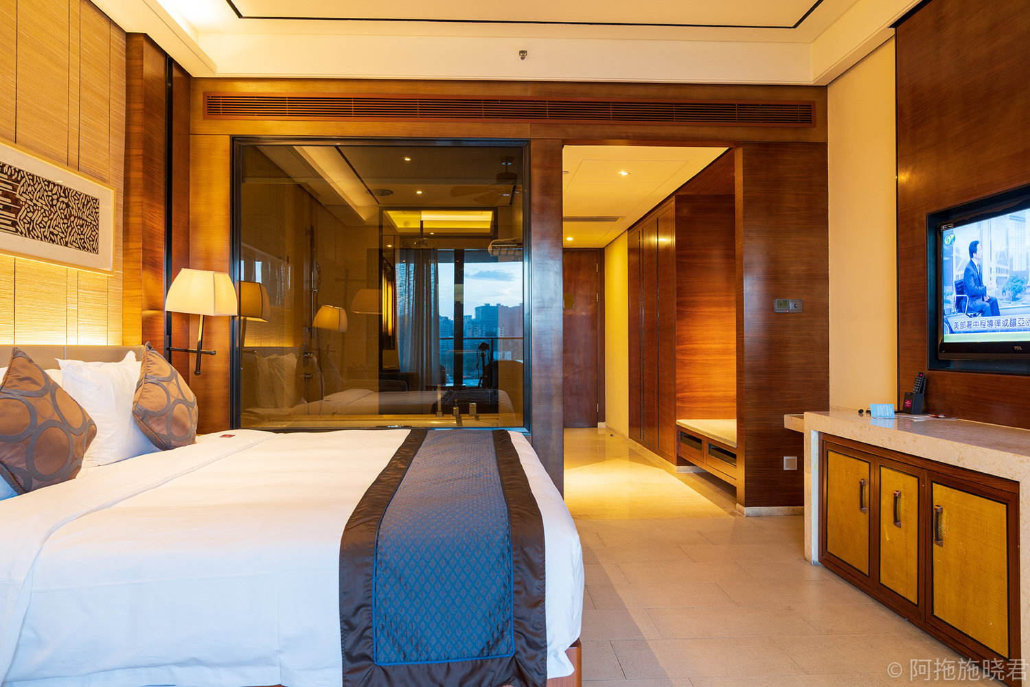 房间是规规矩矩的五星级配套,所有的让人住着舒服的酒店房间都是因为床品配得好。小冰箱,书桌和沙发几乎都是标配,前往洗手间那透明的玻璃让整个房间显得更大一些。