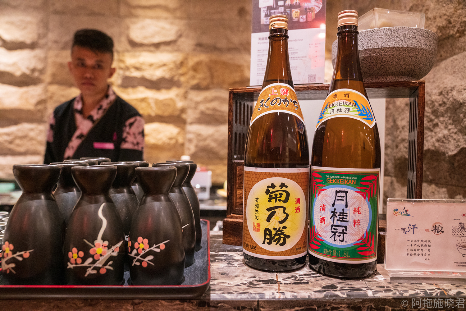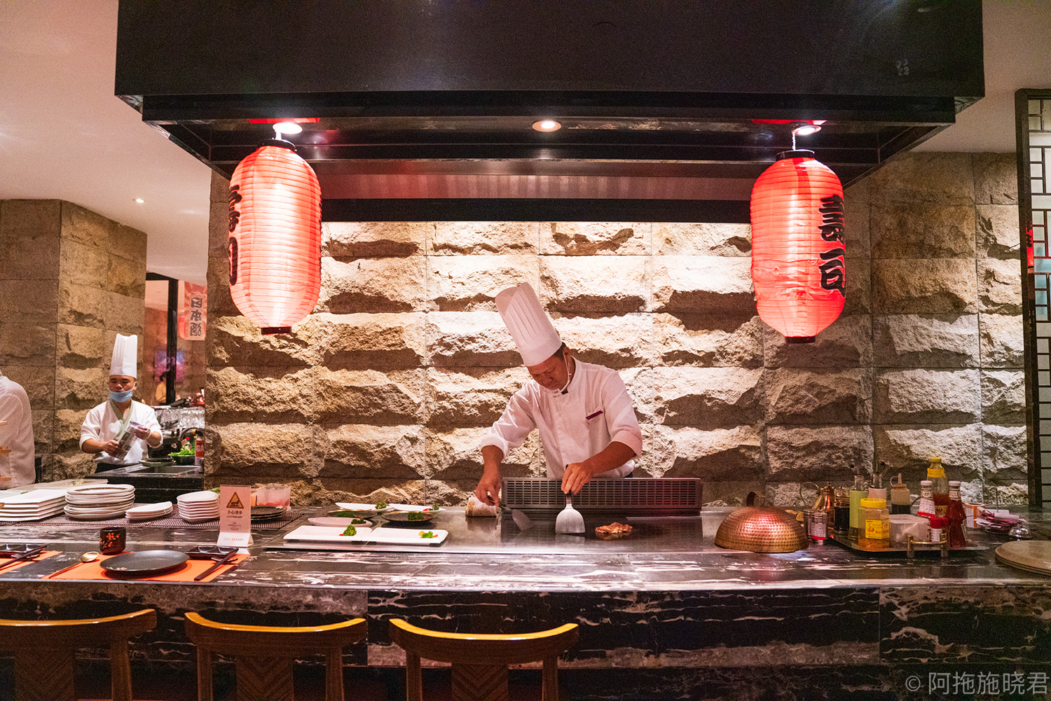 日料位于酒店的二楼,沿途走过去会有特别的红灯笼,很容易辨识。进入餐厅,非常的日式,清酒和波子汽水都是特别日系的东西了。眼前的老师傅正在做铁板烧。