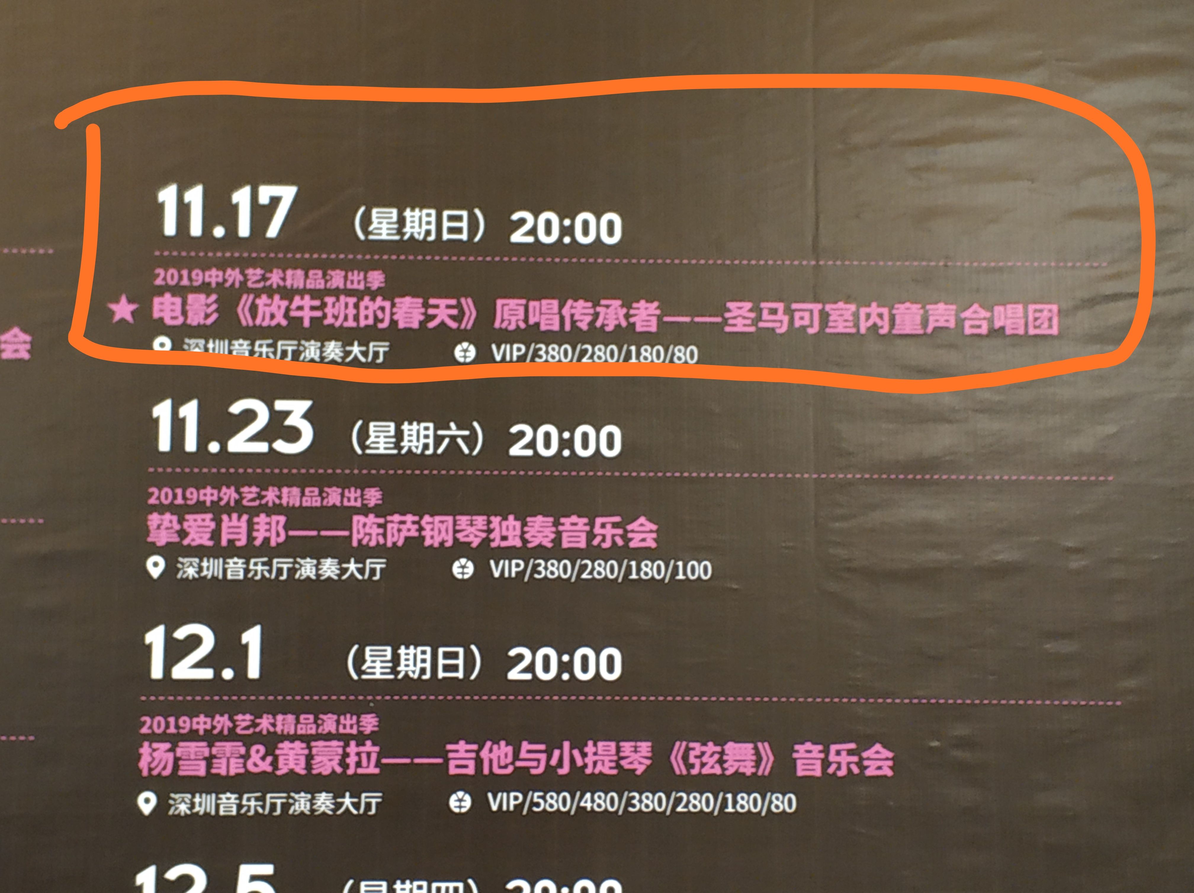 提前到达目的地,开场前驻足在宣传板前,无意中看见了放牛班的春天,原班歌唱团,将于11月来这里表演合唱!和电影里的精神,如此近距离的接触,机会一定不能错过啊!废话不多说,立即买了票,C位😄