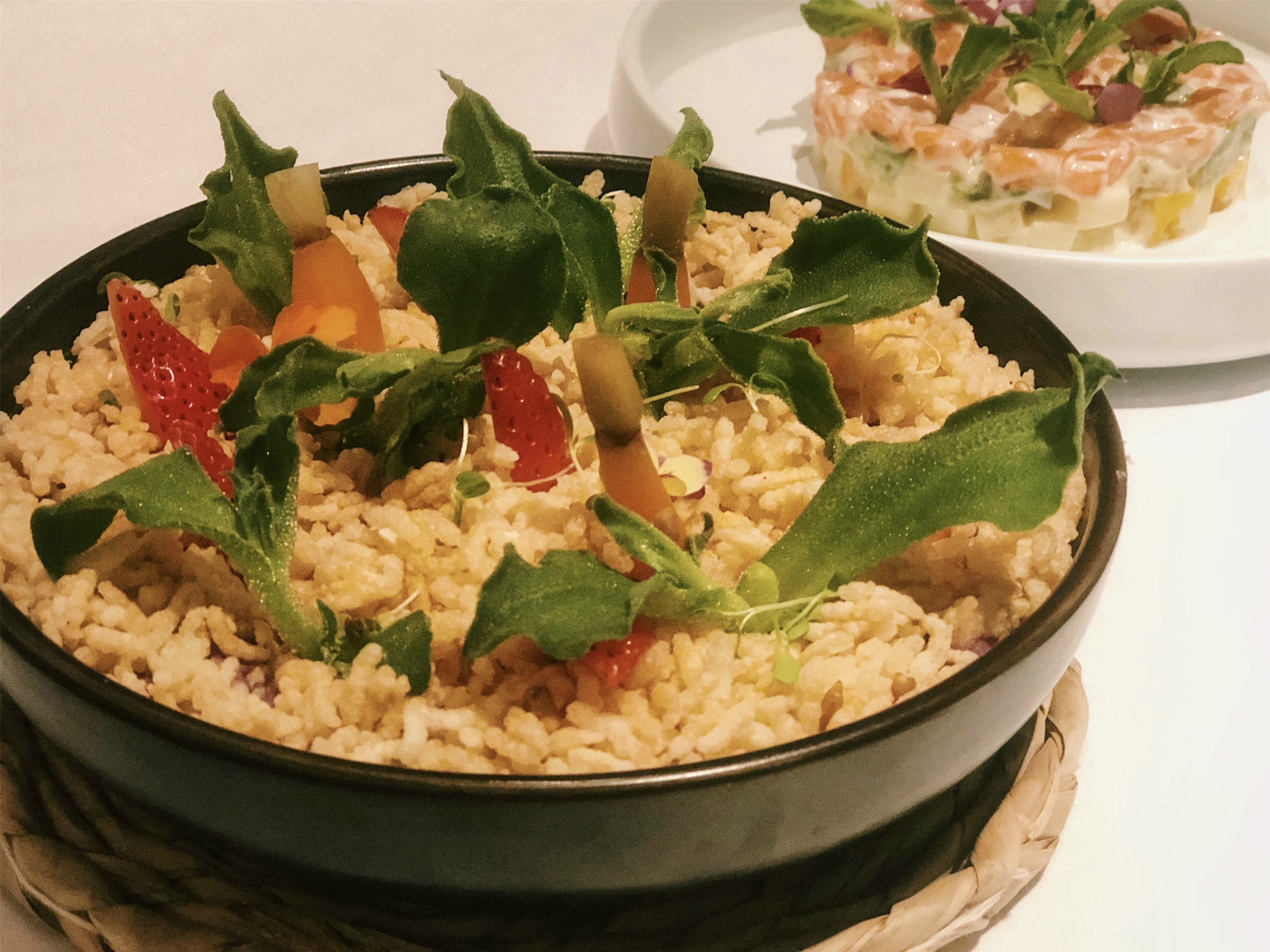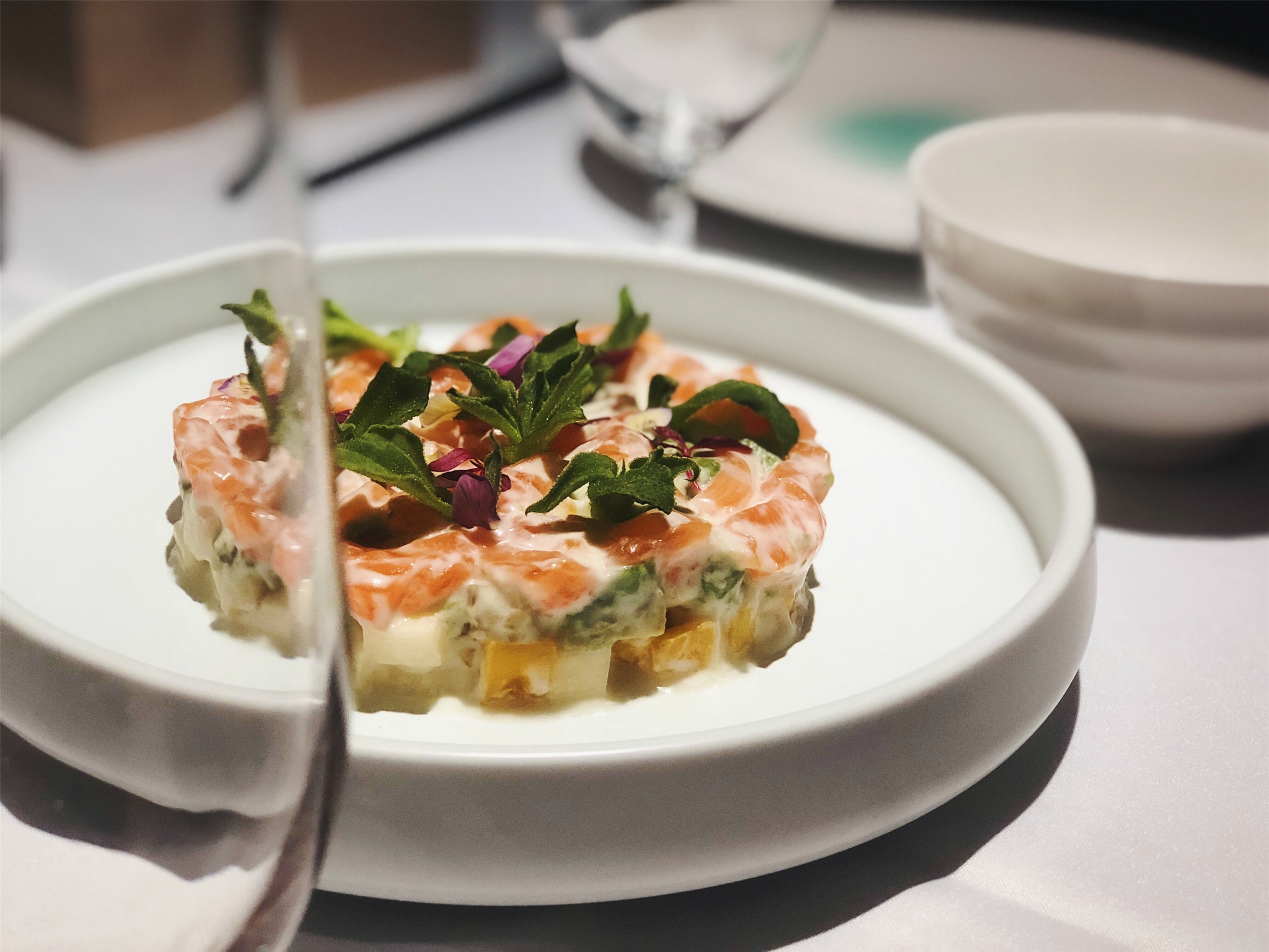 三文鱼牛油果层层塔:这个三文鱼已经是刺身级别的三文鱼了,苹果丁、芒果丁、牛油果丁、三文鱼丁层层堆叠,口感丰富却又搭配合适,苹果丁中和了牛油果的香甜醇厚,还有鱼子酱在上面,看似简单却饱含设计。