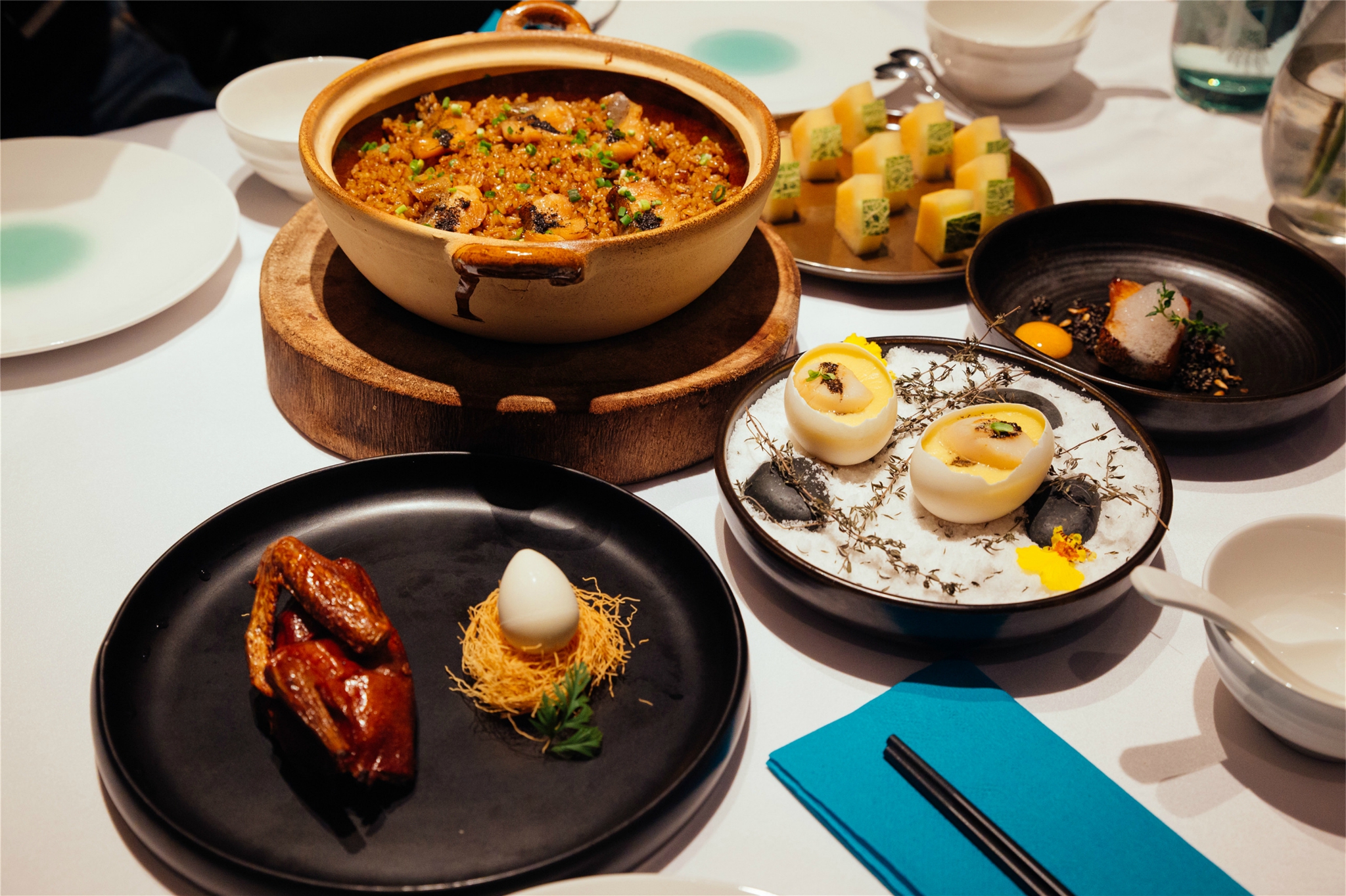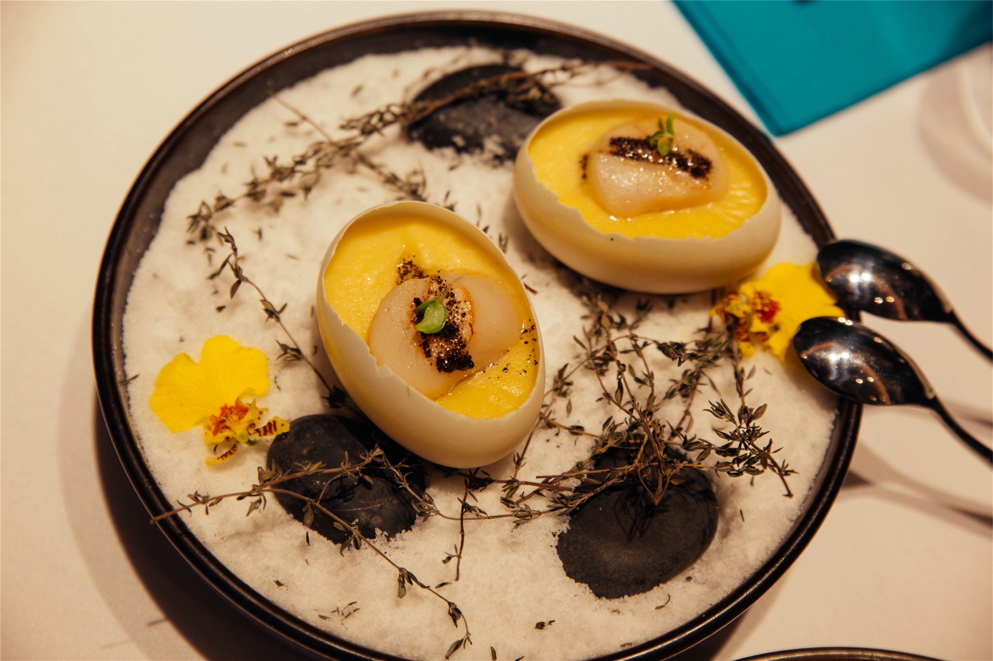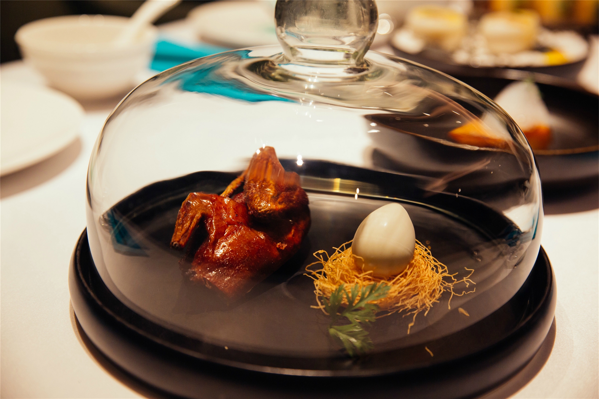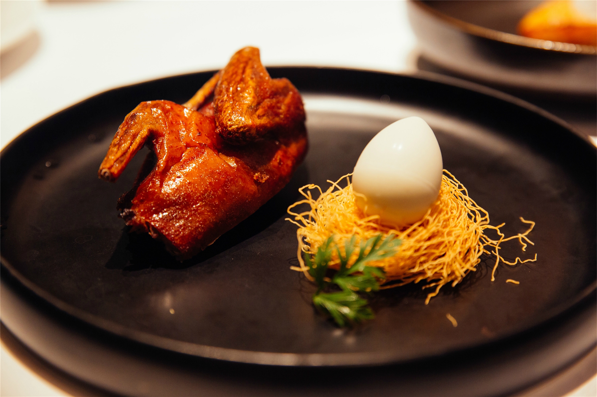 鸽子·蛋:这个真的太惊喜了太惊喜太惊喜了重要的事情说三次,15天的小乳鸽用26种香料卤制而成,肉质细嫩多汁,外皮酥脆,咸香的味道和脆嫩的口感多重进行,在嘴巴里引起了一场美味风暴~我本来以为旁边的鸽子蛋是真的鸽子蛋,没想到是白巧克力甜品,蛋黄是芒果酱做的,把鸽子蛋敲碎了让芒果酱留到用炸面线做的鸟巢上面一起品尝,真的是创意十足。