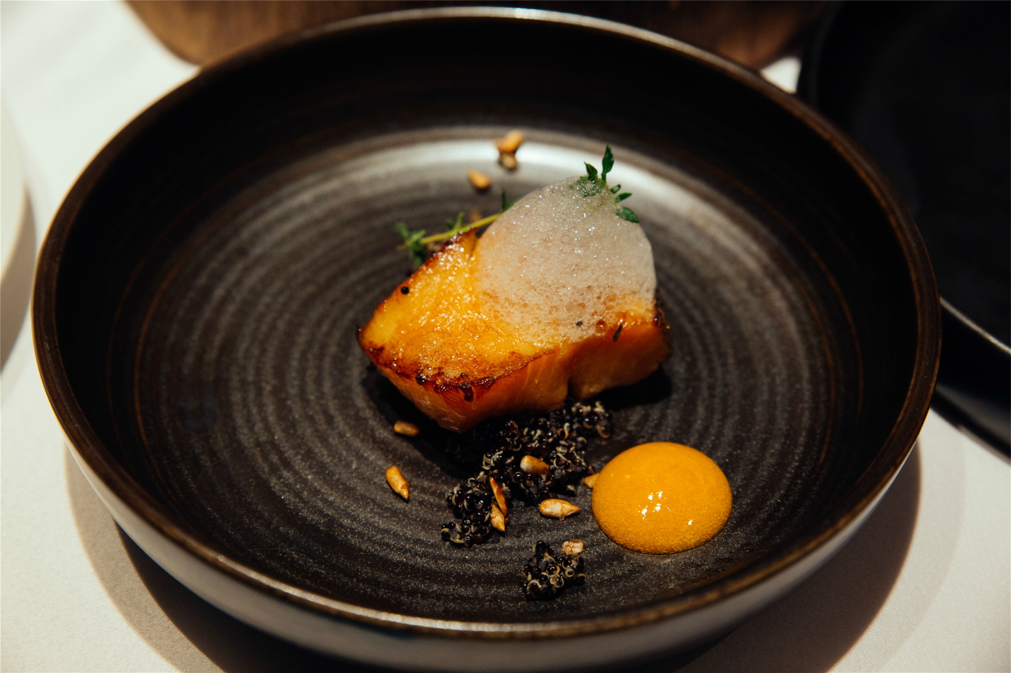 炭烧深海鳕鱼配柠檬泡沫:我跟芒果一人来一份,深海鳕鱼的味道不用说,调味得当,柠檬泡沐更是点睛之笔,外酥内嫩的鳕鱼配上芒果酱,入口即化,抓不住就滑倒了胃里,也滑倒了我的心里~