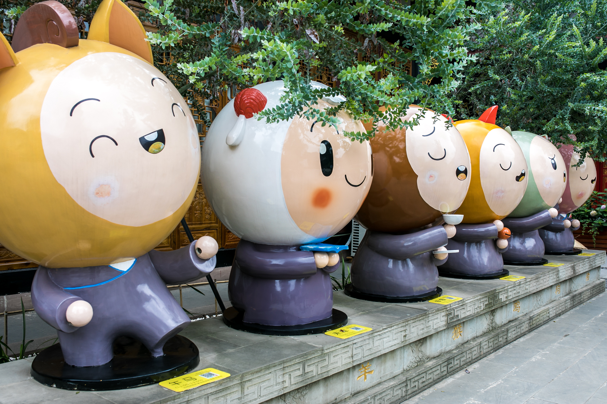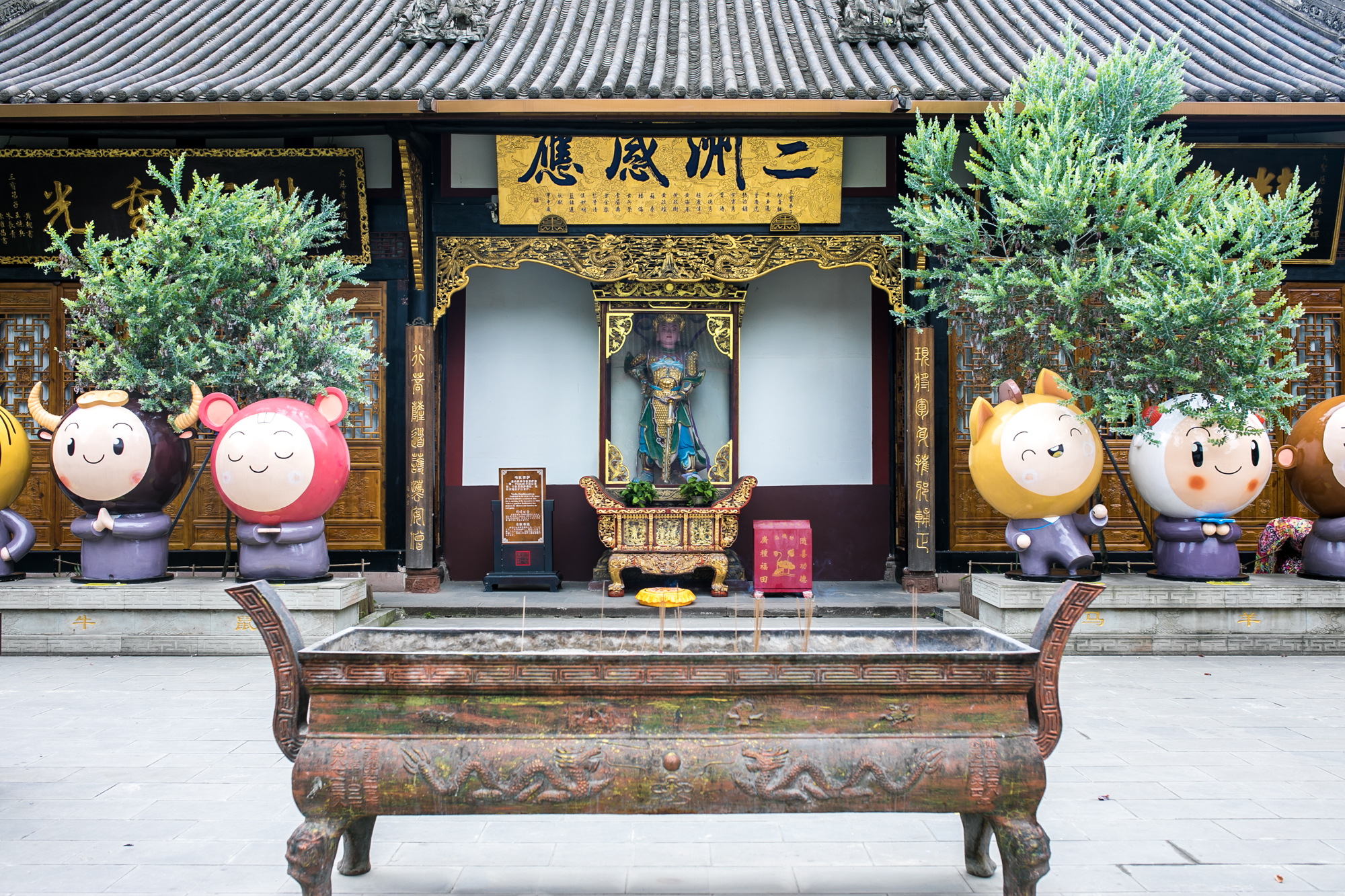 历史上大慈寺规模宏大,后经历战火,几经兴废,现在我们看到的为清代重修而成,其中进门时看到的“古大圣慈寺”石匾历史悠久,刻于光绪六年,为大慈寺一宝。现在看到的殿堂为三洲感应的韦陀护法,两侧布置了一排卡通版的十二生肖,比较有趣。