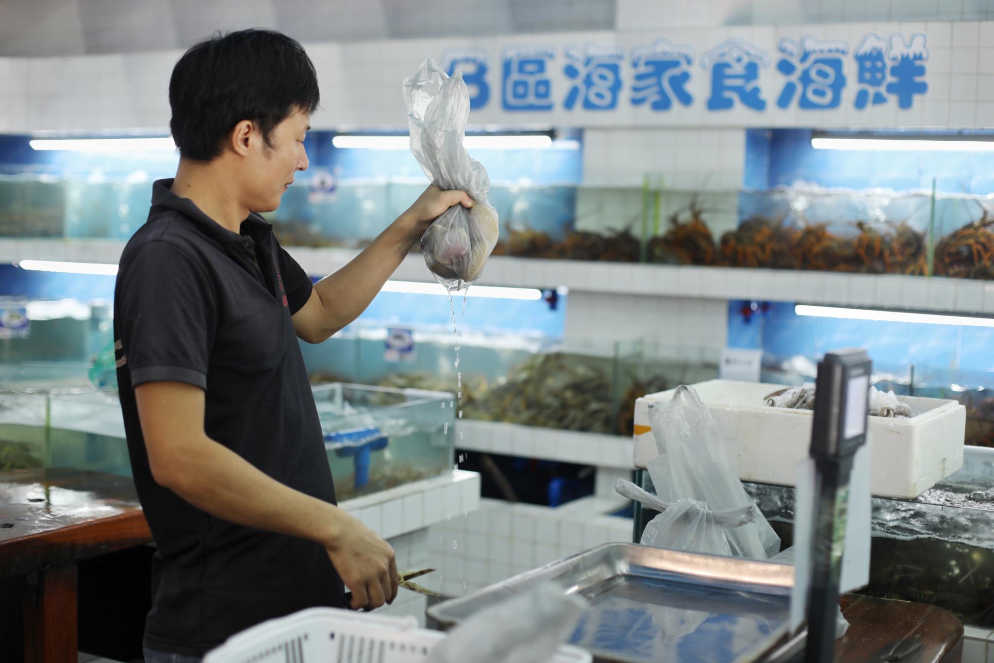 选了一些海鲜,称重小哥一个小动作感动了我:他把塑料袋剪了洞,把水挤干净才称,良心啊!