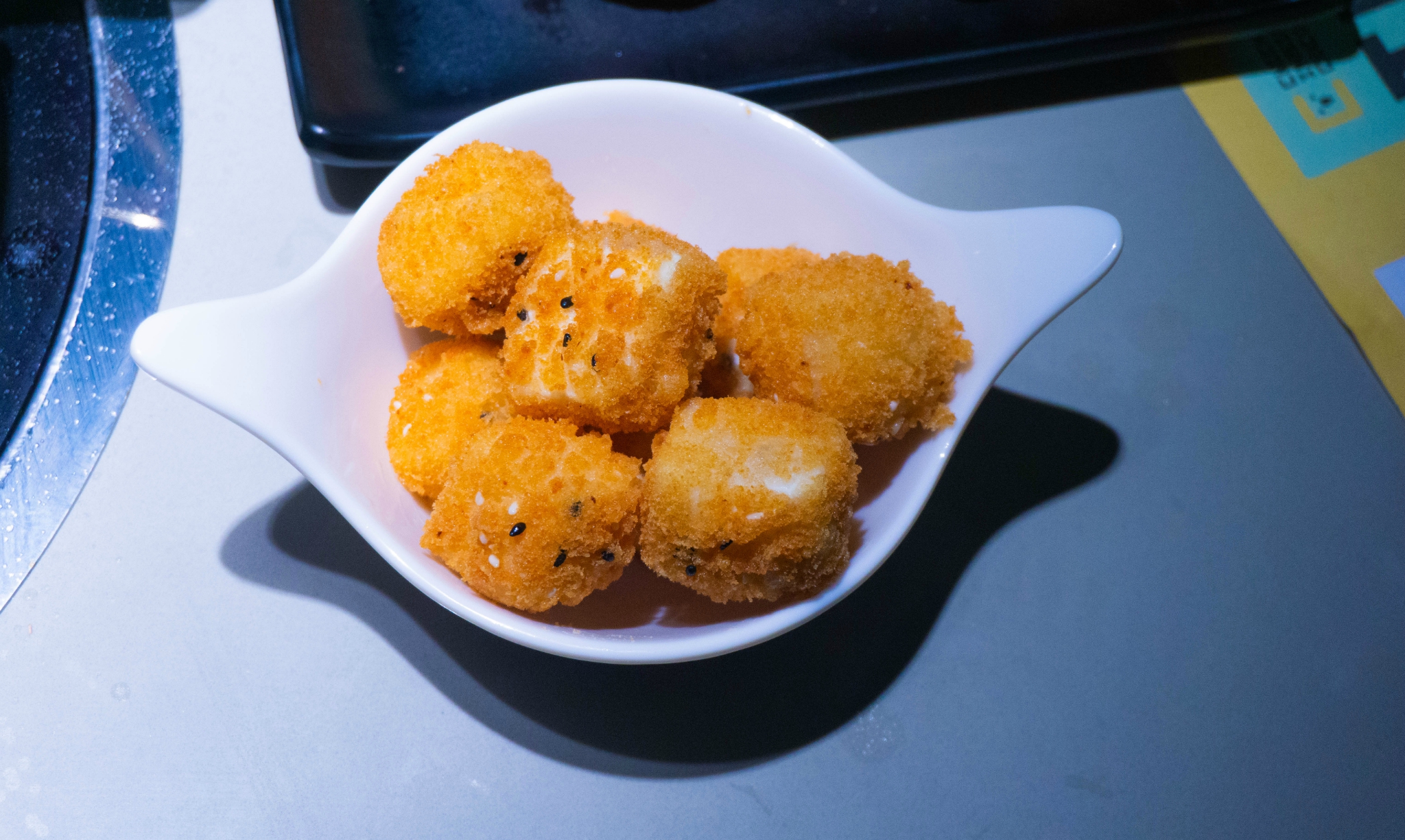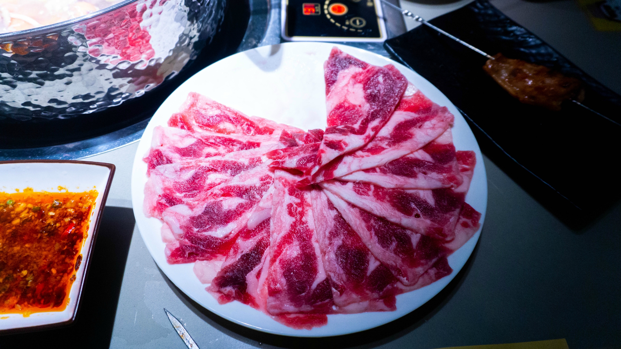 这个是腐皮卷,放锅中烫软,吃起来像油面筋,不过要更劲道一点。还有就是这个自家水饺皇,里面夹的腌笋有点像螺蛳粉里面的酸笋,闻起来臭臭的,加上完整的虾仁和脆脆的海带丝,个中滋味只有你自己来尝尝才能体会的到了。雪花肥牛不同于一般机器切的那么薄,有一定的厚度保证了肥牛吃到嘴里的满足感。
