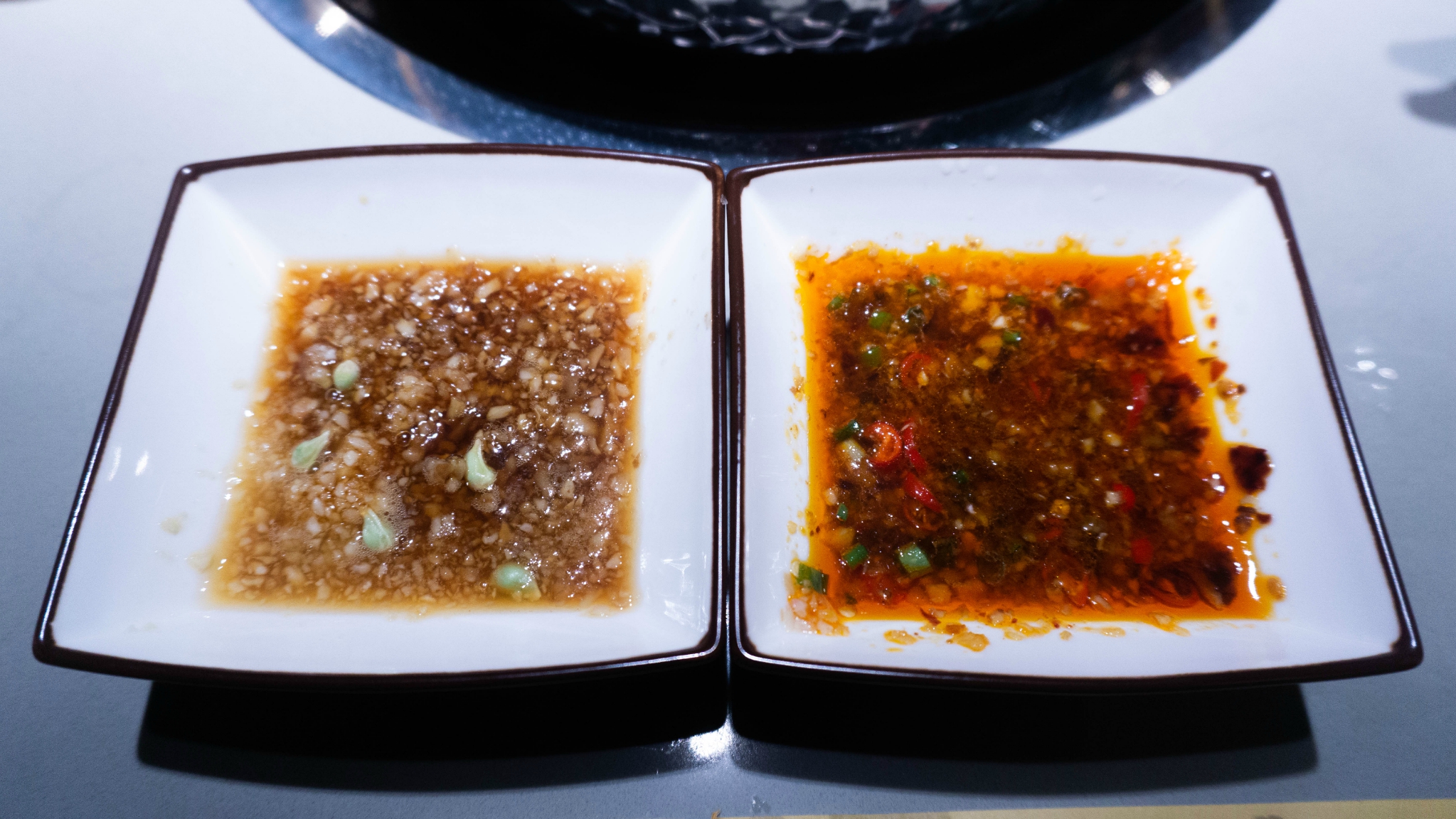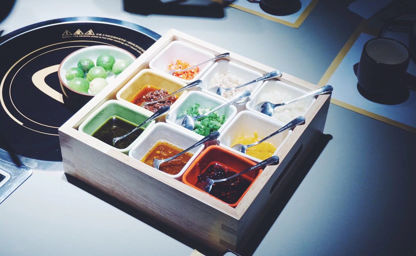 当然,调料也是与众不同,九宫格调料想必已经吸引到你的目光了吧?9种调料分为3+6,前3种小米辣、沙姜、蒜蓉是选取 海南 本土的食材,后6种则是基本的酱料供食客选择,然后最重要的就是挤一点小青橘的汁进去,一碗极致的蘸料就完成了。