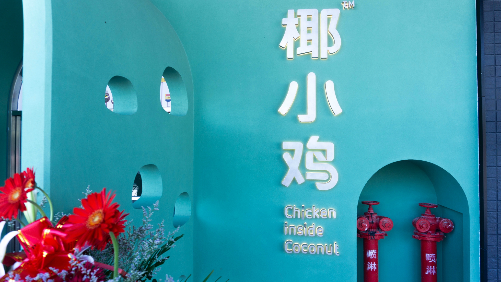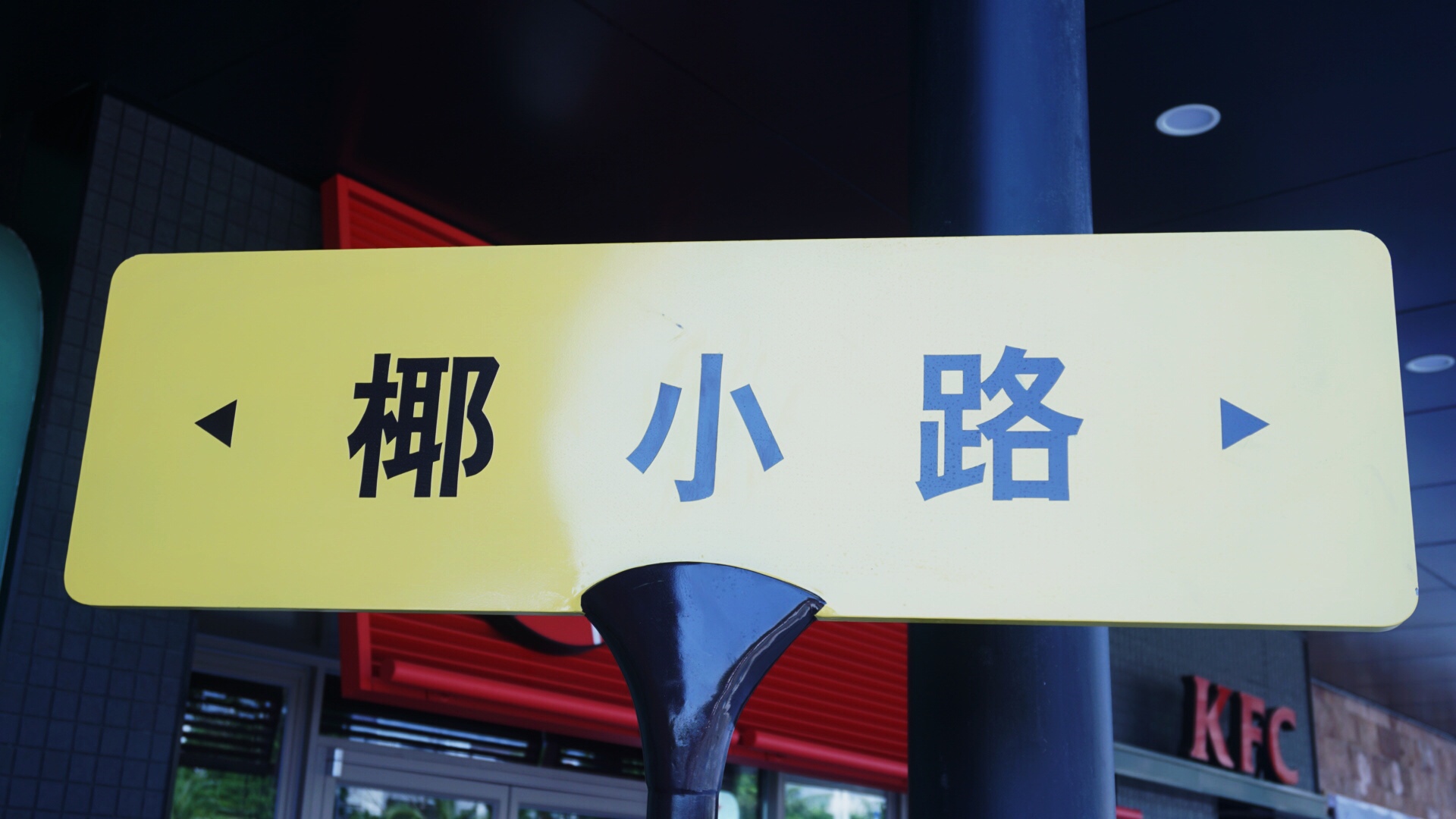 店门口的招牌旁坐着三个可爱的卡通人物,边上还有一个路牌,上面写着“椰小路”,据我所知每一家椰小鸡店门前都会有这样一个路牌,所以是非常好找的。