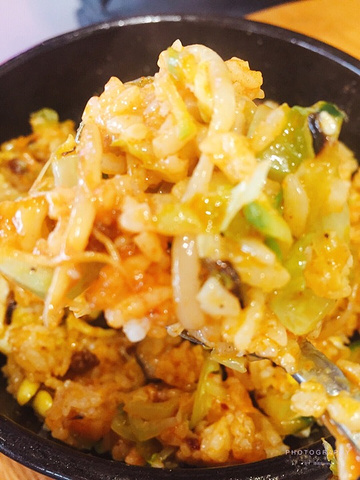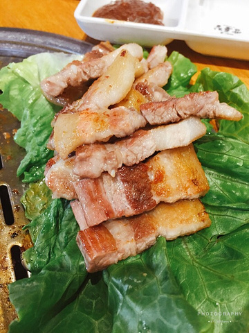 位于中华城北区三楼,店面装修是韩式风格,玻璃上面写着韩文,墙壁上面也是满满的韩文,还有最可爱的布朗熊宝宝,超萌的熊宝宝也到处可以看到。每个位置都有独立的吸油烟机,还有一个小凳子可以放包,湿纸巾,手套,还是很贴心的。 韩式烤肉 每桌都有专门的服务员帮忙烤肉,烤得很专业,看着摆盘都觉得超有食欲的。 最爱五花肉每次必点 厚实的五花肉整块下去烤,烤得有点点焦嫩,把油脂都逼出来,喜欢夹着一片泡菜,包着生菜一起吃,回味无穷。 护心肉 这款肉看起来有点点黑,但是吃起来超嫩的,非常有嚼劲。 掌中宝 这款吃起来口感脆脆的,小小块很入味。 主食 石锅拌饭 最爱吃饭里面的锅巴,味道香浓,拌均匀看起来很不错。
