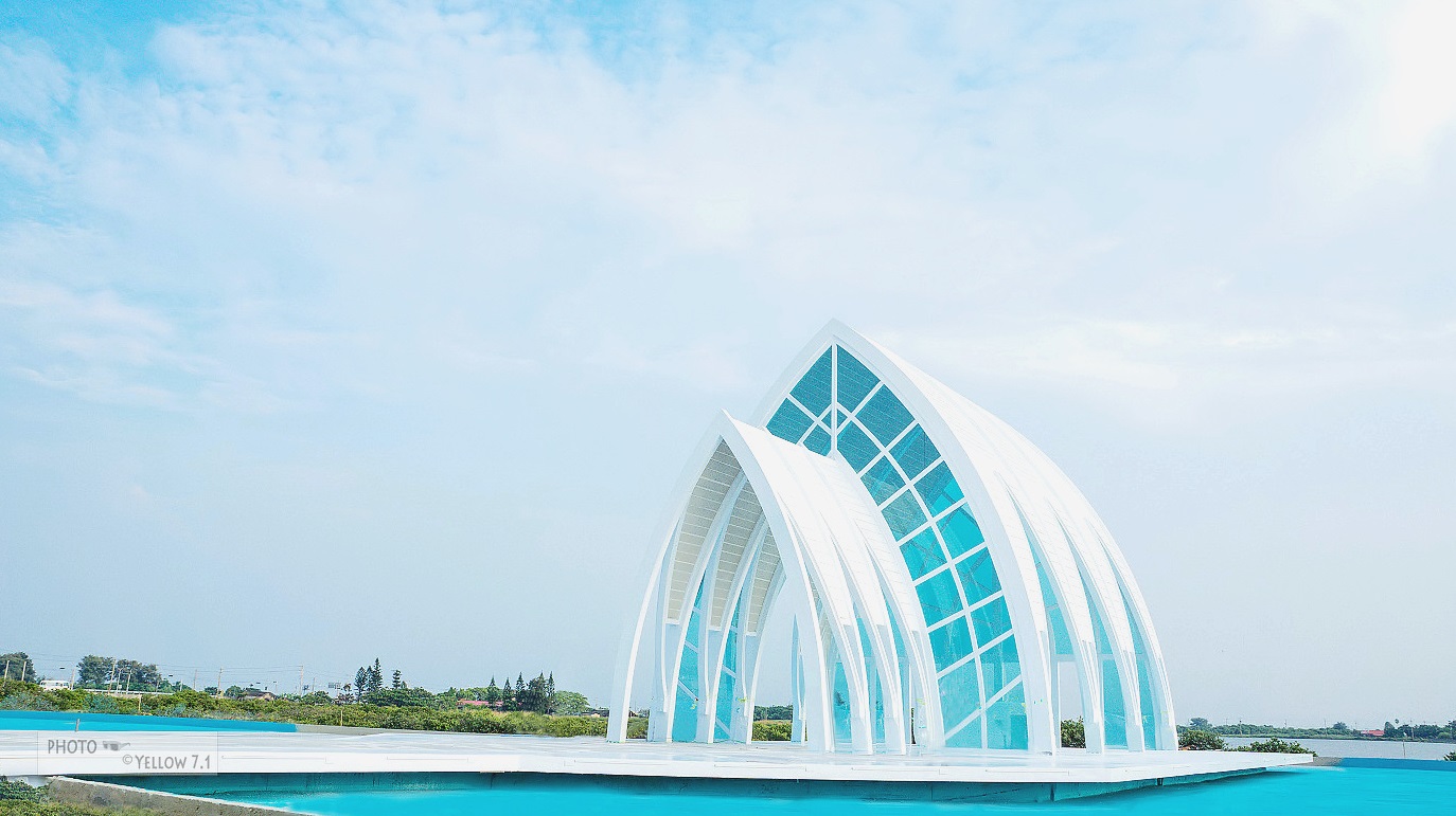北门水晶教堂,以盐田湿地为背景(跟上面的七股盐山不是一个区喔)半开放式白色钢骨建筑镶上水晶玻璃...