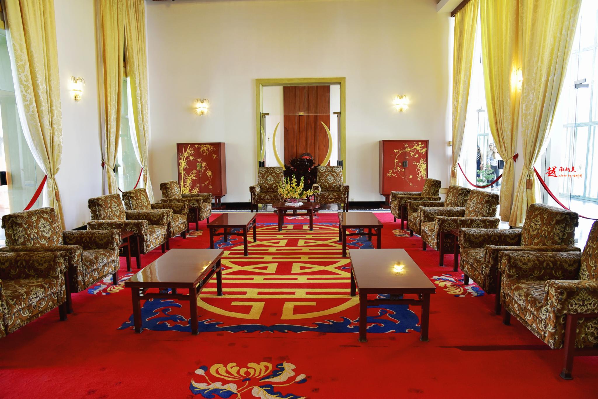 从胡志明市我们所住的育王饭店出发步行20分钟就到了统一宫(Dinh Doc Lap)。统一宫恢宏大气,宫前有很大一个草坪,很适合拍照哦,这里取景也是棒棒的。统一宫最初是法国驻越南南部的总督府,后为了以示越南摆脱了法国的殖民统治重新独立,越南政府将其改名“独立宫”,随着越南南北两越的统一,“独立宫”被改名为“统一宫”,作为越南人民争取民族独立和国家统一的象征。门票30000 越南盾,差不多相当于人民币10元钱了,门口安检非常严格哦,所以尽量少带包。统一宫是庞大的四层白色建筑,大厦内是很多个装饰华美,富丽堂皇的大小厅堂,主要是总统办公室、内阁会议室、外交大厅等,主要就是看看建筑和陈设,整个建筑精致的格局,清新的格调,色彩艳丽的地毯等以及统一宫外停放的昔日攻占南越的坦克,都讲述着南越的兴亡史,还是很值得去看看的,有中文导游哦,有兴趣的可以请个。