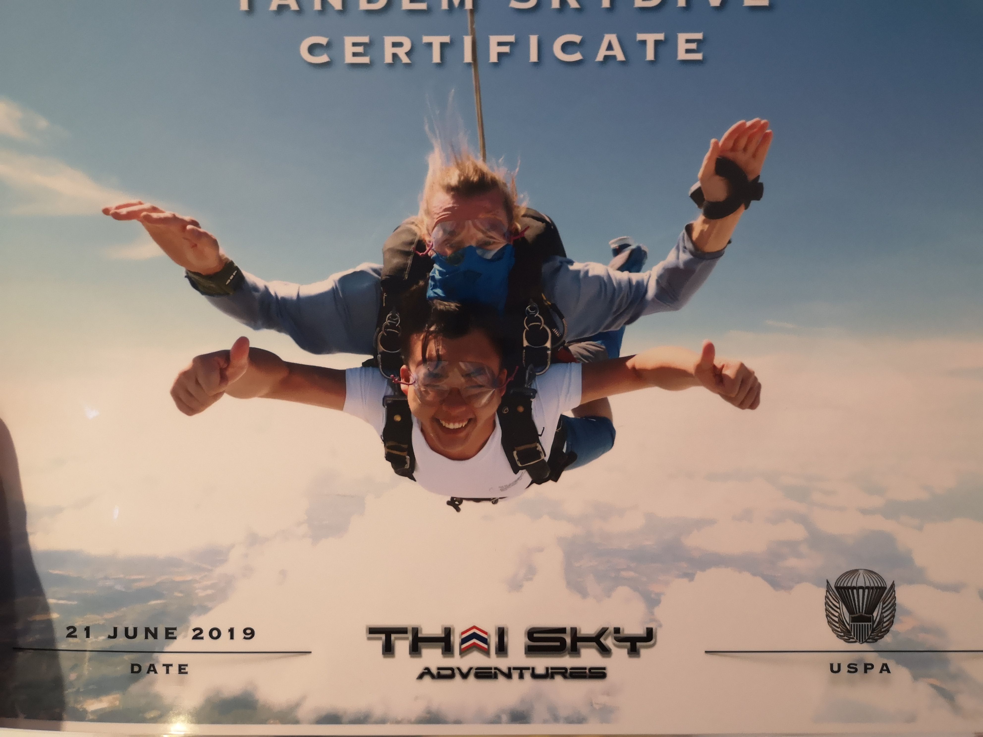 跳伞是我去泰国的必玩项目!第一次体验,感觉超级棒。跳完一直兴奋,还想再玩一次。从接到送都有安排车,来回坐车程一共一个多小时,到那里了还需要排队等候,我们一行六人分了三波跳完。得留出半天的时间。要是运气不好,遇到天气原因,估计得凉凉。最好选早一点去跳,人少一点,排队等候时间短,而且还不晒。还可以自己选择要不要视频照片什么的。分摄像师跟拍和手拍,我觉得手拍没什么必要,拍出来不一定好看的。拷贝视频和照片如果你不是iphone我还是建议自带硬盘吧。最好再带个塑料袋,同行的人回来的路上你懂的,以防万一。希望大家都能分到一个帅帅的教练。还有热情的摄像。