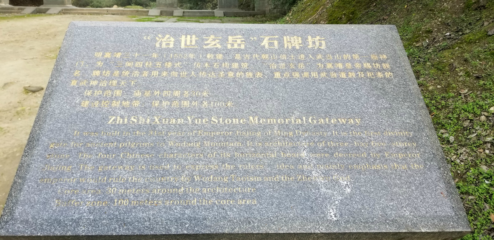 “治世玄岳”牌坊建于明嘉靖三十一年(公元l 552年)。位于湖北丹江口市武当山镇东4000米处,为进入武当山的第一道门户,又名玄岳门。全国重点文物保护单位之一。1994年,作为武当山古建筑群的重要组成部分,被联合国教科文组织列为世界文化遗产。