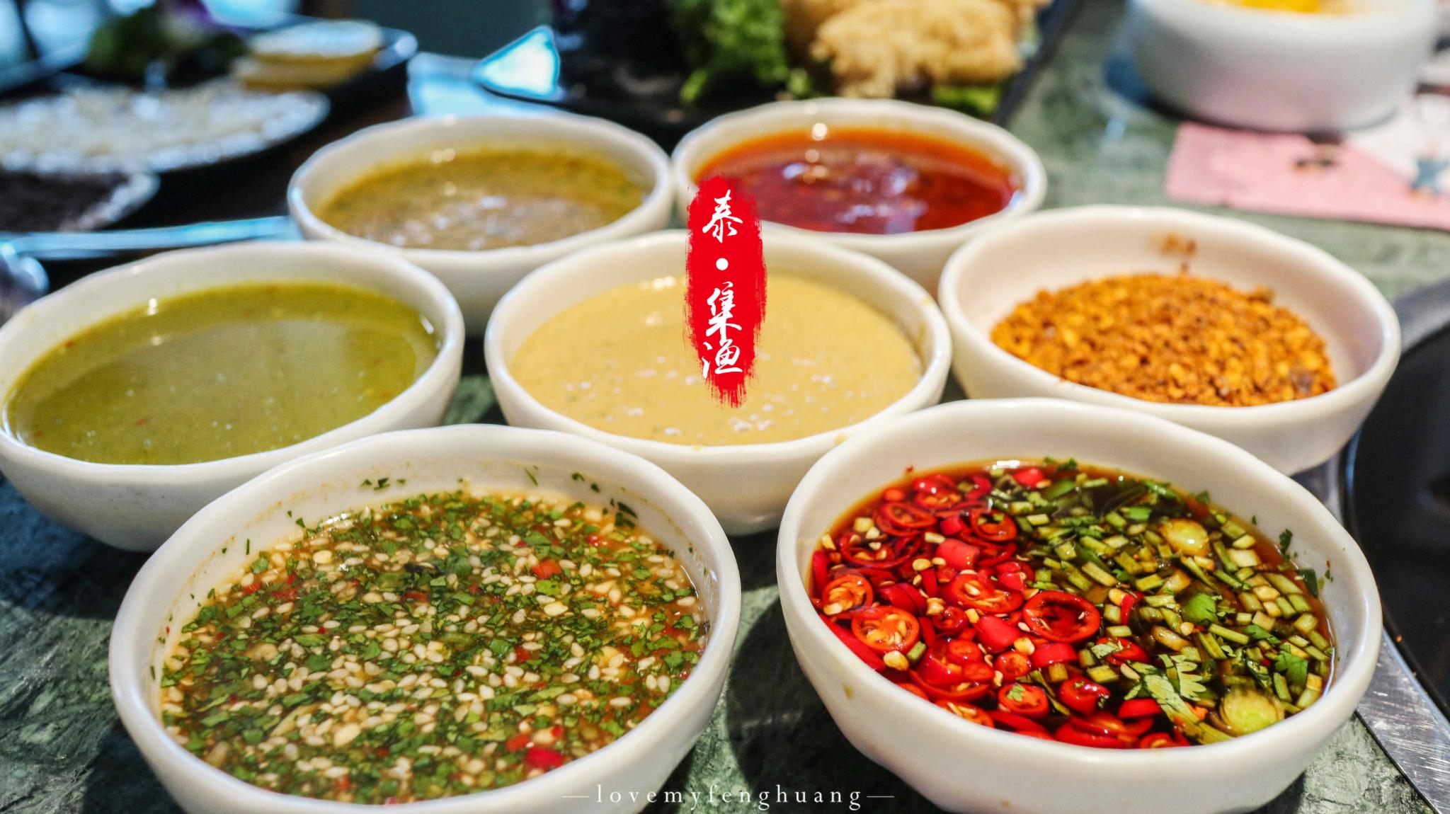 【蘸碟】调料丰富,经典泰式、招牌柠檬薄荷、香辣海鲜、秘制川香小米辣、川香干碟、浓香花生酱、泰式青酱。比较有特色经典泰式,有股孜然味道;招牌柠檬薄荷,淡淡的薄荷香,很清新;泰式青酱也好吃,但这三个调料都是辣味的,喜欢吃清淡的建议花生酱、香辣海鲜。