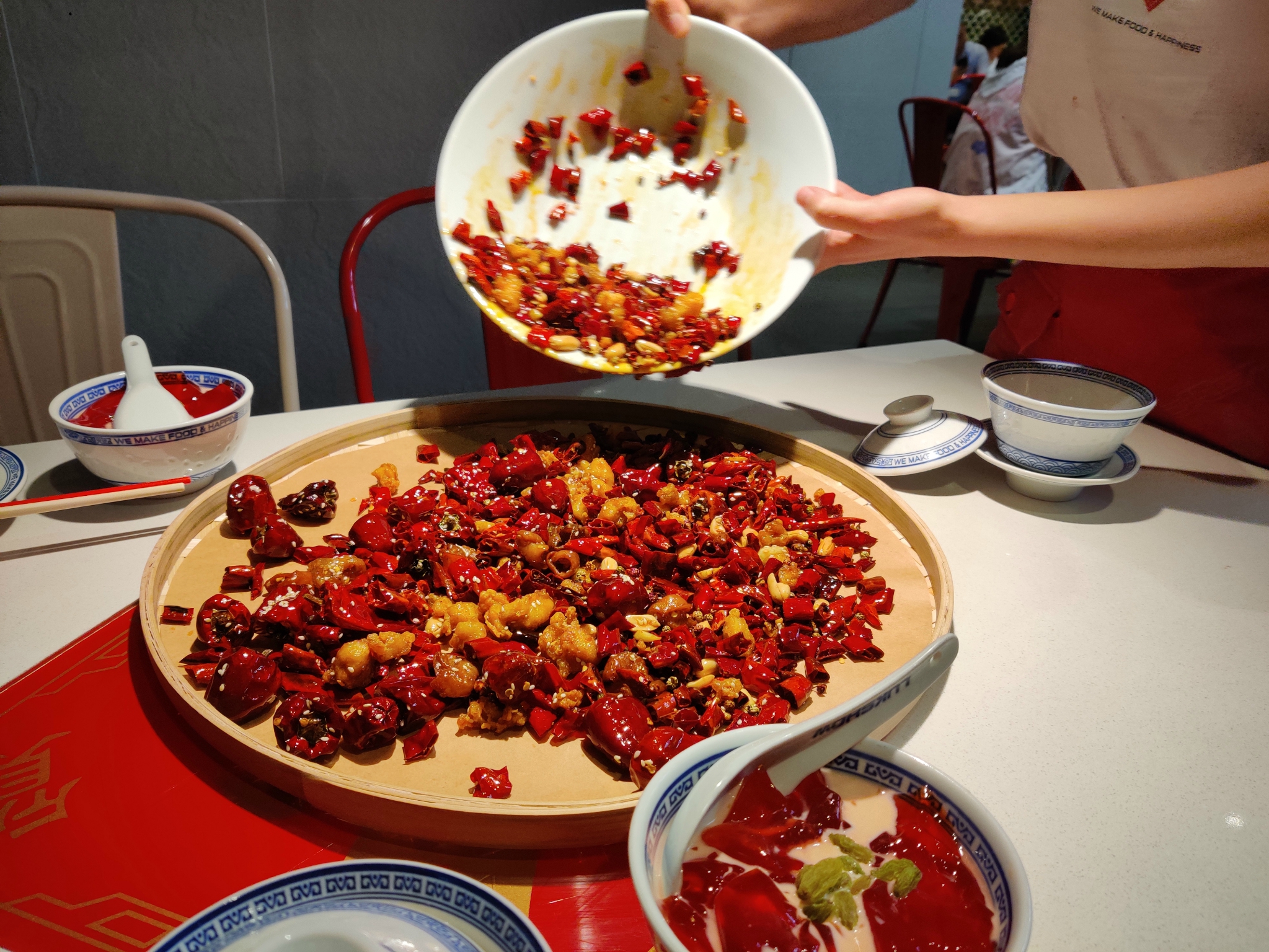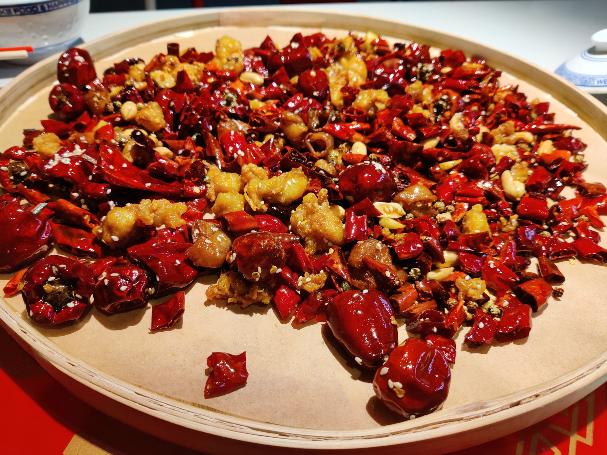 【发财肥肠辣子鸡】很特别,是一大盆上来,然后倒在有个大盘子上,辣椒超多,鸡比较少,鸡肉炸得太过了,没有肉感肉味,不是很辣,偏咸,没有牛蛙好吃