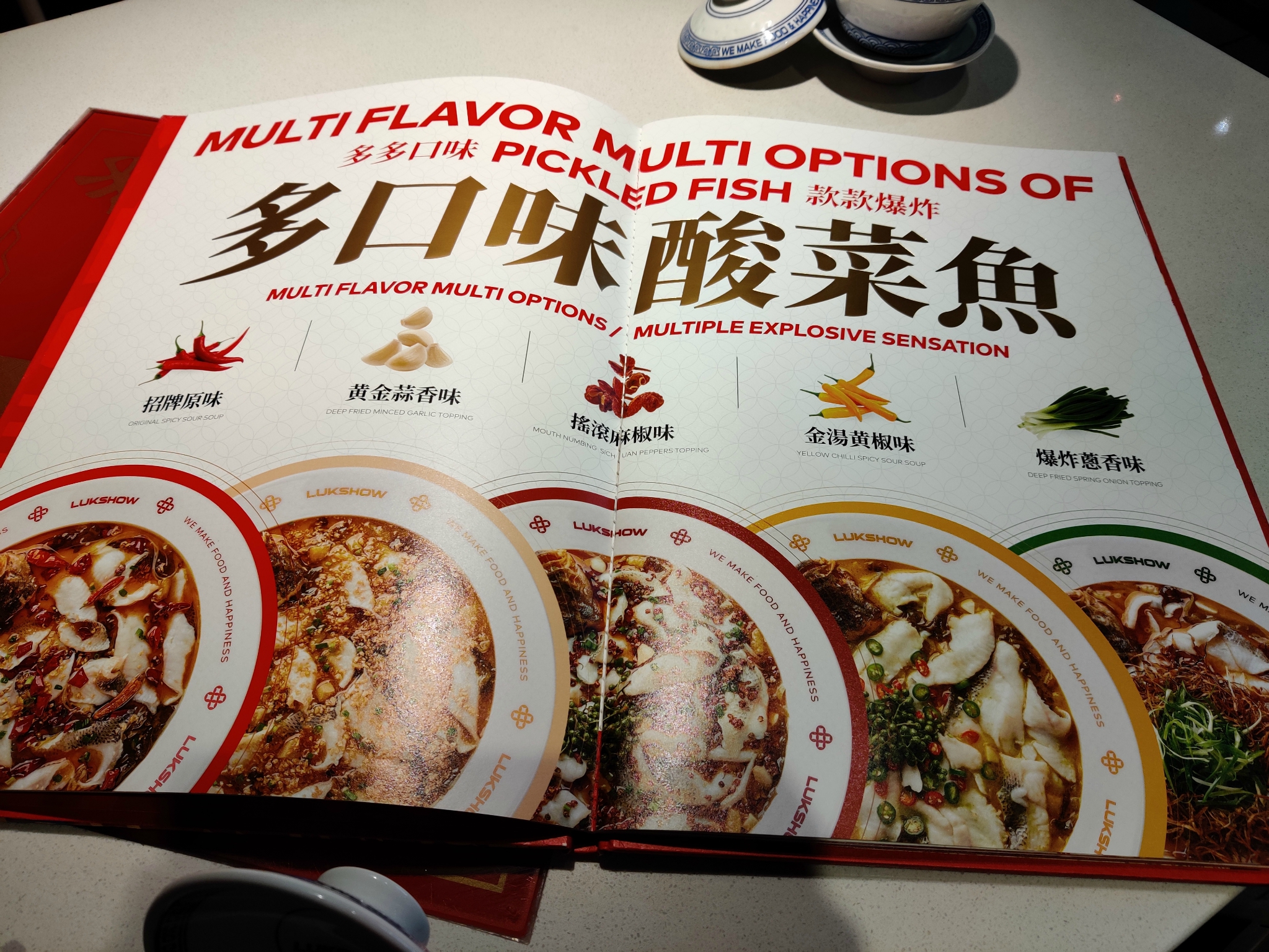 新出几款酸菜鱼,有原来的招牌原味,新增黄金蒜香、摇滚麻椒、金汤黄椒、爆炸葱香,有不辣、微辣、超辣品种,终于多了选择