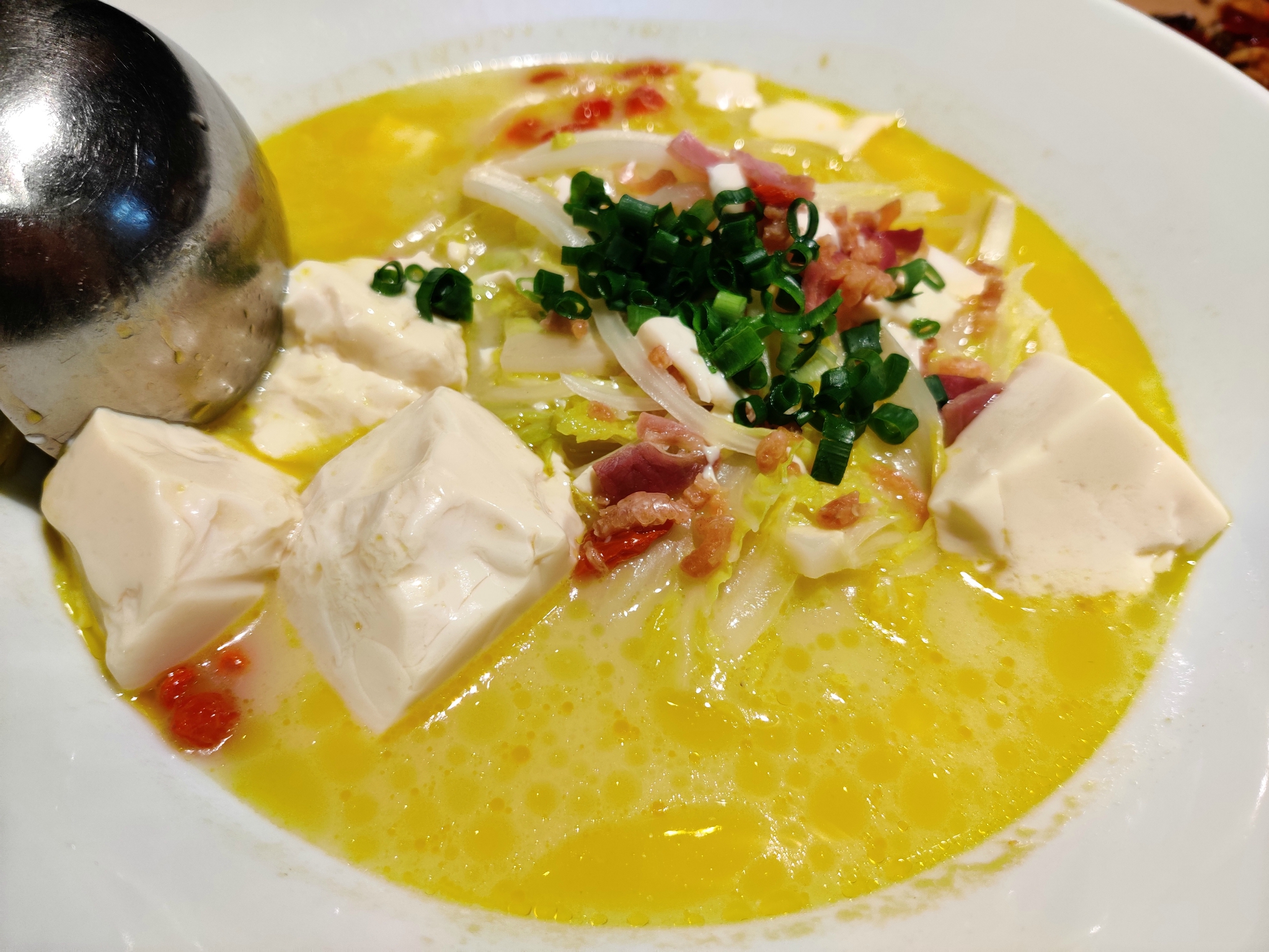 【高压浓汤豆腐白菜】比之前的娃娃菜汤浓一点,但味道还是偏淡,菜切得很薄很小,吃起来就没有那么多汁,分量挺大