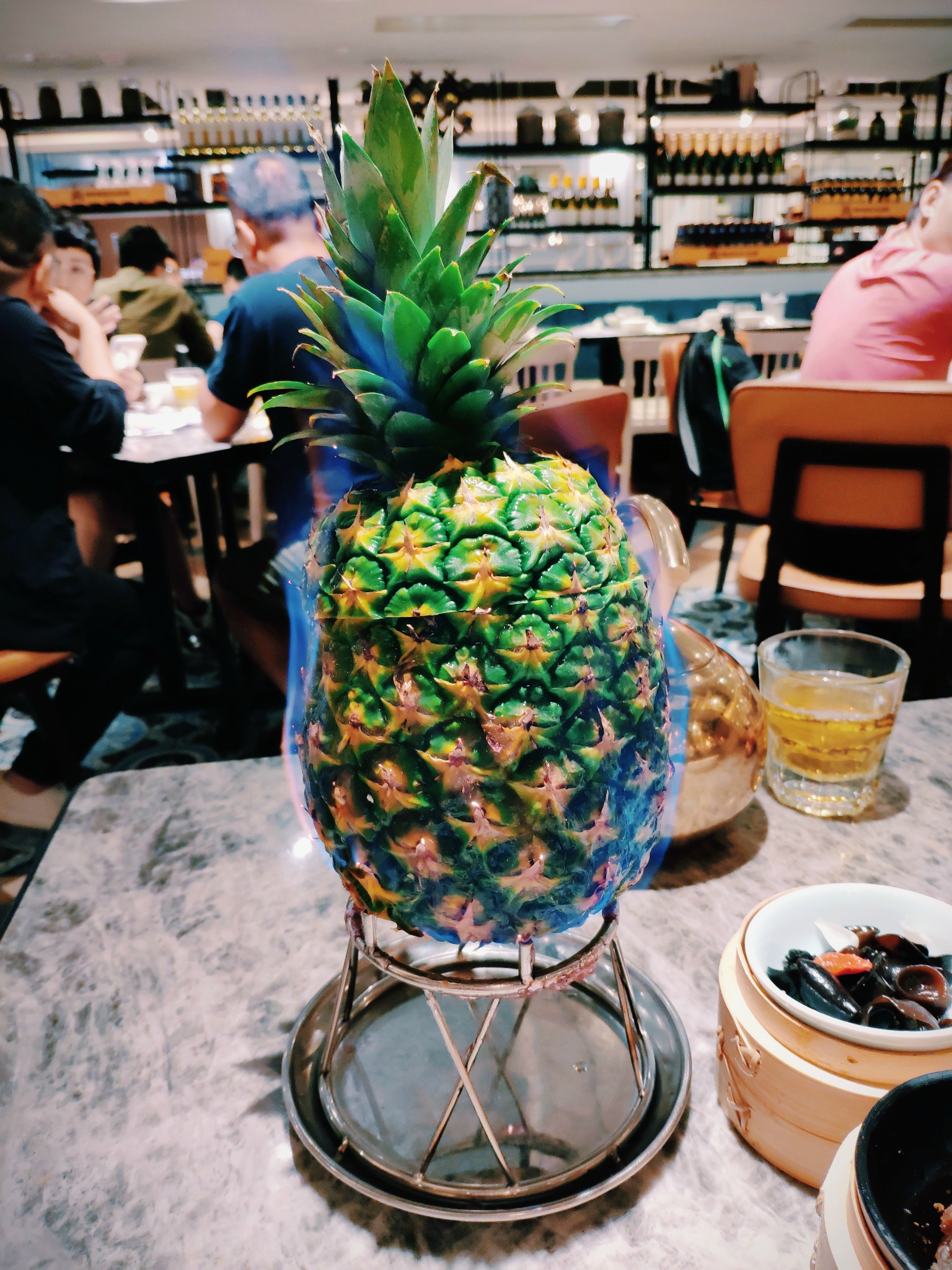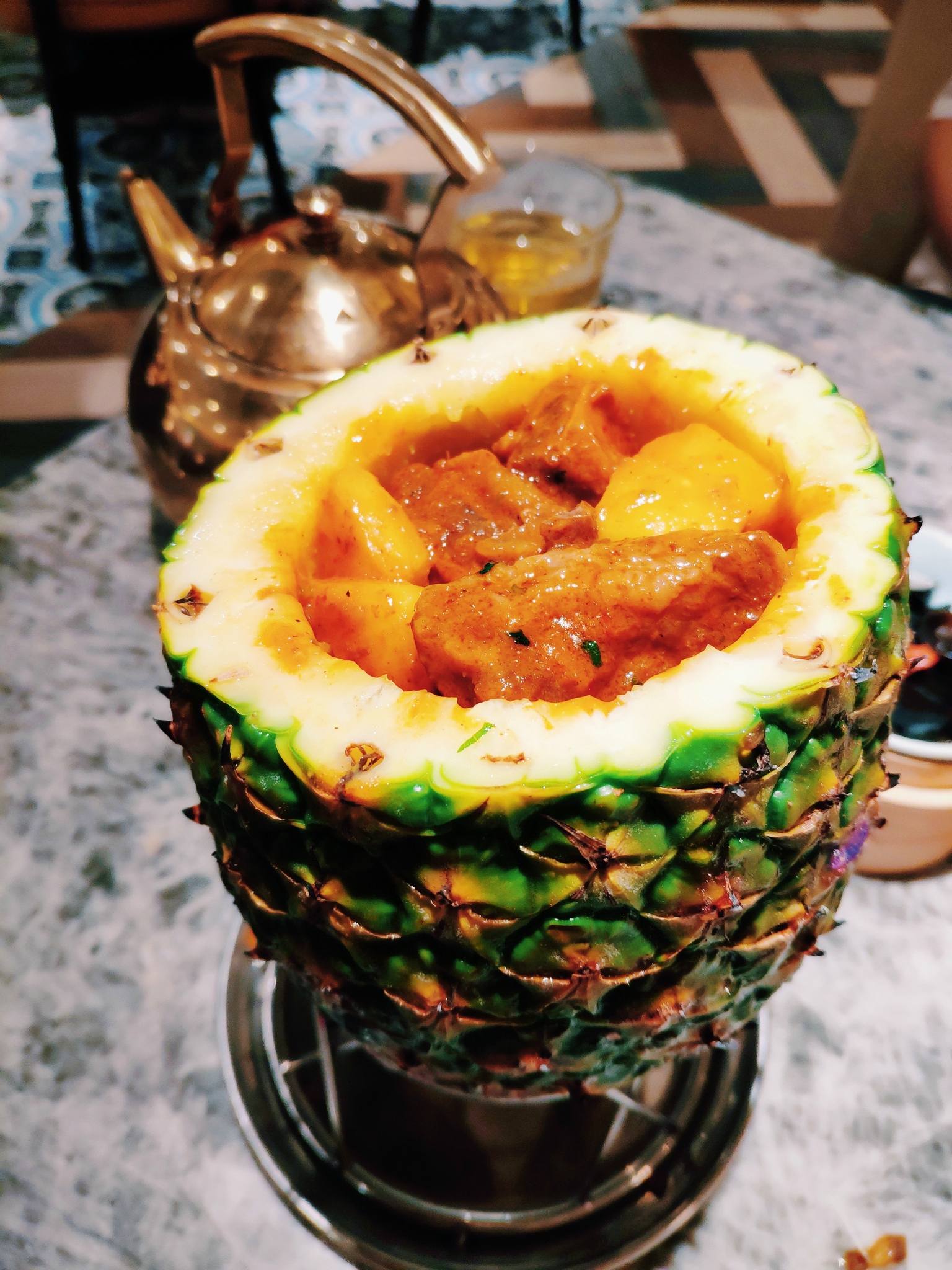 「火焰菠蘿」一百多快的菜价也是有点肉疼……不过看在是招牌菜的份上,剁手也要尝鲜~点火开盖的过程充满仪式感,里面满满的菠萝、肉块儿,有种在淘宝的惊喜~口味酸甜可口,非常特别~虽然价格略贵,但也算值得~