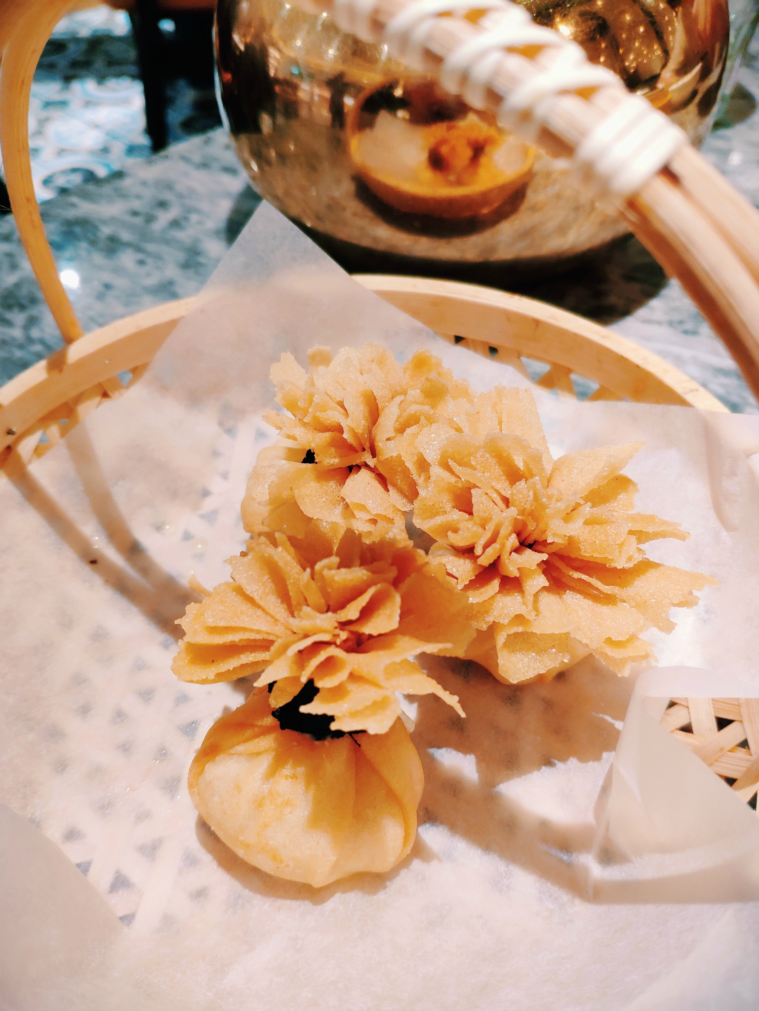「脆虾云吞」很新奇的做法,竟然是满满的芝士鲜虾馅儿~颜值超高,捏的像一朵花~但是也好油腻……喜欢芝士的可以点下尝尝,不然不推荐哦~