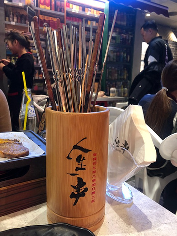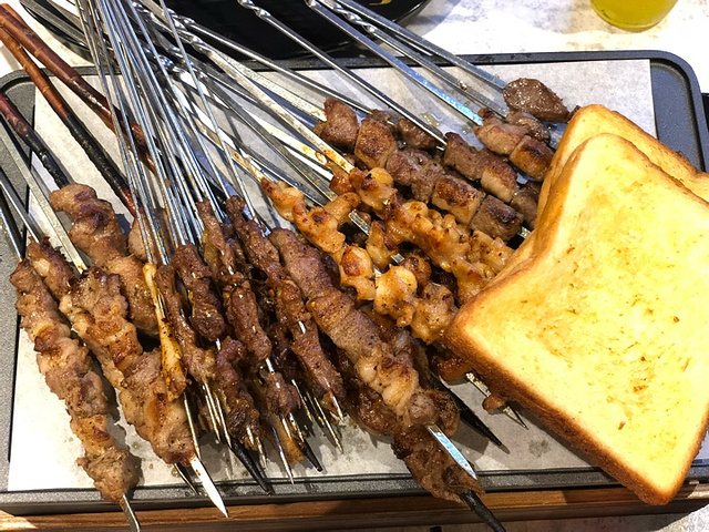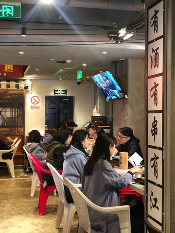 真的很火的一家店,为了不排队很早就来了。 装修风格是简洁工业风夹杂香港市井风,有很浓郁的港片即视感,还有80后的童年回忆游戏机。 上来二话不说就开点,各种特色串串来一波,上菜很快,怕冷掉每个桌子上还配一个暖暖的铁板烧。 猪鼻筋一把,这个是特色,很有嚼劲,吧唧吧唧就吃完了 ,非常弹牙。 岳阳的牛油小串真的很喜欢,一点也不腻,有点点入口即化的感觉,烤的焦香四溢,一点都不油腻,只剩下牛油的鲜香,一口咬下,牛油在口中炸开,赞~不够吃呀不够吃~ 云南昭通小串,整整一把,肉很香,特别好吃,唯一的遗憾就是每串的份量很少,不愧为小串。因为很小,所以调料入味,肉质紧实细腻。 红柳羊肉串真的很良心,好大一串,肉质细腻而且肥瘦相间,吃起来多汁丰富;内蒙羊肉串也不甘示弱,羊味足,带劲~ 干豆腐卷,我们点的唯一蔬菜。豆腐皮表面烤的稍稍带点焦味,包裹在内的蔬菜汁水丰富,鲜嫩无比,火候把握的恰到好处。 烤黄油面包片一人一片,这个真的推荐,又软又脆又香,而且不像普通的面包片淡而无味,烤的很有特色的,黄油放的恰到好处,在烤炙过程中,黄油的香味完全渗透入面包之中。如果不是因为吃撑了可能会加点的! 掌中宝和鸡胗都很好吃,嚼嚼更香,掌中宝算是每家烧烤店都会有的菜品,这里也能做的特别好吃,一口咬下,咯吱咯吱地作响~ 味道总体都是好吃的,而且一点也不腻味,吃多了不觉得咸,保留了食材本身的味道,火候和调料都是恰到好处,吃完走的时候还是很多人。 总而言之,这算是烧烤的宝地了,一网打尽天南地北的所有烧烤。在一家店就可以吃到所有特色菜品,值得再去。