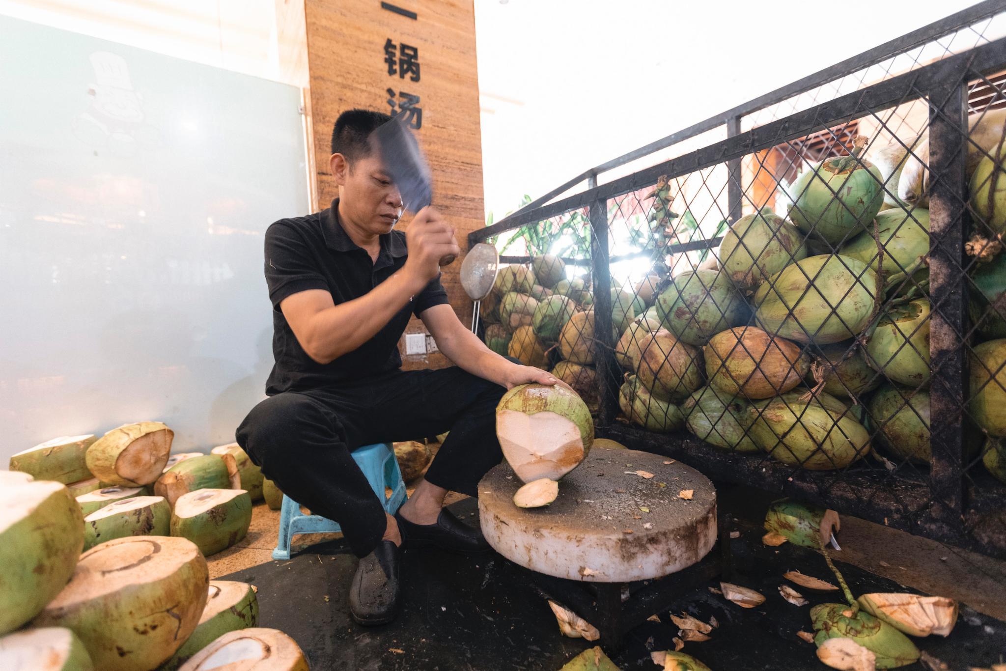 椰子鸡的底汤完全是食材新鲜采摘砍制的椰子,每一颗椰子,都是在店门口现场砍制的。